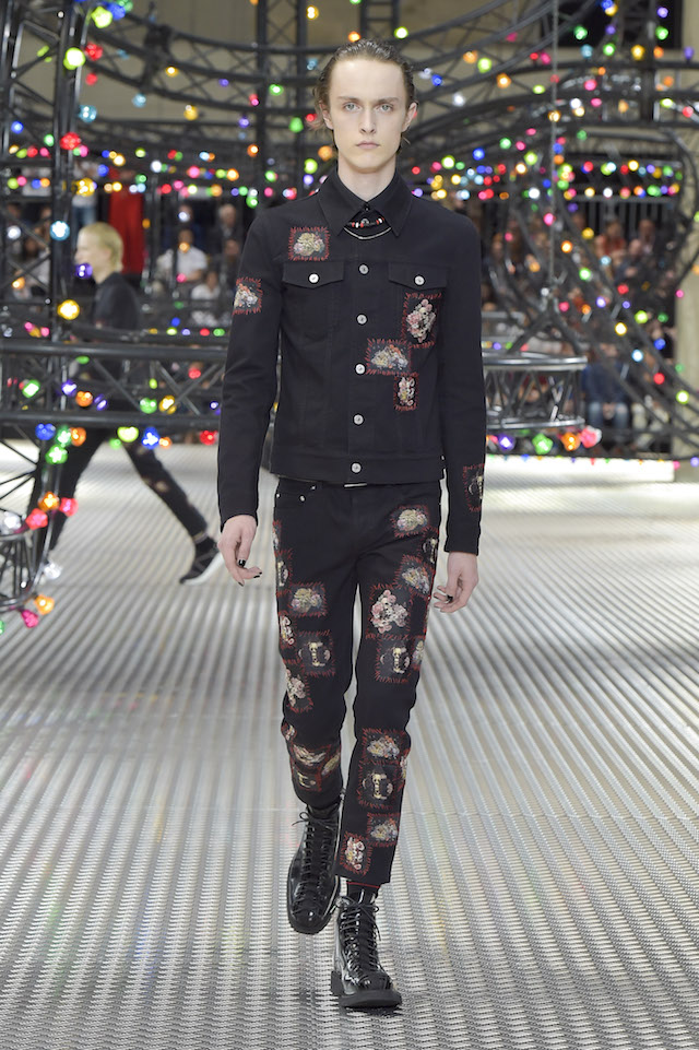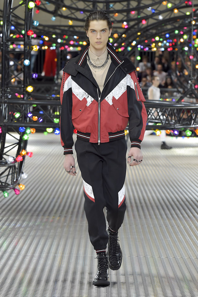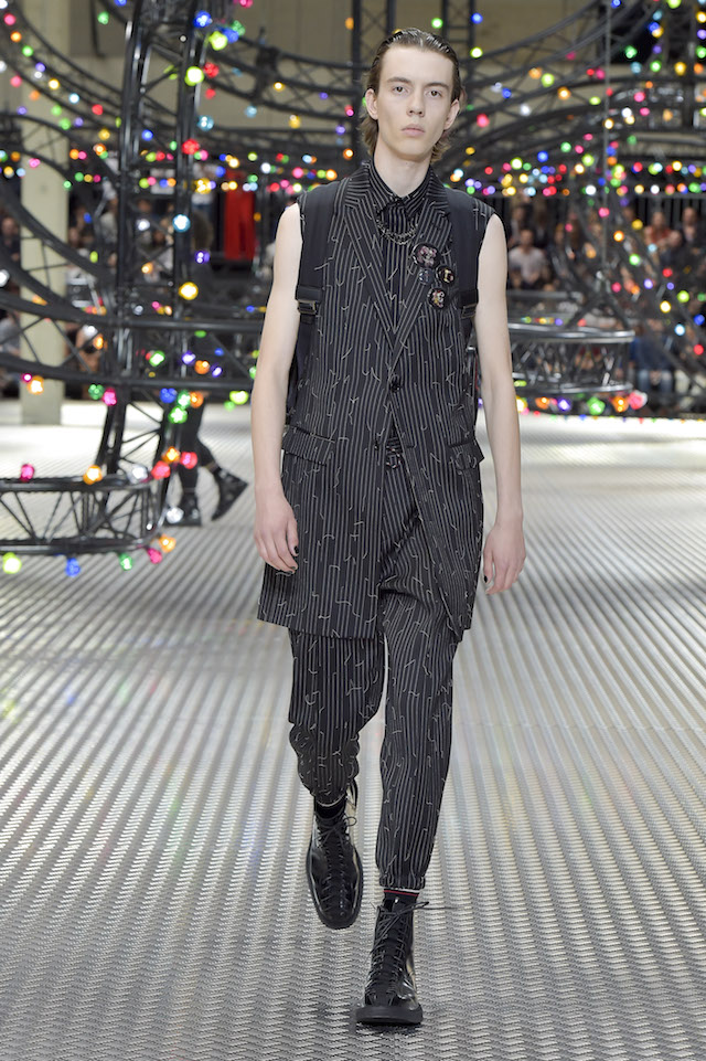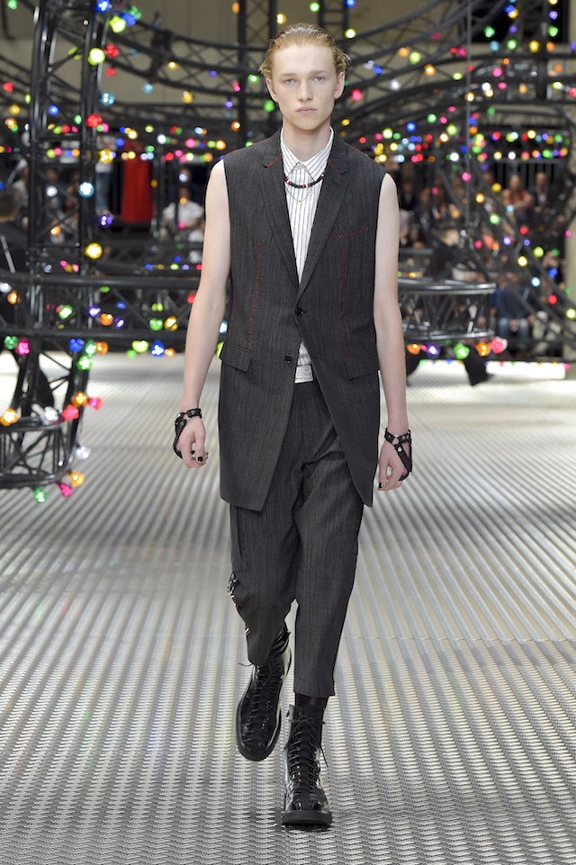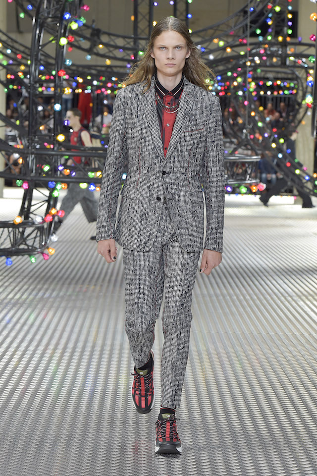 80年代のロンドンにて一斉を風靡したナイトクラブ「The Haçienda (ハシエンダ)」に集う若者達のエネルギーをインスピレーションにした今回のコレクションにて、ファーストルックで登場したのは、2ボタンのテーラリングスーツ。ジャケットのスリーブには、赤と白のストライプが取り付けられているほか、中に合わせたブロックチェックのシャツ、スパイクネックレス、そしてエンジニアブーツからブラックに彩られたネイルに至るまで、2016年ウィンターコレクションに引き続きエッジの効いたパンクスタイルを感じさせるスタイリングが目を引く。