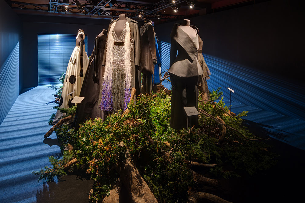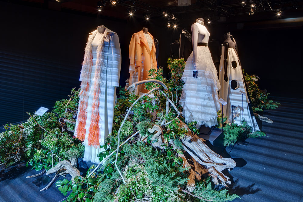 会場は大きく4つのパートに分けられており、まず来場者を迎えたのが Givenchy のエンブレムが輝く灯篭と満開の桜で飾られたロビー。そのまま歩みを進めるとお目見えしたのが、サロンにずらっと並んだ Clare Waight Keller によるクチュールのデビューコレクションだ。日本とフランスが誇る最高水準のクラフツマンシップを尊ぶ伝統に焦点を当て、贅の限りを尽くした11体のクチュール作品が展示される様子は、まさに圧巻。月明かりの雰囲気が演出された空間の中、「Mysteries of a Night Garden (夜の庭園の神秘)」と題されたコレクションは、神々しさを纏った幻想的な輝きを放っていた。