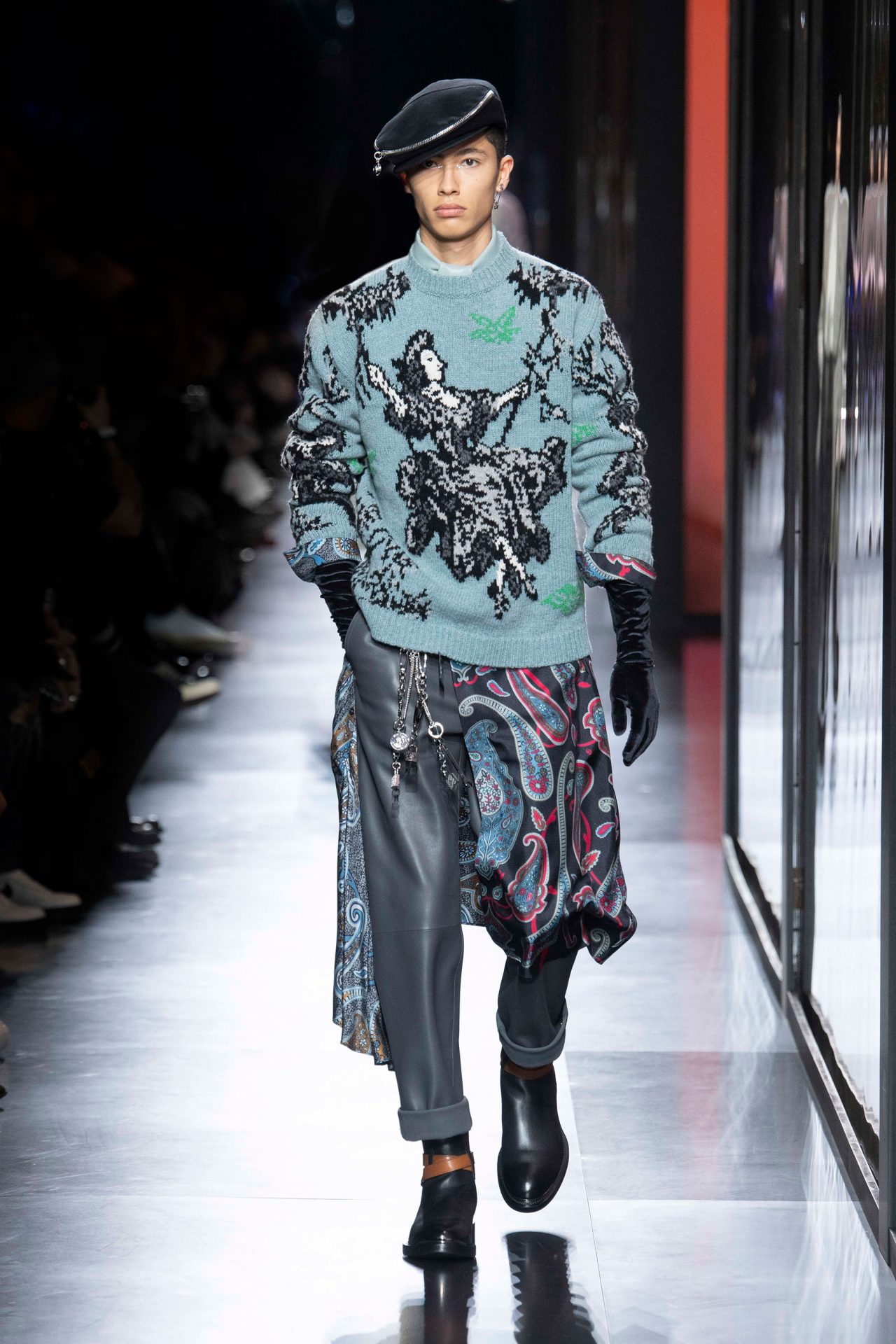 G: Jonathan Anderson (ジョナサン・アンダーソン) が提案するメンズのスカートは彼の定番ですけど、今季の Loewe はスカートを超えてドレスの域。でもこれ、首元を見たらエプロンなんですよね、面白い。ニットにはビジューがついている。