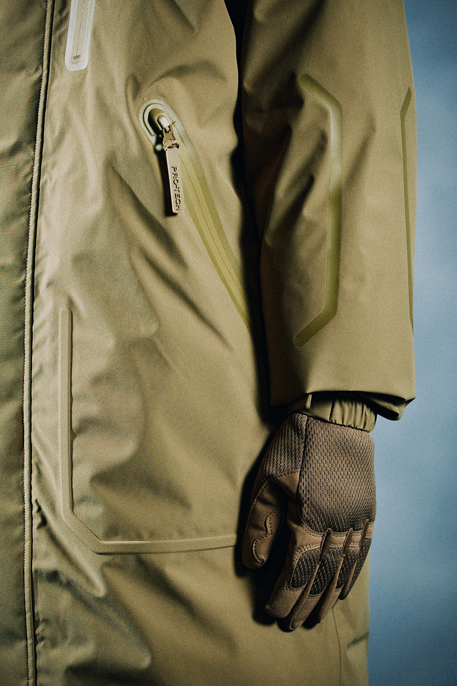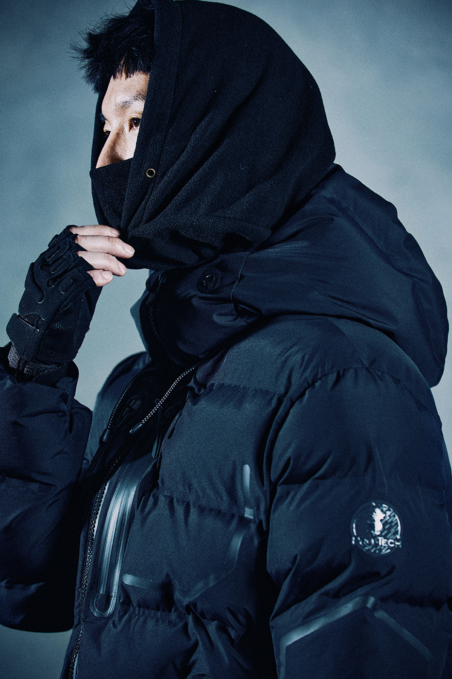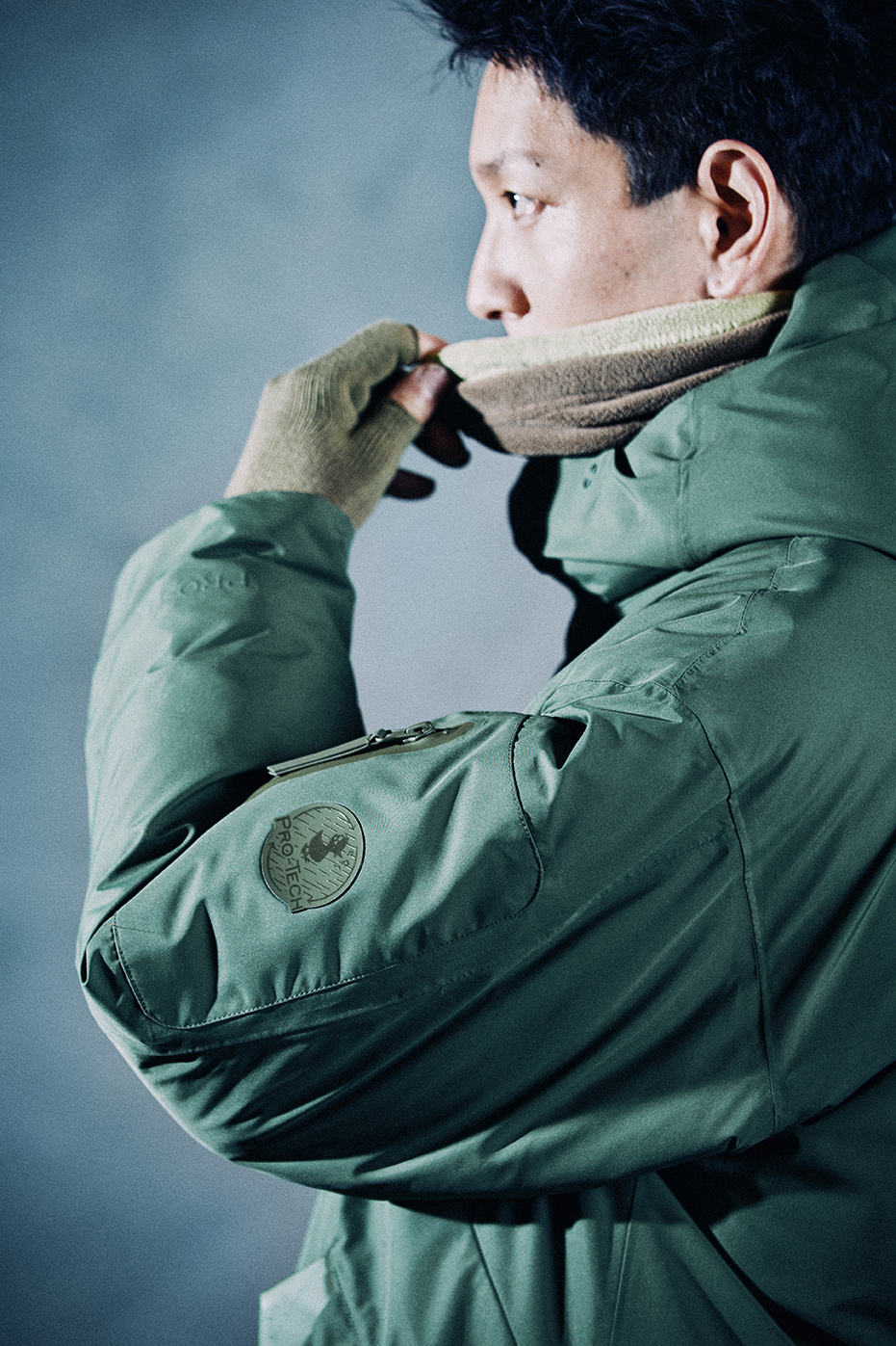 まず、これは Nicolas からのオーダーもあり、ブランドのシグネチャーであるフードの仕様は受け継いでいます。 SAVE THE DUCK のフードは、ジップを開かないとかぶれない。しっかりと格納された仕様です。でも、だからこそ、ジップを閉じた状態のシルエットが保たれ、首回りの保温性が高まります。この仕様はテクニックとしてもおもしろい。それに、アウターの左腕についているロゴを残したり、あえて「PRO-TECH」マークをポイントで入れたり。これもこだわりの一つです。
