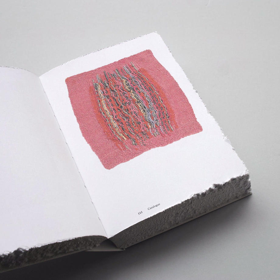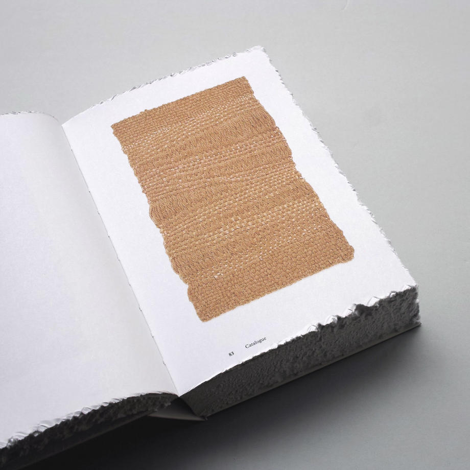 中島: フェルトみたいな羊毛のような質感になっているんですけど、そこがさっき少し話した読書体験を伴うことで、情報以上のものが伝わる表現だなと。実際に中を見てもらうとテキスタイルを使った作品が淡々と並んでいるんですけど、この本のデザイン自体がなんかもう作家の表現の特徴を表しているというか。