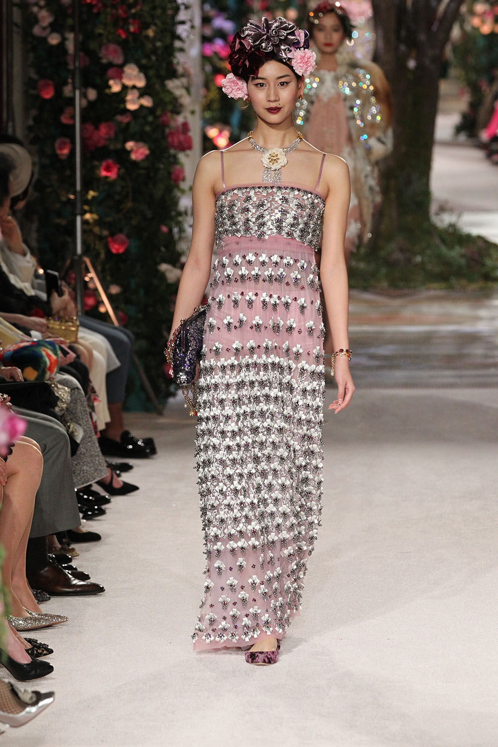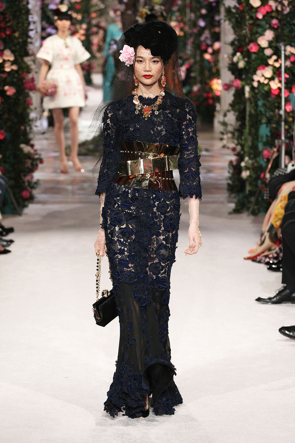 Resting confidently on traditionally feminine themes, the collection’s floral expositions were fitting surroundings for the people who buy Alta Moda. When asked about his customers out here in Japan, Gabbana answered: ”We don’t know everything about Japan but we’ve learned a lot during thirty years, and we know the taste of the Japanese woman. They love pastels, they love pink, they love flowers. It’s not so different from other countries. Women love flowers.” Judging by the guests’ outfits, he was dead right. The Alta Moda crowd is perhaps a culture in itself: dressed to the nines in all manner of spangling evening wear, the show attracted a glitterati of established domestic clients that were paying their own homage right back to the brand. Anna dello Russo was there in a sequinned silver gown adorned in florals, as well as Japanese influencers including socialite and designer Mademoiselle Yulia, the actress Mao Daichi, and longtime Dolce & Gabbana client Eriko Yagi. All of their outfits were, somehow or another, splendidly ornamented with flowers.