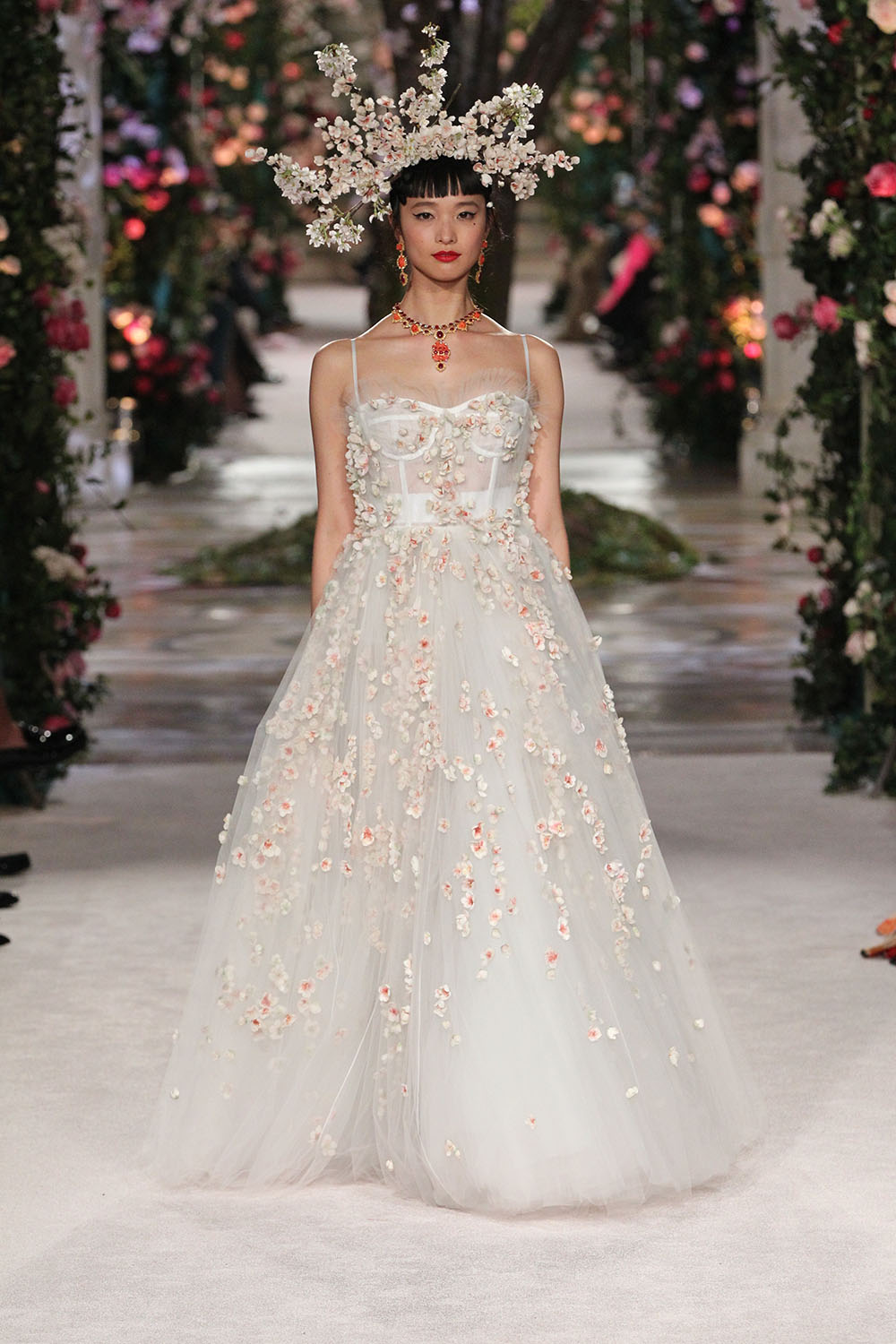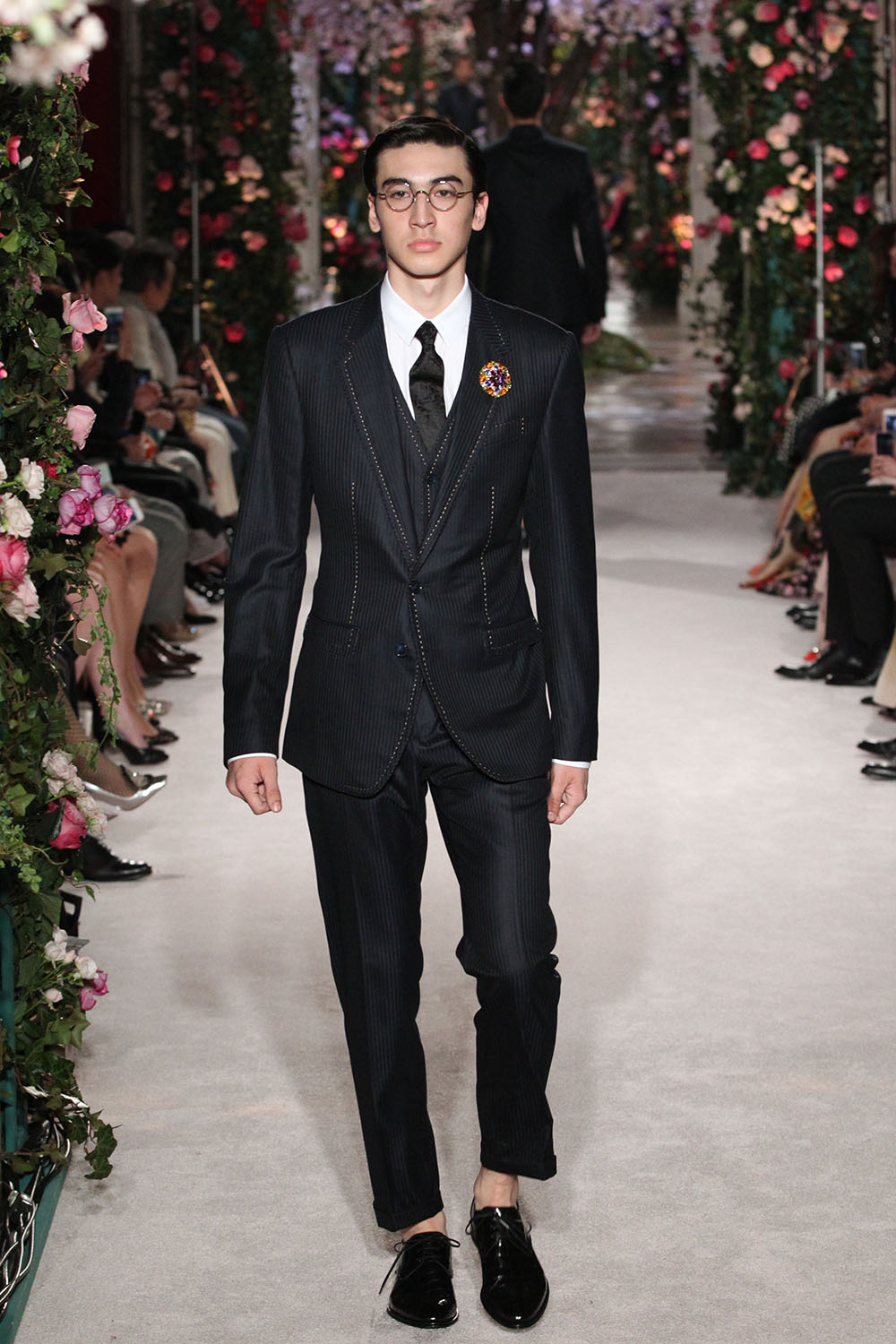 This homage and appreciation extended beyond the clothes – the entrance to the museum was flooded with pink light to enhance the sakura inside and outside, and in contrast to many in-country couture shows, the models themselves were almost entirely Japanese. Yuka Mannami opened the womenswear section of the show, her head topped with a fanned crown of blossoming cherry tree branches, the petals of which looked to have fallen in gorgeous trails across her tulle gown. Lace frocks and sumptuous silk dresses were emblazoned with delicate floral prints, studded with fallen petals, wrapped in fur, and dripped with sparkling embellishments of thousands of intricately-embroidered beads and sequins. The brand’s menswear couture, known as Alta Sartoria, appeared first, and included high end sportswear like cricket sweaters embroidered with sparkling beads, or silk suiting in rich shades of midnight blue and maroon.
