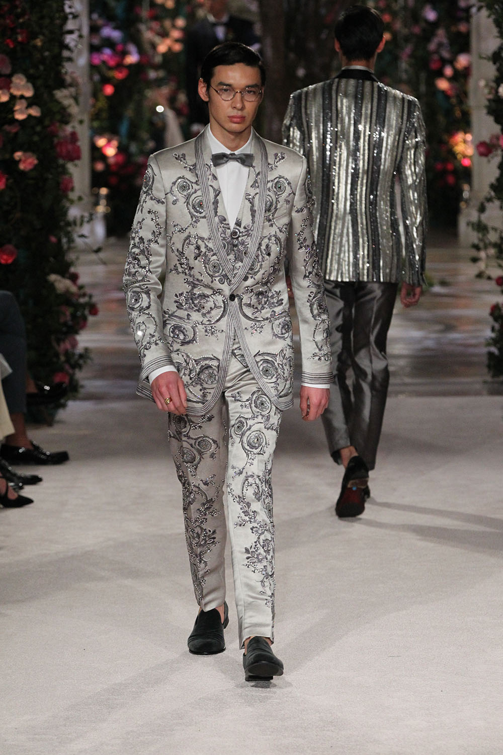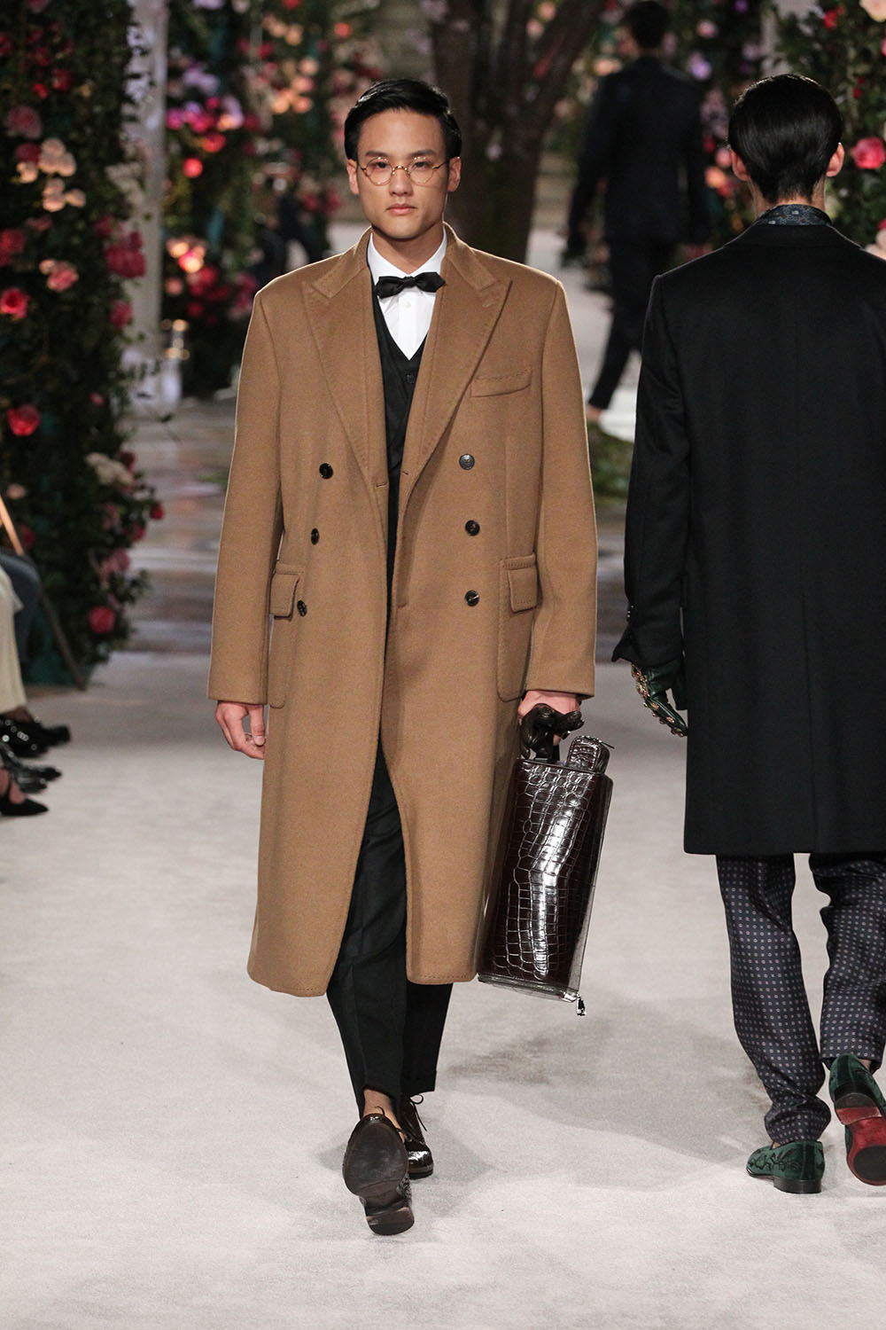 The designers decided to show the mens and womens looks separately, too, in accordance with Japanese social norms. The Alta Sartoria menswear offering preceded the Alta Moda womenswear, but it all culminated with a fairytale bride and groom as Giacomo Puccini’s arias rose and fell on the air. The show’s finale was a wedding gown smattered with pink and white flowers; the model wearing it descended the staircase to take the arm of a crowned prince, suited in white.