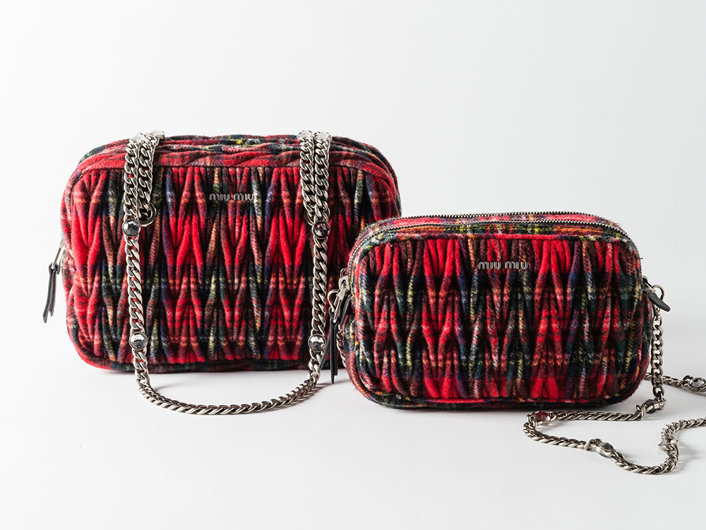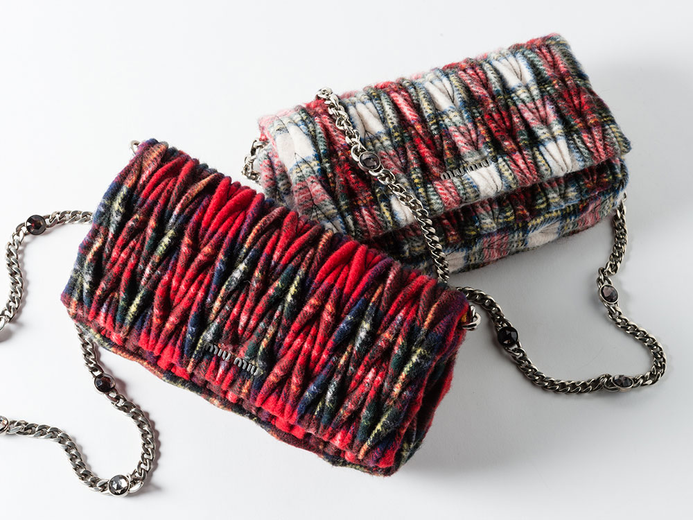 スコットランドの民族衣装であるタータンを用いたキルトや、スポランというウエストバッグからインスピレーションを得て、MIU MIU のアイコニックな「マテラッセ」シリーズがタータンで登場するほか、スポランのボタンやファーディテールを取り入れた遊び心溢れるバッグなど、バリエーション豊富なスタイルが揃う。