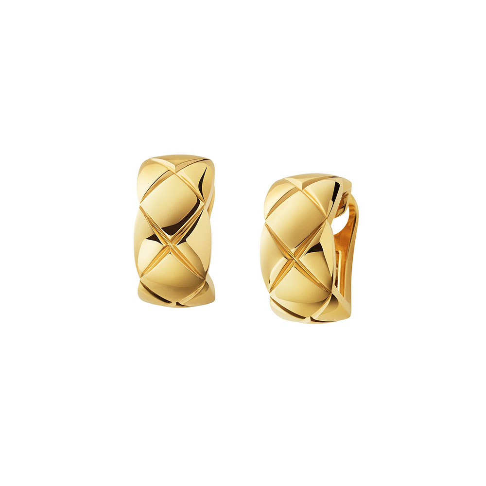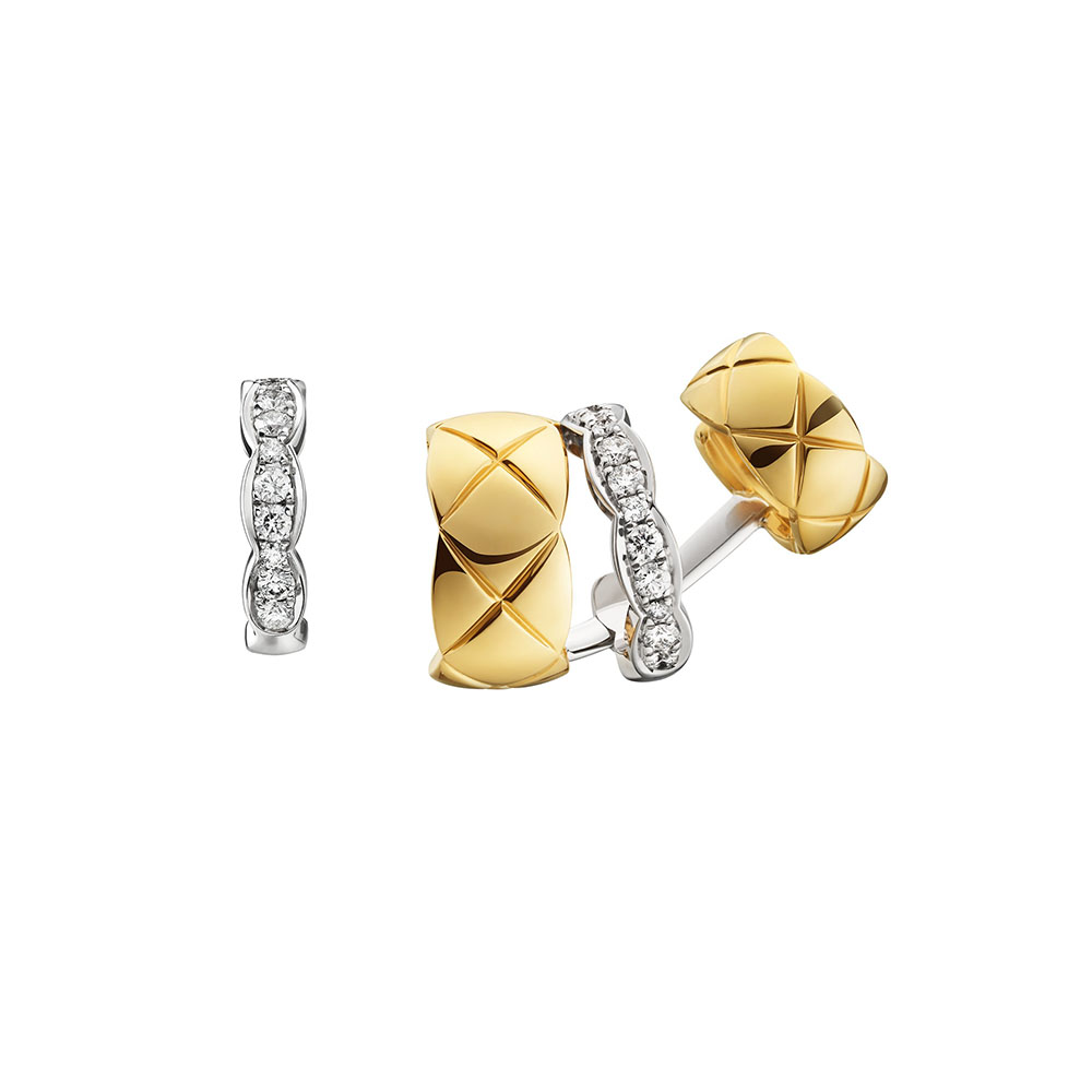ホワイトゴールド、イエローゴールドですでに展開されているパヴェダイヤモンドを配したリングが CHANEL 独自の素材、ベージュゴールドで新登場。また、イエローゴールドとダイヤモンドセッティングが施されたホワイトゴールドのシンプルなイヤリング、3つのリングが連なった遊び心溢れるアシンメトリーなイヤリングや、重ね着けも楽しめるブレスレットも同時に登場。キルティングの存在感とラインはそのままに、洗練を極めたスリムでシックなスタイルに仕上がっている。シンプルなコーディネートはもちろん、これまでの「COCO CRUSH」とのミックスも楽しんで。