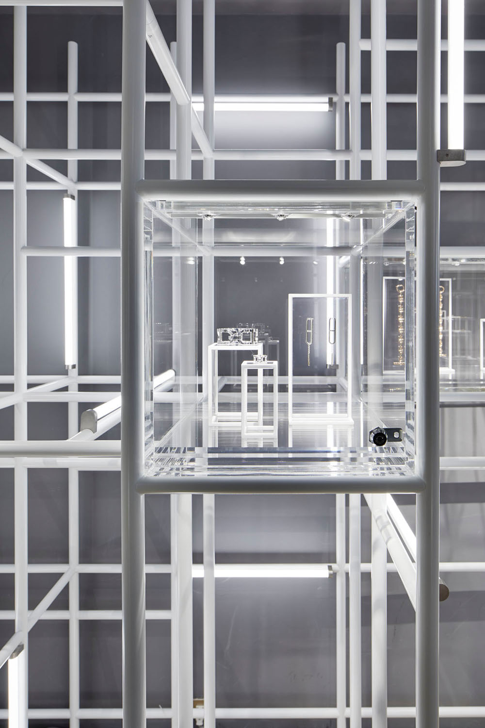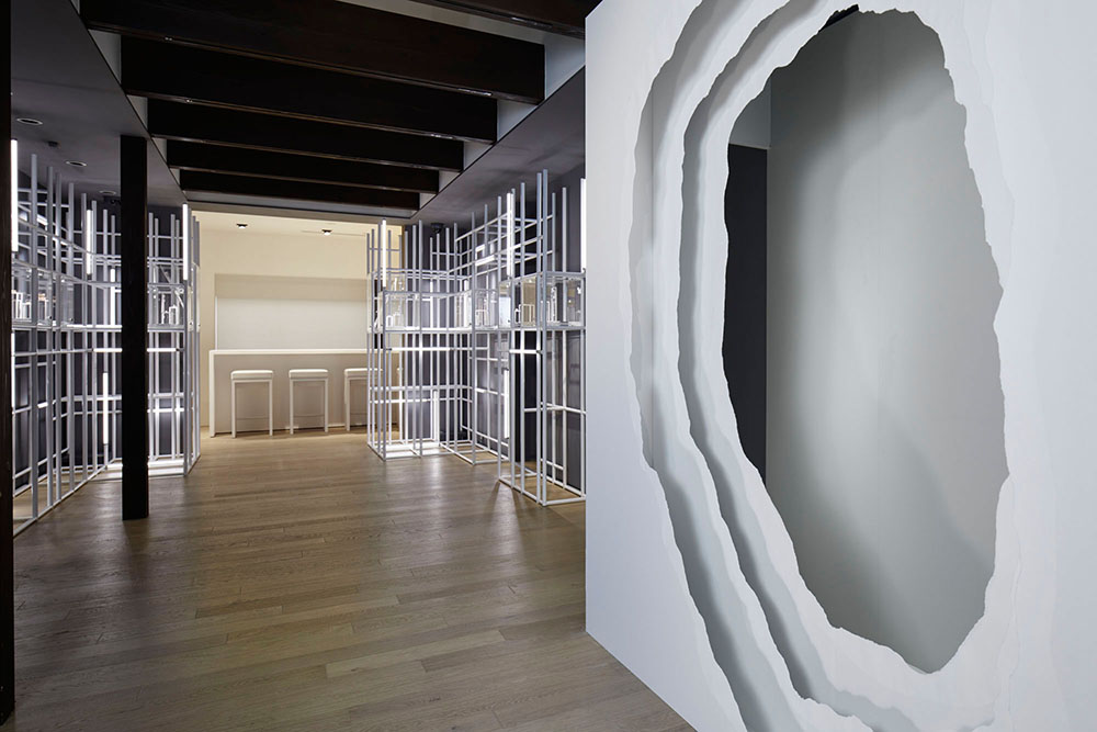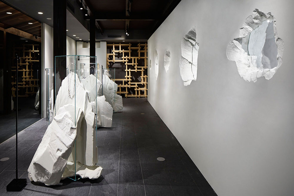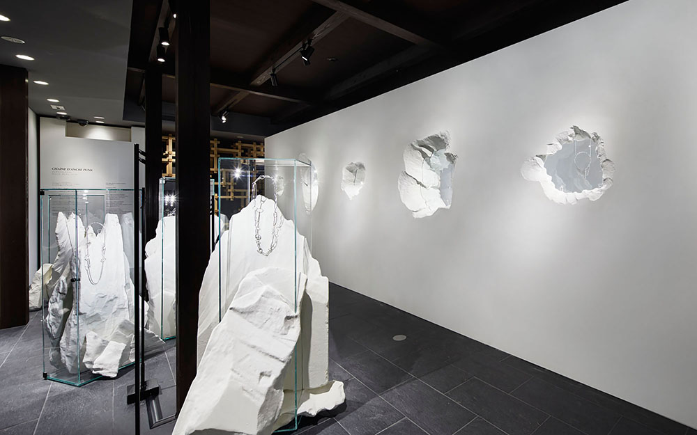 店内は Hermès の解釈するパンクの世界に。伝統破壊の精神を示すかのように、壊された壁とその残骸にはエレガントなジュエリーが配され、2階の特設フォトブースでは「シェーヌ・ダンクル」モチーフのシルバージュエリーを身につけて撮影することもできる。