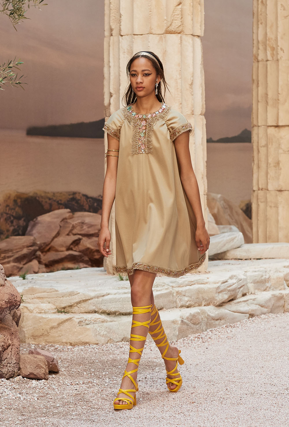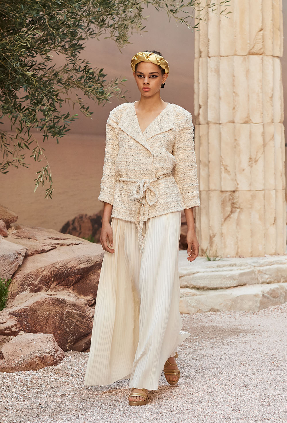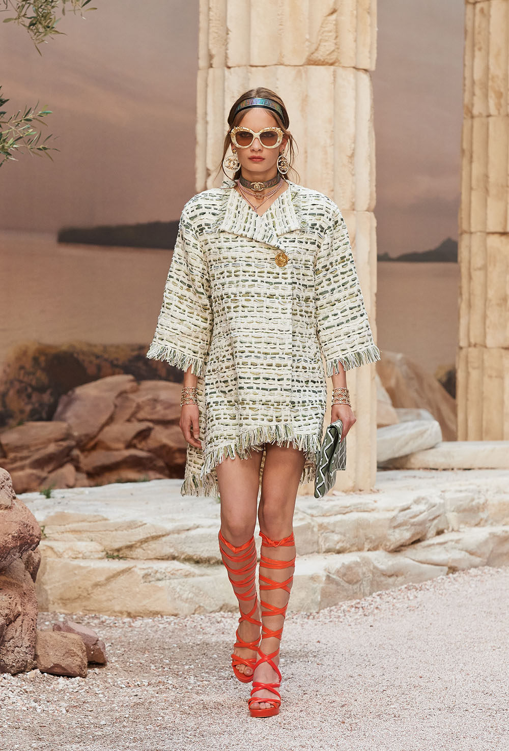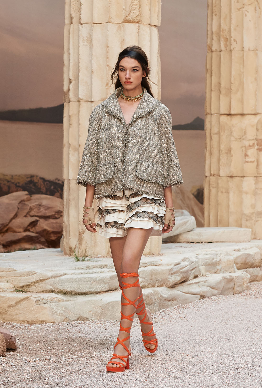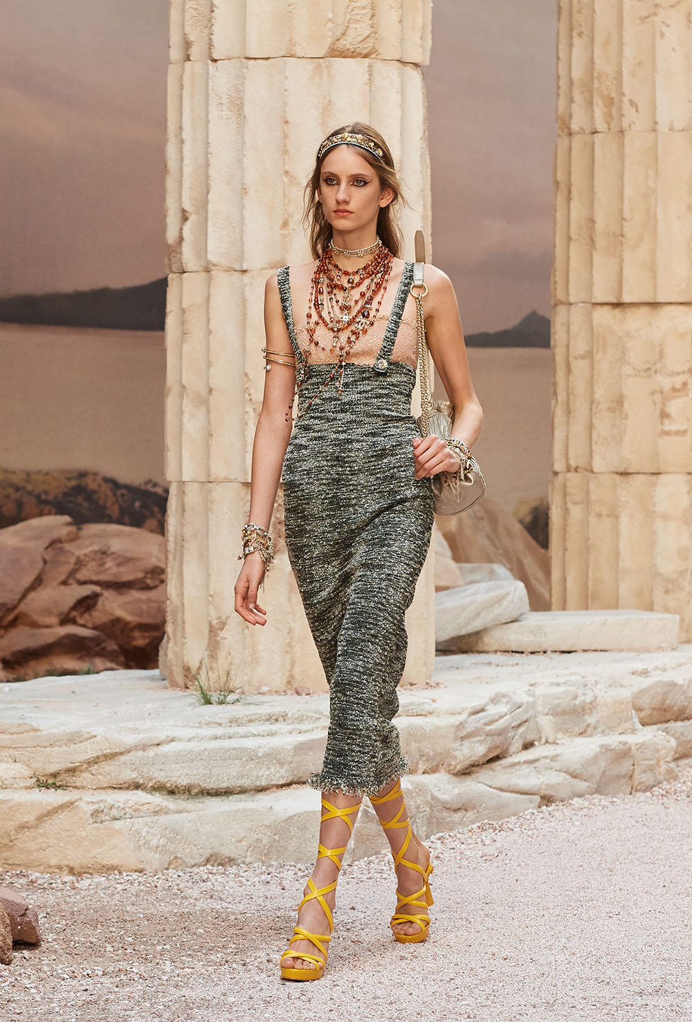 メゾンの普遍性やエスプリを含んだツイードスーツは、現代女性における戦闘服だ。その足元を飾るのは、色鮮やかなグラディエーターシューズ。縦溝彫りの柱からインスパイアされたプリーツや、壁画モチーフ、月桂樹の枝で作られたダブルCのプリントなど、テーマ性の強いディテールを随所に宿した。動きや生命、活力を象徴した螺旋模様の刺繍には、スパルタ人に着想したアイテムを合わせてエレガンスを追求。女剣闘士が纏う鎧のようなベアトップドレスや、ギリシャ神話に登場する女神を思わせる曲線の美しいシルクドレス群で、文化の源流を辿るストーリーを色濃く打ち出した。