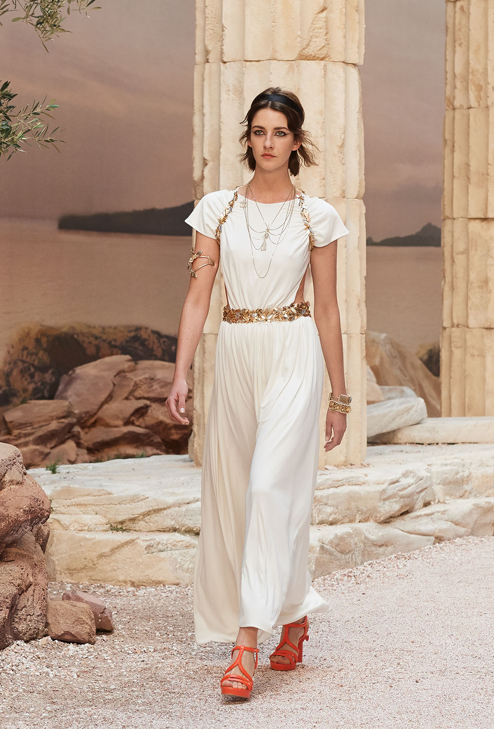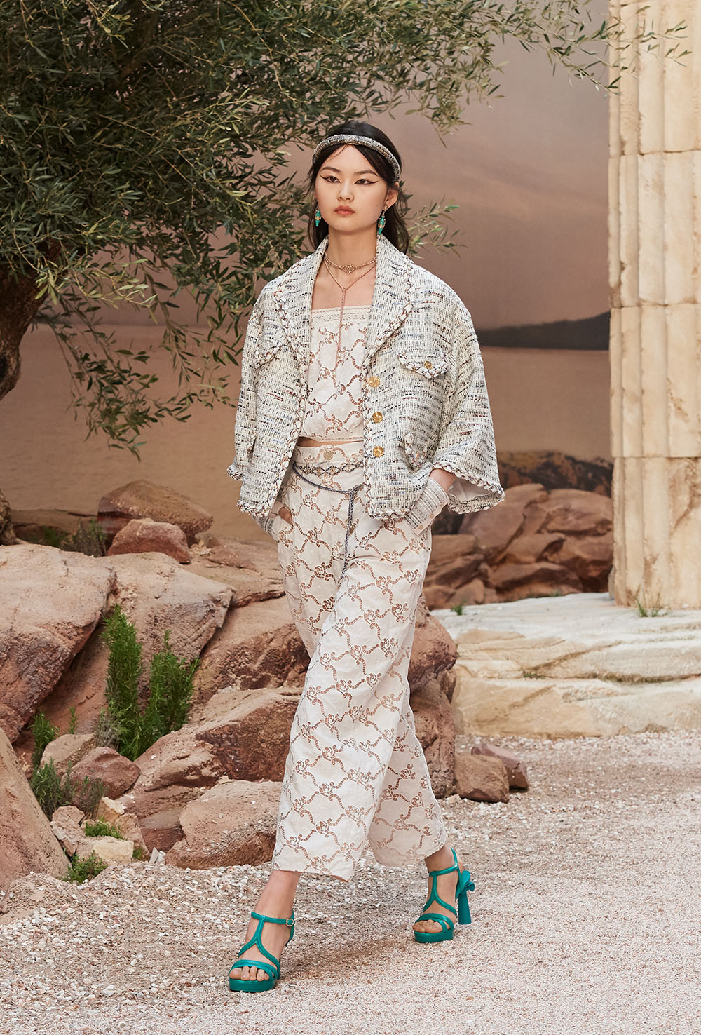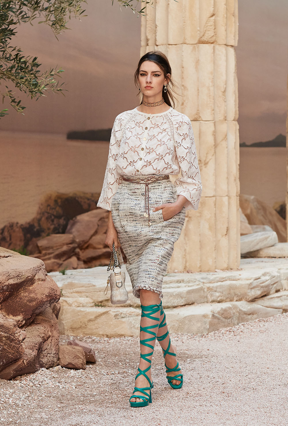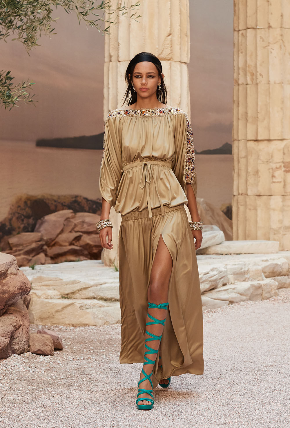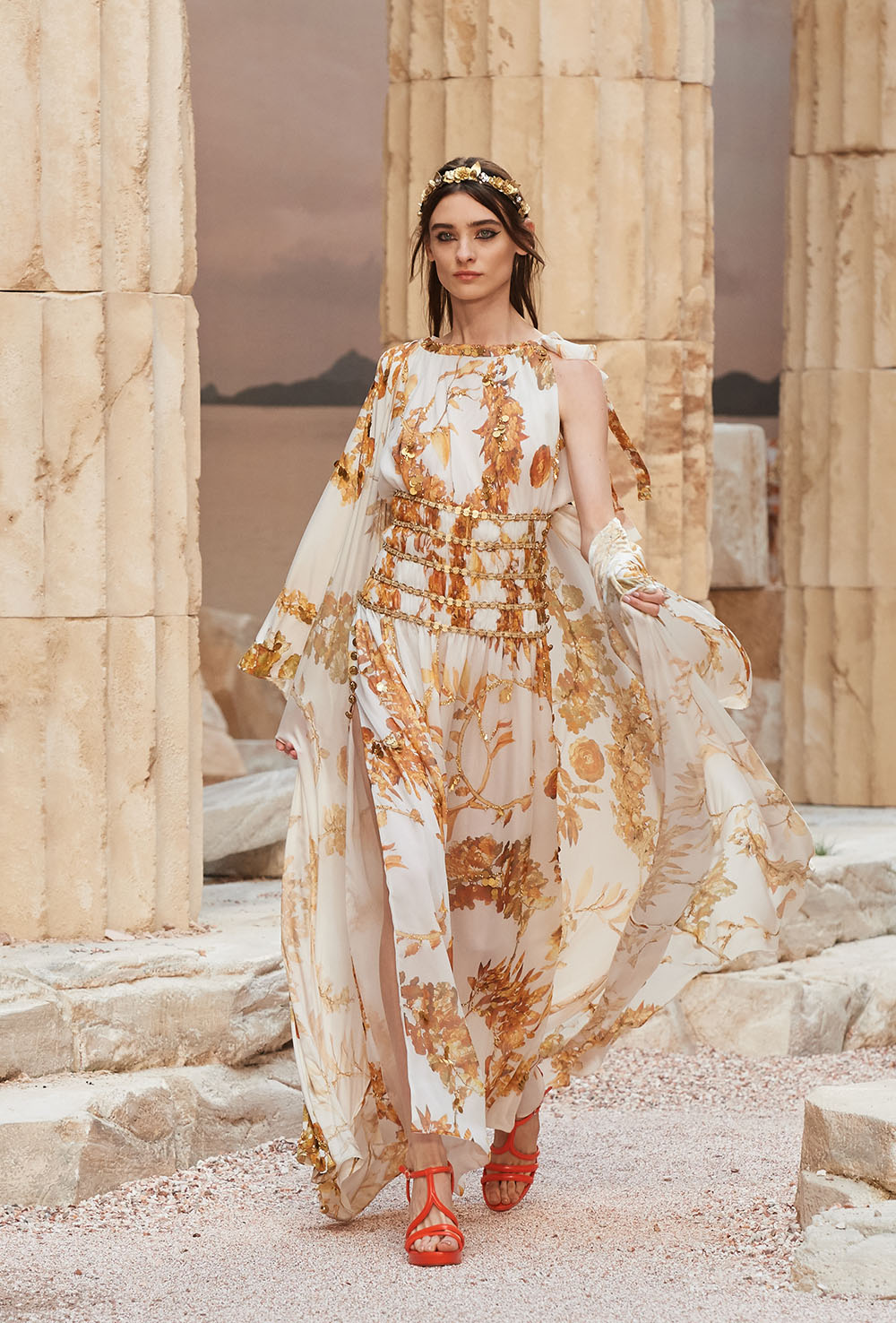 メゾンの普遍性やエスプリを含んだツイードスーツは、現代女性における戦闘服だ。その足元を飾るのは、色鮮やかなグラディエーターシューズ。縦溝彫りの柱からインスパイアされたプリーツや、壁画モチーフ、月桂樹の枝で作られたダブルCのプリントなど、テーマ性の強いディテールを随所に宿した。動きや生命、活力を象徴した螺旋模様の刺繍には、スパルタ人に着想したアイテムを合わせてエレガンスを追求。女剣闘士が纏う鎧のようなベアトップドレスや、ギリシャ神話に登場する女神を思わせる曲線の美しいシルクドレス群で、文化の源流を辿るストーリーを色濃く打ち出した。