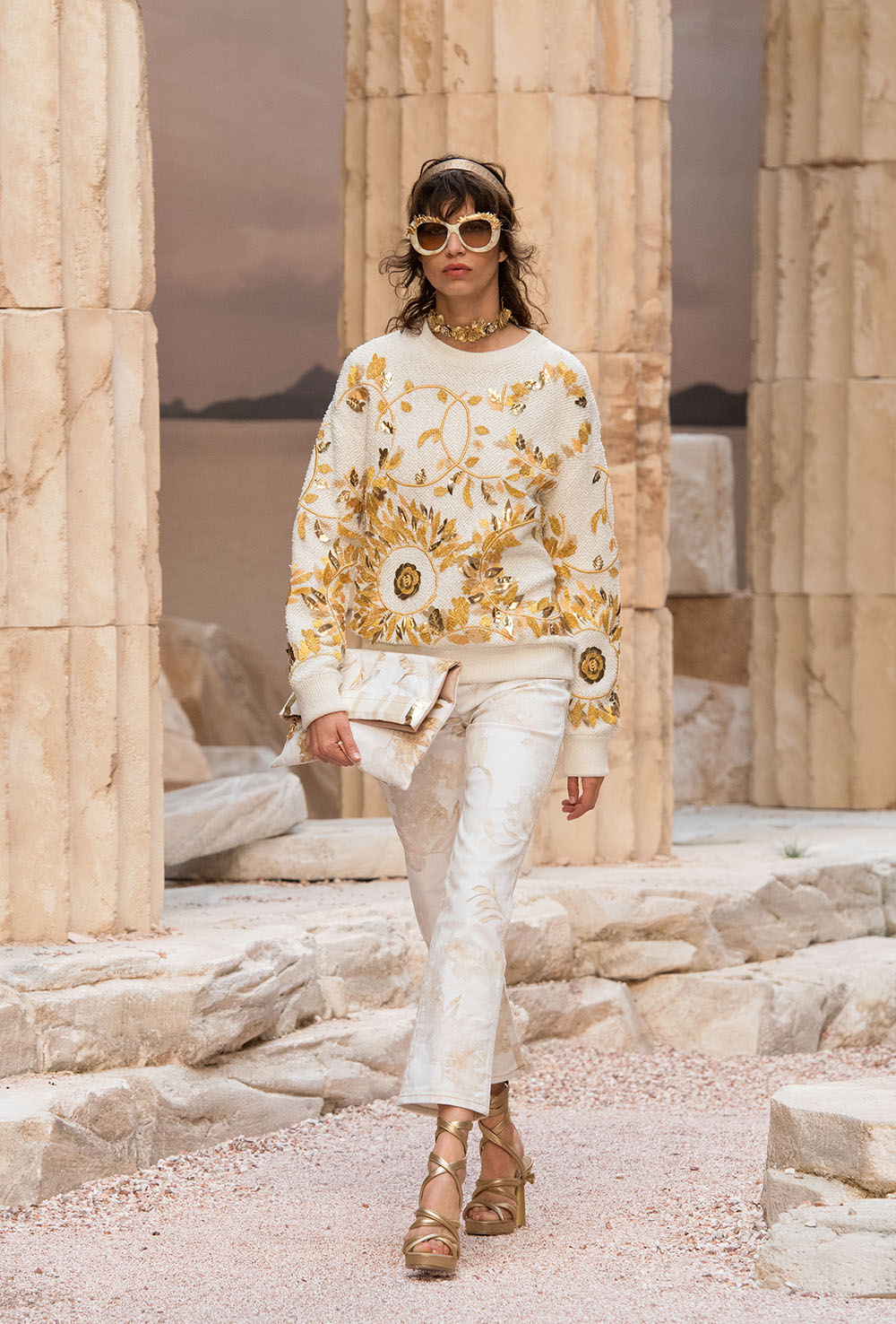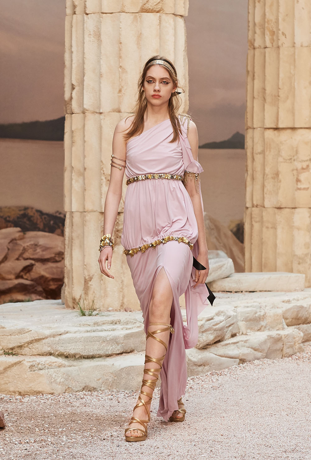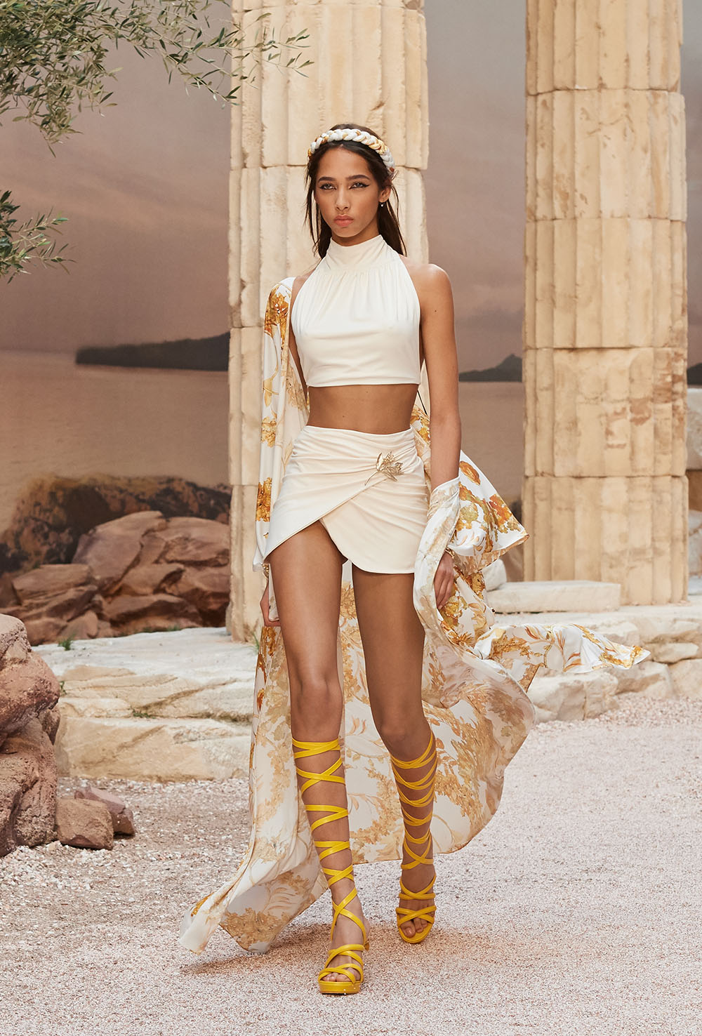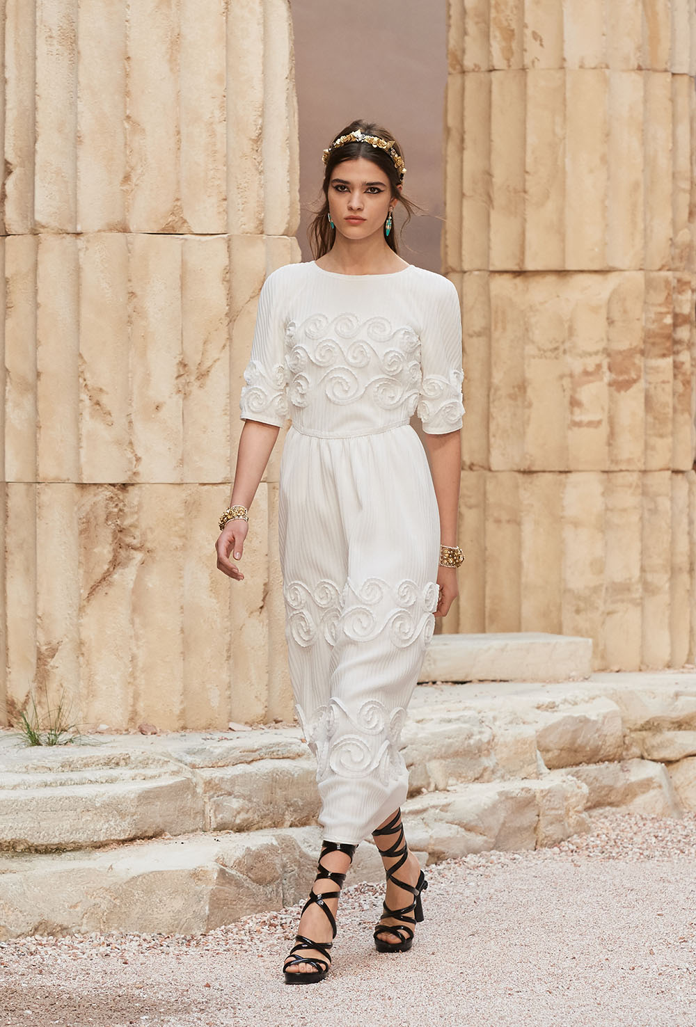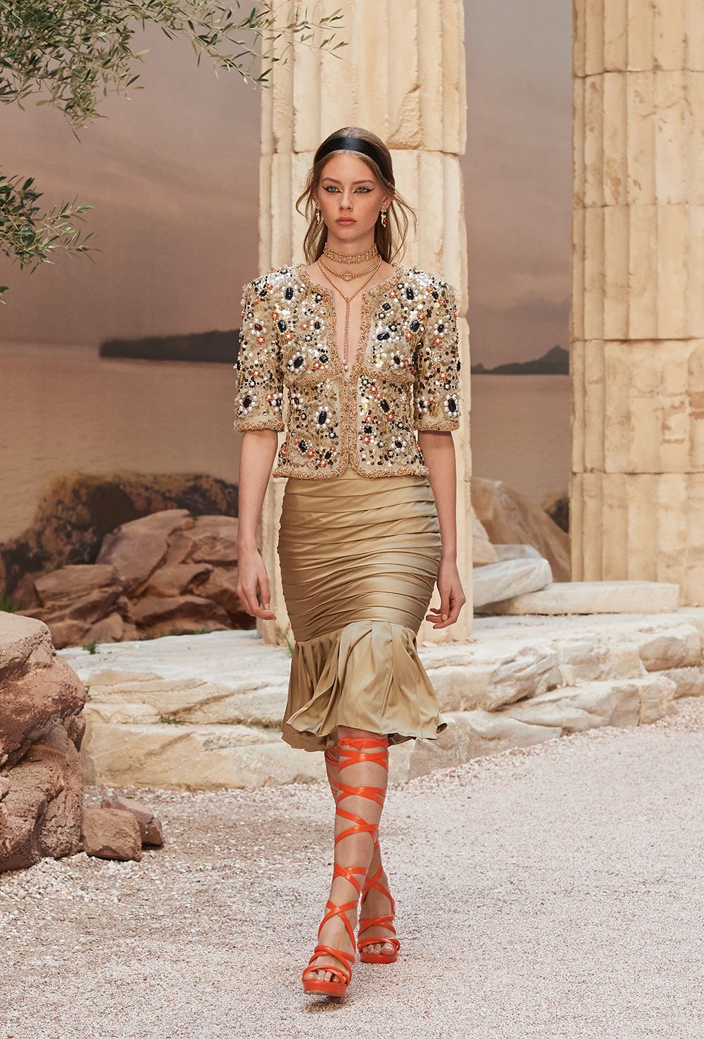 メゾンの普遍性やエスプリを含んだツイードスーツは、現代女性における戦闘服だ。その足元を飾るのは、色鮮やかなグラディエーターシューズ。縦溝彫りの柱からインスパイアされたプリーツや、壁画モチーフ、月桂樹の枝で作られたダブルCのプリントなど、テーマ性の強いディテールを随所に宿した。動きや生命、活力を象徴した螺旋模様の刺繍には、スパルタ人に着想したアイテムを合わせてエレガンスを追求。女剣闘士が纏う鎧のようなベアトップドレスや、ギリシャ神話に登場する女神を思わせる曲線の美しいシルクドレス群で、文化の源流を辿るストーリーを色濃く打ち出した。