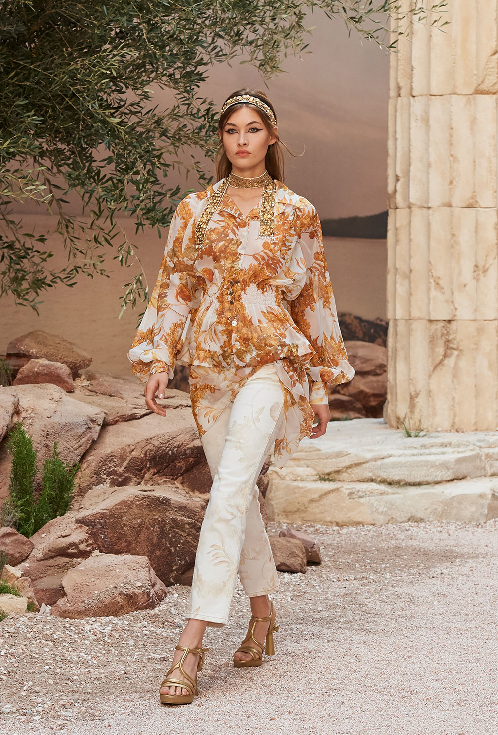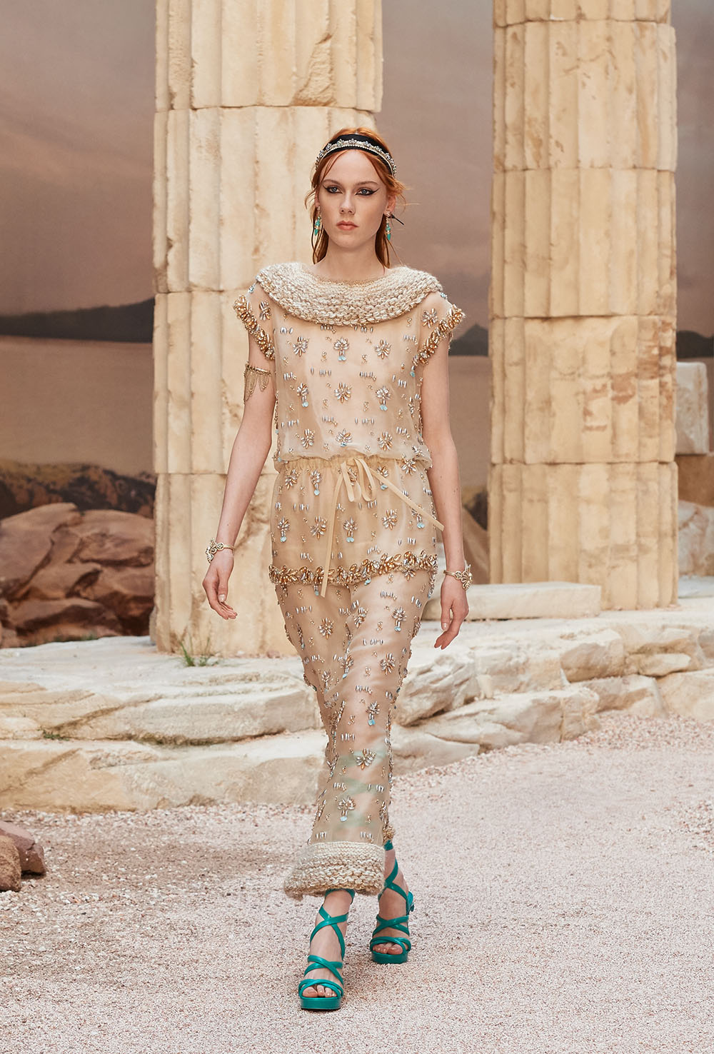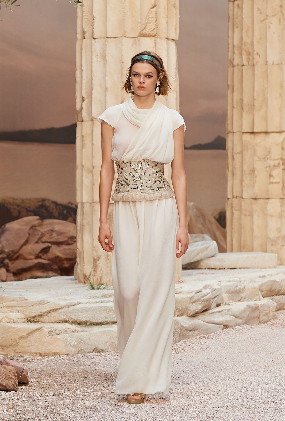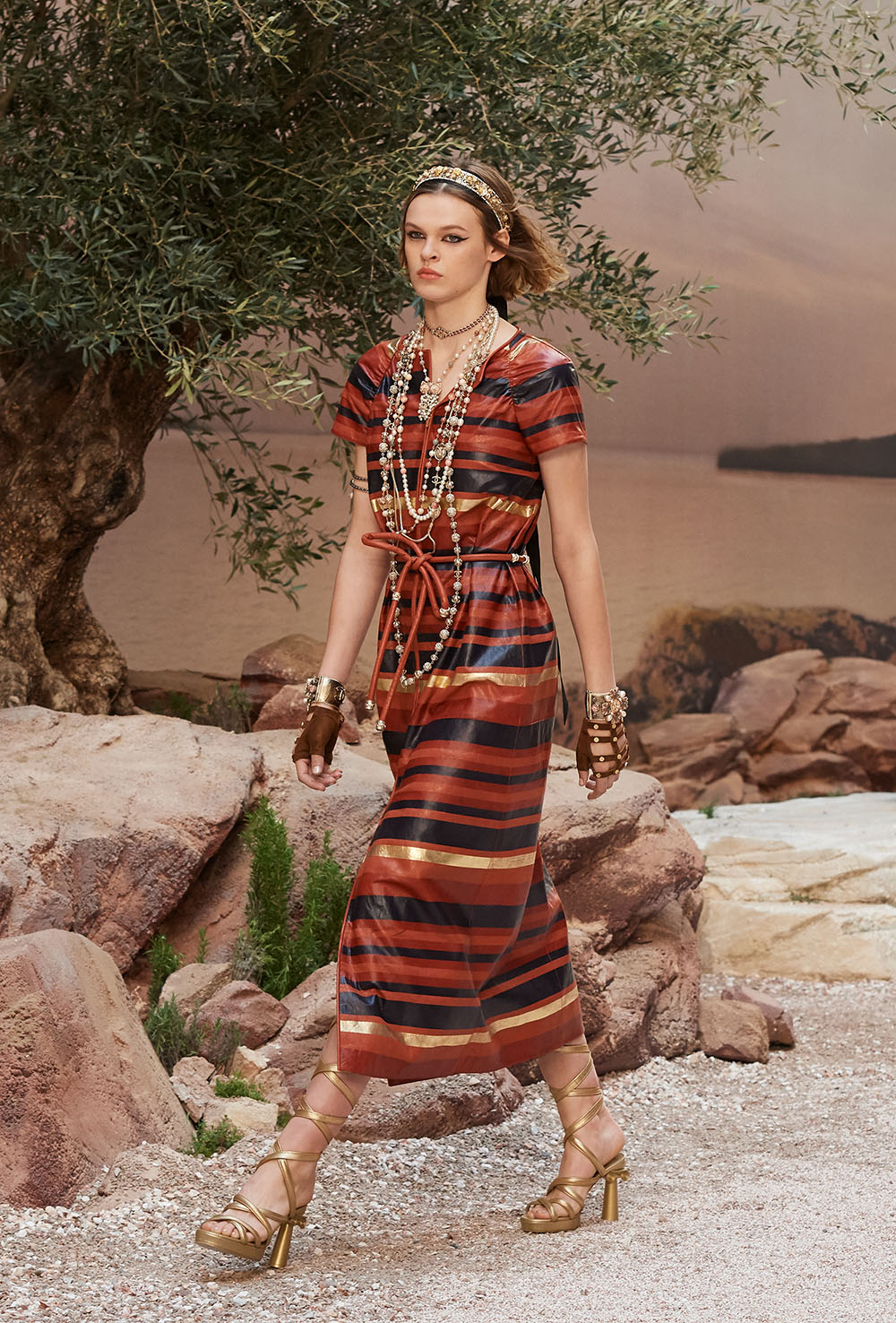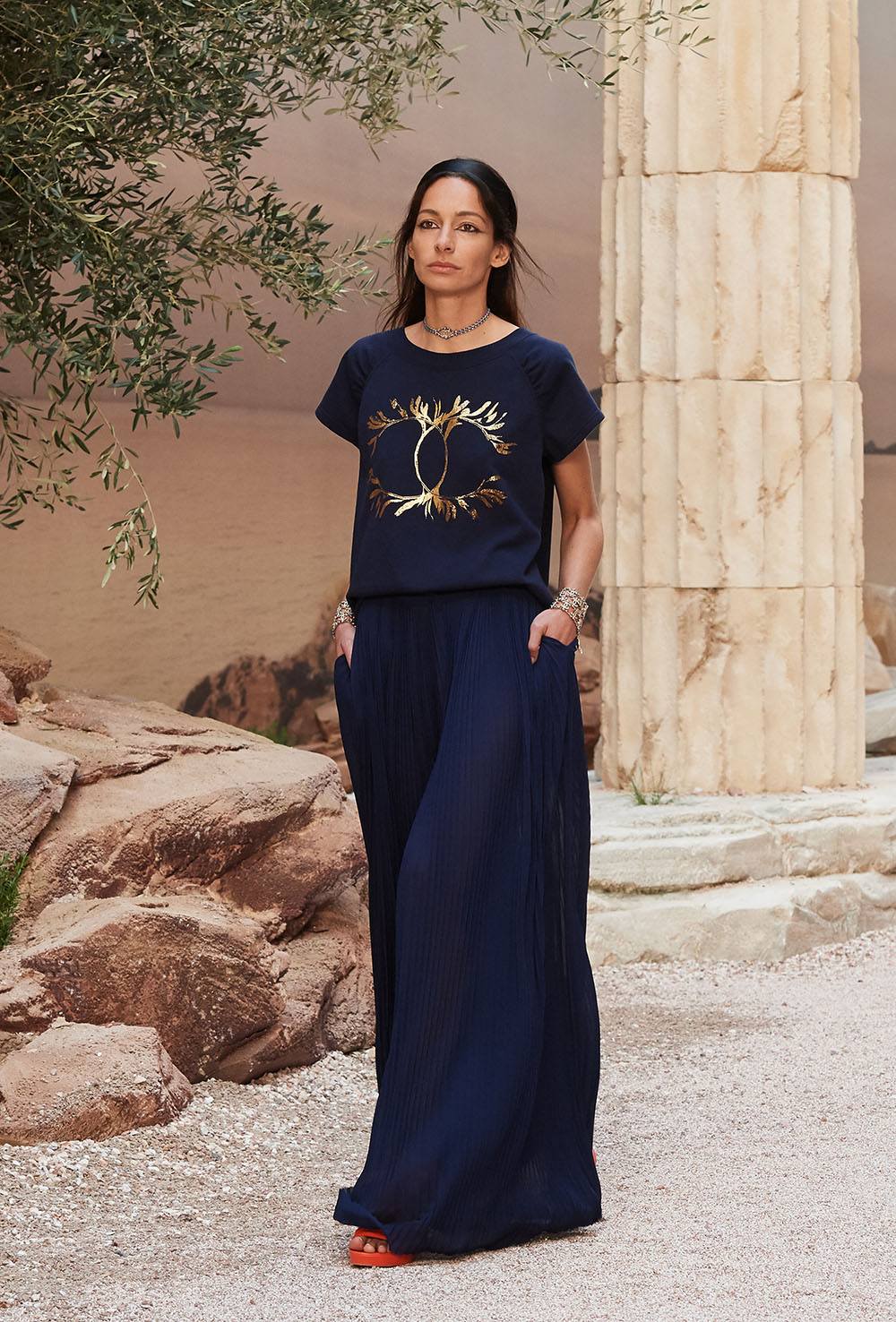 メゾンの普遍性やエスプリを含んだツイードスーツは、現代女性における戦闘服だ。その足元を飾るのは、色鮮やかなグラディエーターシューズ。縦溝彫りの柱からインスパイアされたプリーツや、壁画モチーフ、月桂樹の枝で作られたダブルCのプリントなど、テーマ性の強いディテールを随所に宿した。動きや生命、活力を象徴した螺旋模様の刺繍には、スパルタ人に着想したアイテムを合わせてエレガンスを追求。女剣闘士が纏う鎧のようなベアトップドレスや、ギリシャ神話に登場する女神を思わせる曲線の美しいシルクドレス群で、文化の源流を辿るストーリーを色濃く打ち出した。