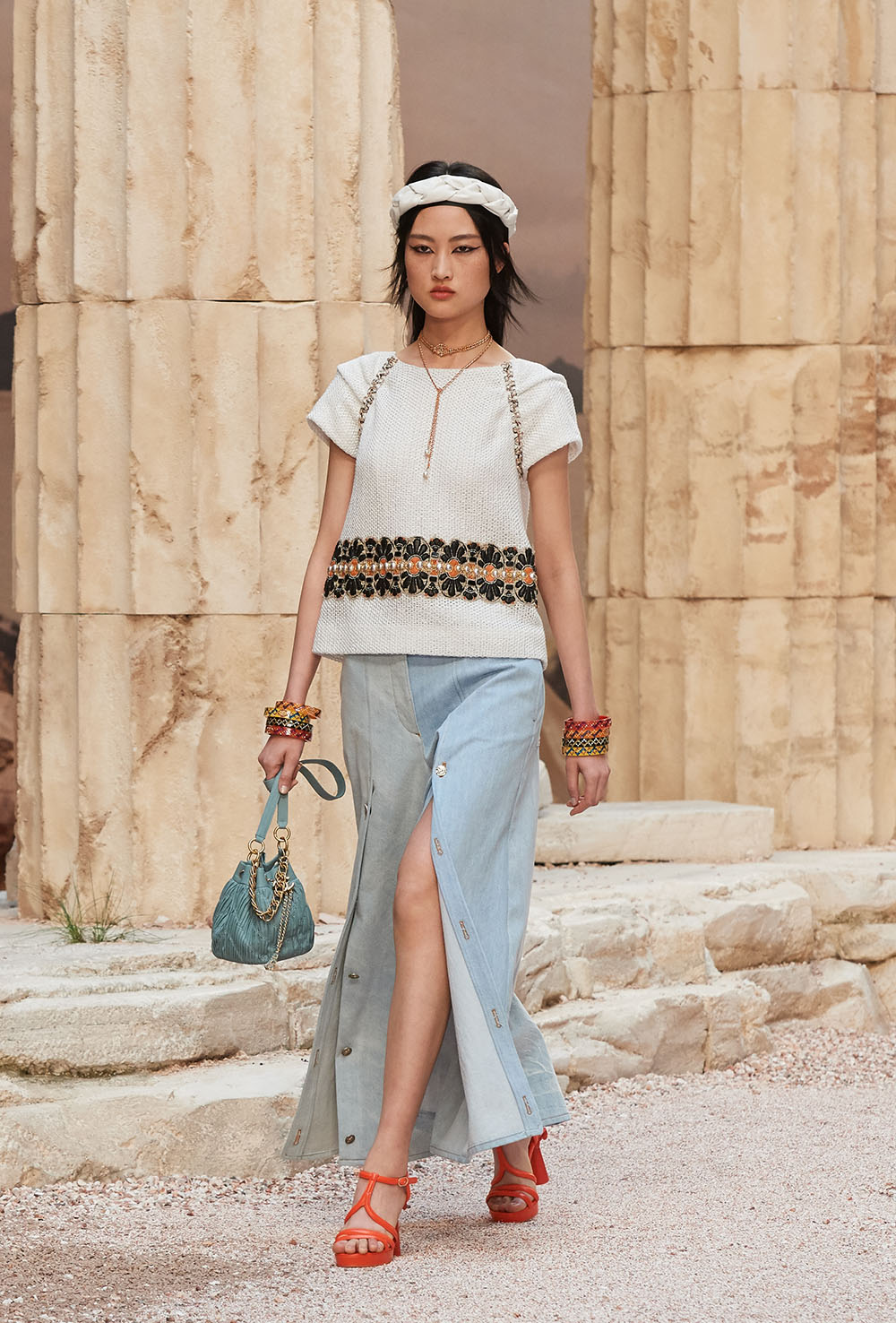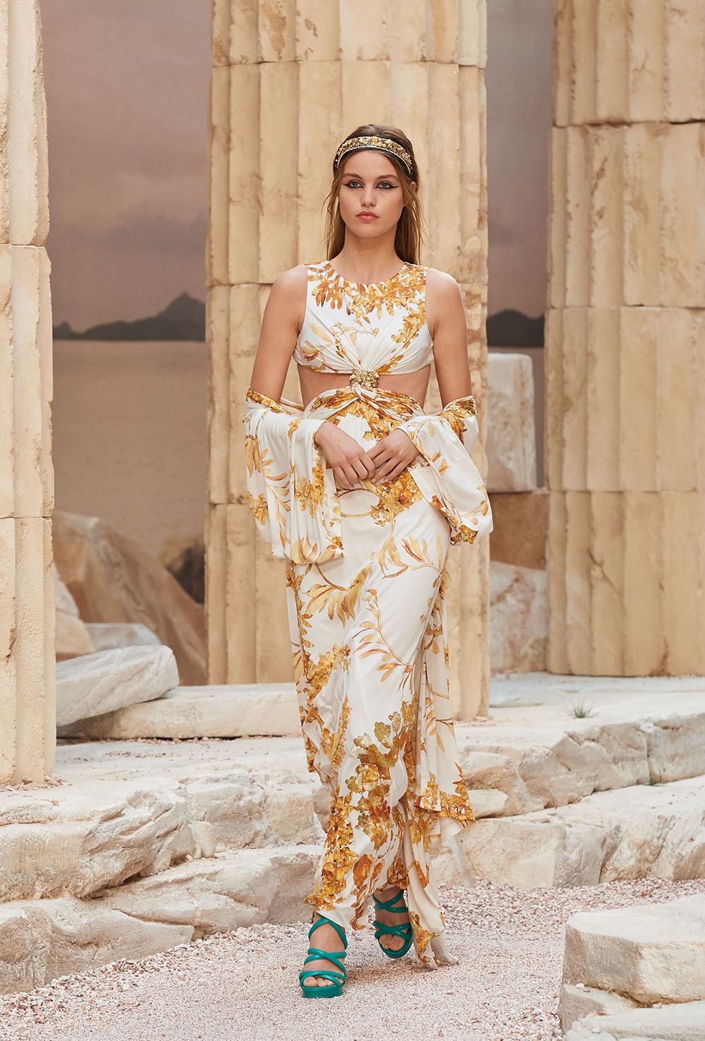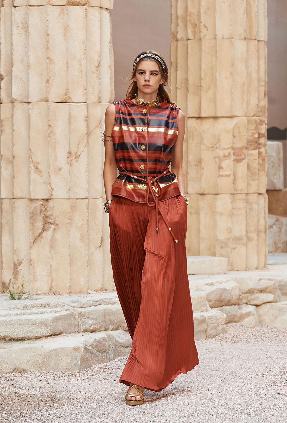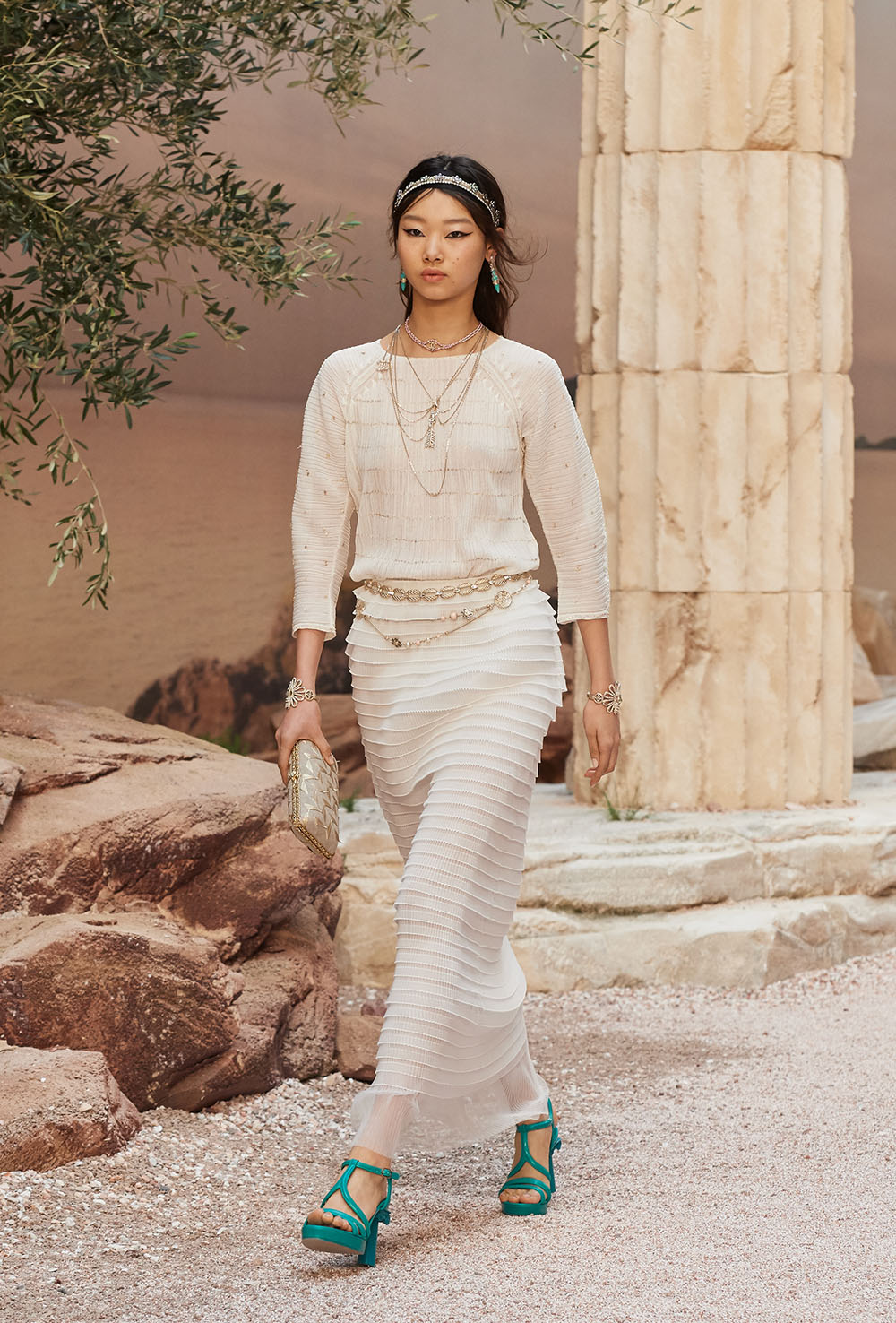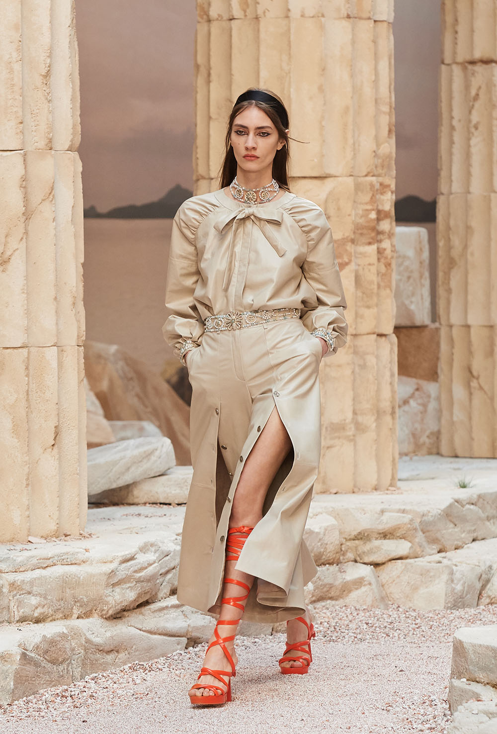 メゾンの普遍性やエスプリを含んだツイードスーツは、現代女性における戦闘服だ。その足元を飾るのは、色鮮やかなグラディエーターシューズ。縦溝彫りの柱からインスパイアされたプリーツや、壁画モチーフ、月桂樹の枝で作られたダブルCのプリントなど、テーマ性の強いディテールを随所に宿した。動きや生命、活力を象徴した螺旋模様の刺繍には、スパルタ人に着想したアイテムを合わせてエレガンスを追求。女剣闘士が纏う鎧のようなベアトップドレスや、ギリシャ神話に登場する女神を思わせる曲線の美しいシルクドレス群で、文化の源流を辿るストーリーを色濃く打ち出した。