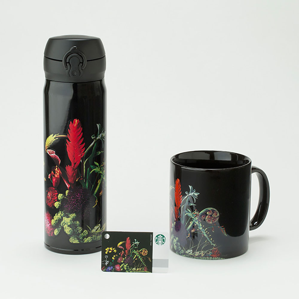 6月23日(金) からは第二弾のリリースも決定しており、こちらは更にクリエイション集団 AMKK も加えたトリプルコラボレーションとなっている。オートクチュールの花屋 JARDINS des FLEURS (ジャルダン・デ・フルール) を南青山に構える傍ら、世界各国で個展を開催し、国内外かた注目を集めているフラワーアーティスト東信。そんな彼が率いる花や植物を題材にしたクリエイションを展開する集団 AMKK による作品を、藤原ヒロシ監修のもとグラフィック化しプロダクトのデザインに落とし込んでいる。オールブラックのボディにビビッドなカラーリングの植物のグラフィックとのコントラストが目を惹くデザインは東信の目指す「神秘的な形」が再現されている。第一弾、第二弾とも全国の Starbucks 店舗 (一部店舗を除く) と、オンラインストアにて販売される。2012年より始まった本コラボレーションアイテムは発売初日から完売する店舗もあるとのことなので、早めにチェックしておきたい。