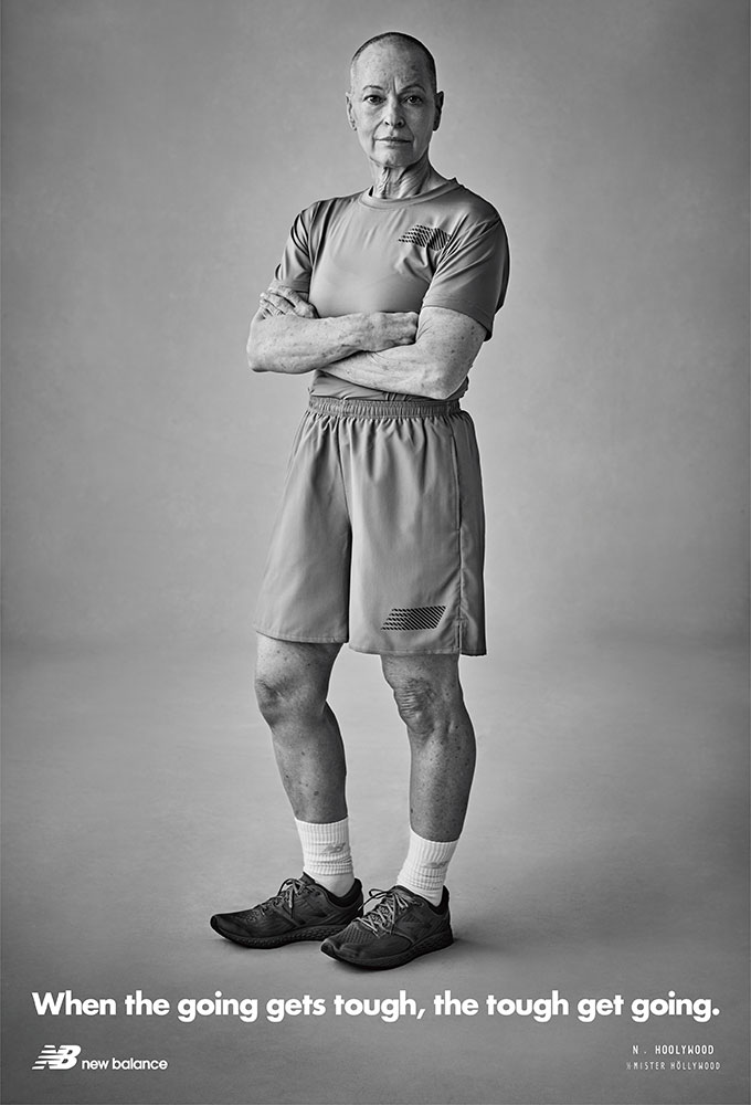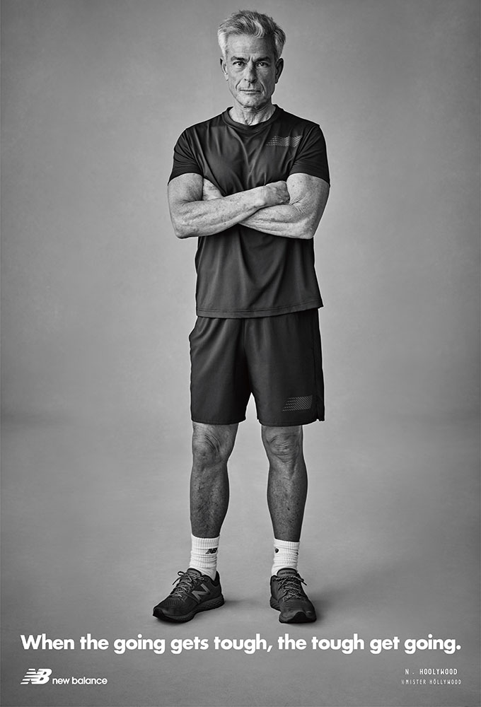 イメージビジュアルはシューズ、アパレル共に70年代の NEW BALANCE を代表する広告ビジュアルへのオマージュを元に制作された。アパレルのビジュアルは当時の広告に添えられていた「When the going gets tough, the tough get going」というキャッチコピーがそのまま使われ、60歳を超える2名のモデルが、美しいからだと精神を保ちながら時代とともに生きてきた力強さ=タフさを表現している。シューズは当時の「320」の広告へのオマージュ。当時の広告の中で象徴的に使われていた “花” は今回のテーマである “ミリタリー” を受け、デモを抑圧するミリタリーにヒッピーがカーネーションを捧げたところからインスピレーションを受けている。