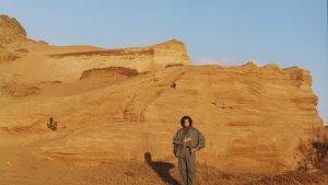 メジャーブランドのキャンペーンは今回が初めてというフレッシュな Oliver Sonne は2パターンのビジュアルに登場。ポニースキンのパッチが付いたフィッシャーマンニット帽をかぶり、こちらを見つめる表情はジェンダーレスな色気がある。もう1パターンは、ストレッチスエードのスイムスーツと、下着にヒントを得たトランクス、レースアップブーツを組み合わせ、しなやかにバランスをとったロングショット。ジオメトリックなストラクチャーの中で、彼の体のラインはこの先に輝く、新たなリアリズムを表現している。