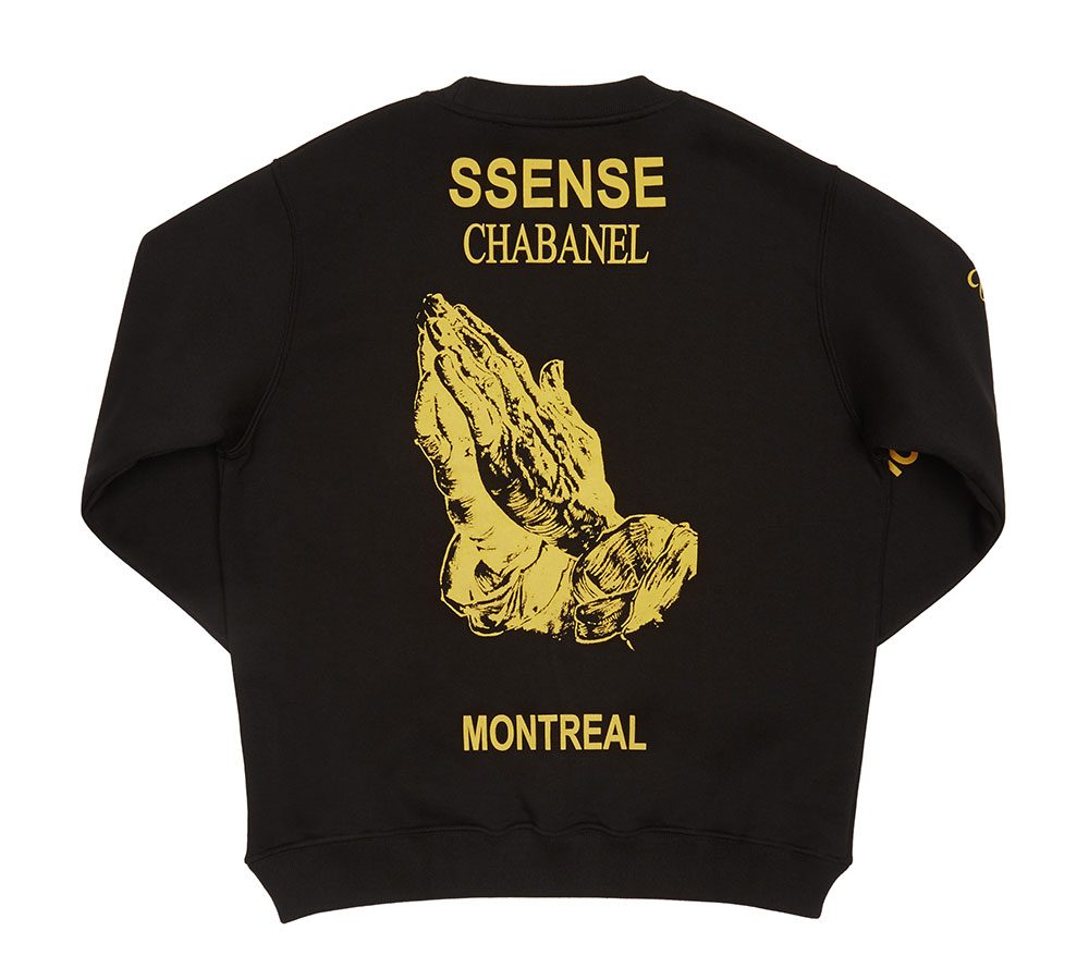 Religious Services のオリジナルアイテムは、ドイツ・ベルリンの Kreuzberg (クロイツベルグ) 地区にある『032c』のオフィスでデザインされている。背中にはドイツルネサンス期に活躍した、ドイツ美術史上最大の画家と言われている Albrecht Dürer (アルブレヒト・デューラー) が1508年に描いた「祈る手 (Playing Hand)」とともに Kreuzberg の文字がプリントされており、袖には電話番号とメッセージ “Religious Services” が入っている。今回のアイテムのバックには、 Kreuzberg の代わりに、SSENSE の本社がある Montreal (モントリオール) Chabanel (シャバネル) の文字がプリントされている。袖には、英語とフランスが混在する Montreal らしく “Religious Services ”、“ Services Religieux” と2つの言語が入ったデザインとなっている。