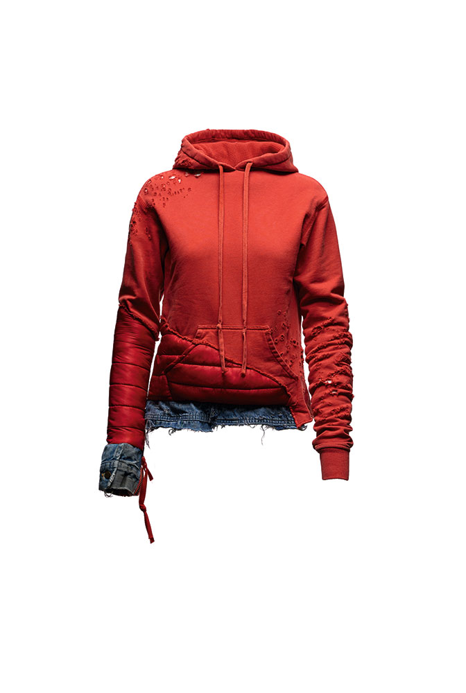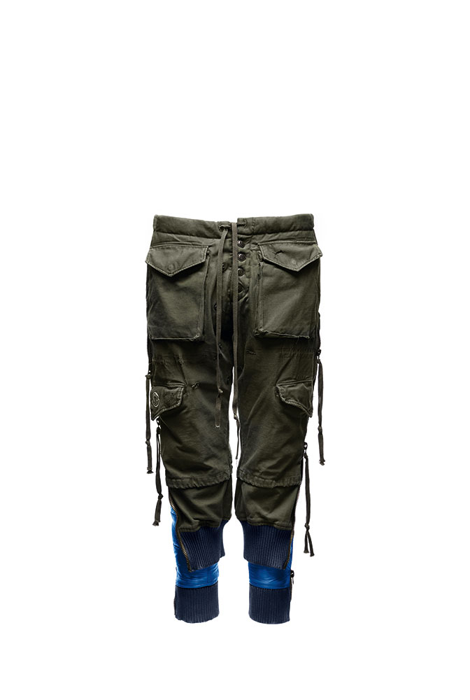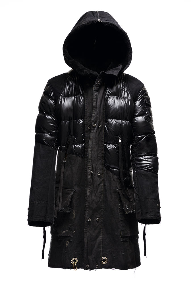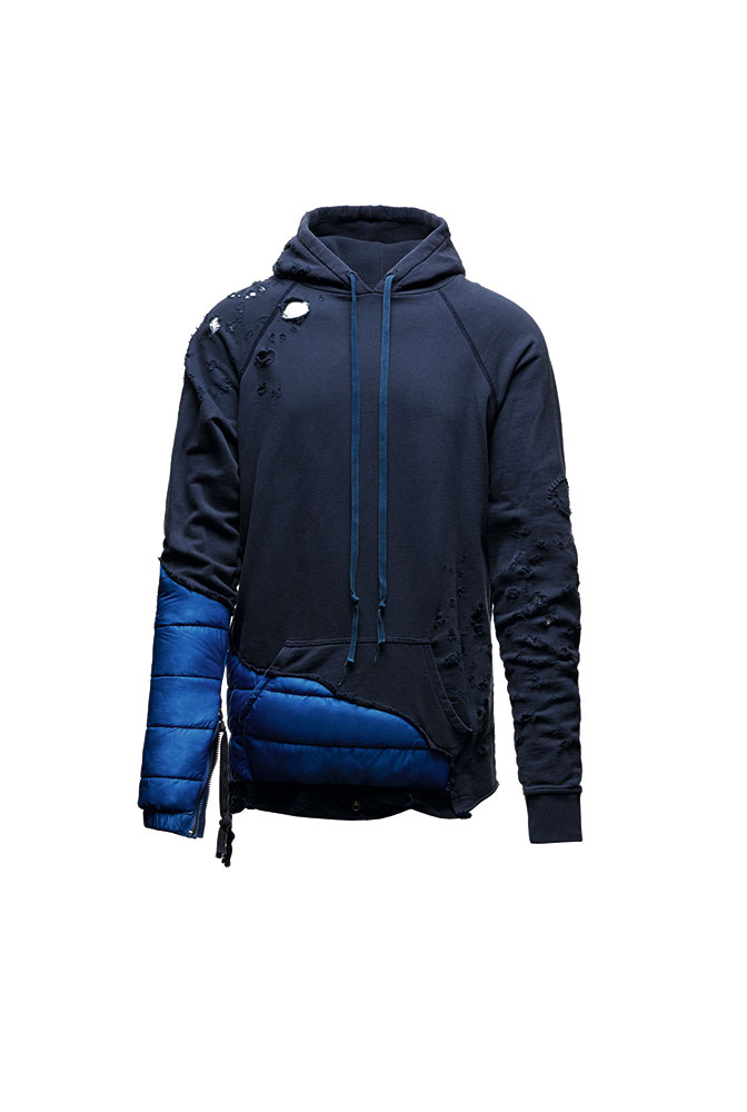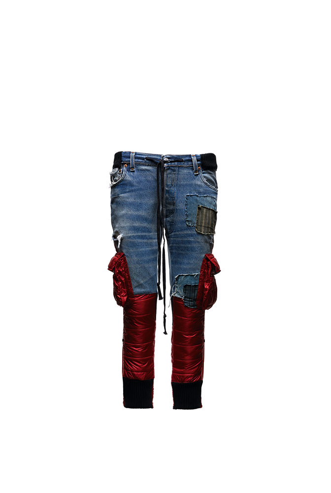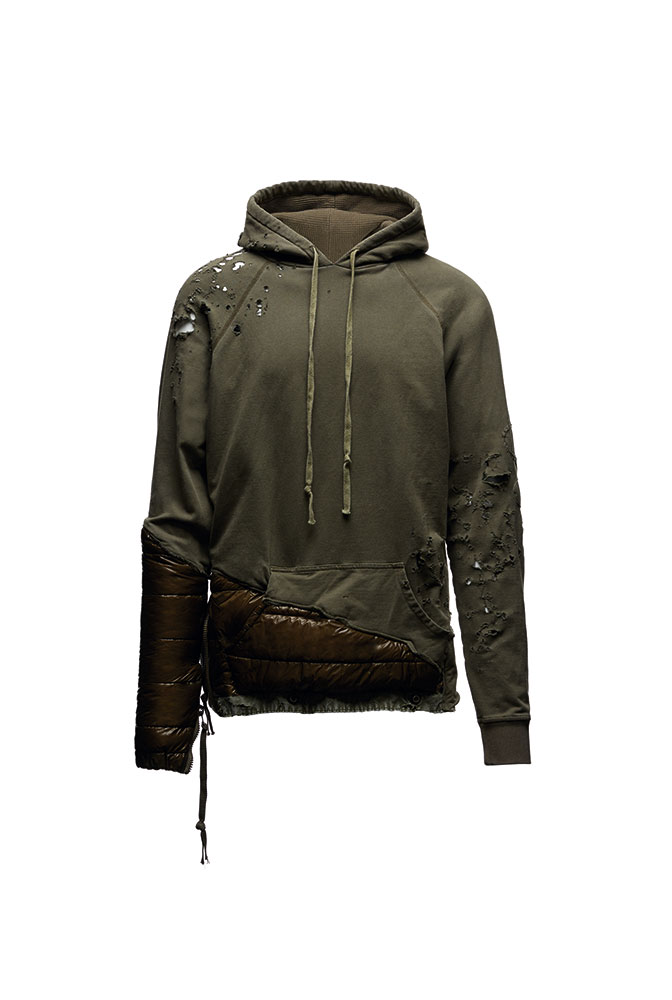 「COLLIDE (衝突)」と名付けられた本コレクションは、解体、交差、再構築という Greg Lauren 自身が大切にしているアプローチで作られている。自由かつ想像を超えたものであると同時に、調和を重んじた再構築で、デニム生地の断片や着古されたヴィンテージファブリックがジャケットやカットソー、ボトムへと組み込まれる。今回のコレクションに際し、Greg Lauren は以下のようにコメントしている。「絶対的なユニークさとオリジナリティをコンセプトに、各アイテムを形態学に基づくクリエイティブの融合、もしくは Moncler におけるヘリテージを変化させる可能性から発展させました。私は象徴的な考えをすくい上げ、アーティスティックな視点で再解釈し、既存の概念を解体・再構築する行為が大好きです。」