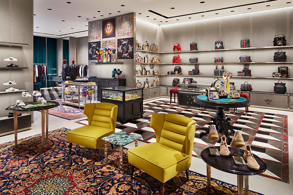 Alessandro Michele による新たなコレクションの特徴となっているエレガントでコンテンポラリーな折衷主義と共鳴するように、伝統とモダン、インダストリアルとロマンティックなエレメントが融合した内観となっており、アーキテクチャーとインテリアは控えめなデザインで、心地よくリラックスできる空間を創りだしている。Gucci ならではの美しい素材を取り入れながら、明確な意図に基づいてスペースを贅沢に使うことにより、これまでにないコンテンポラリーラグジュアリーを提供。機能性セメントを壁材に取り入れたフロアでは、異なるカラーの大理石を組み合わせた象眼を施すことにより、装飾的な三次元効果が生み出され、調和のとれた一体感を生み出している。このように対照的な素材を並列することにより生まれる新たな融合は、テクニカルでメカニカルなディスプレイユニットと、プレシャスなファブリックの柔らかさとのコントラストや、ソファーやフィッティングルームで使用されているチェリーレッドまたはペールピンク ベルベット、そしてショップ内に配置されたラグジュアリーな椅子や、ビンテージのオリエンタルラグなど随所で効果を発揮している。