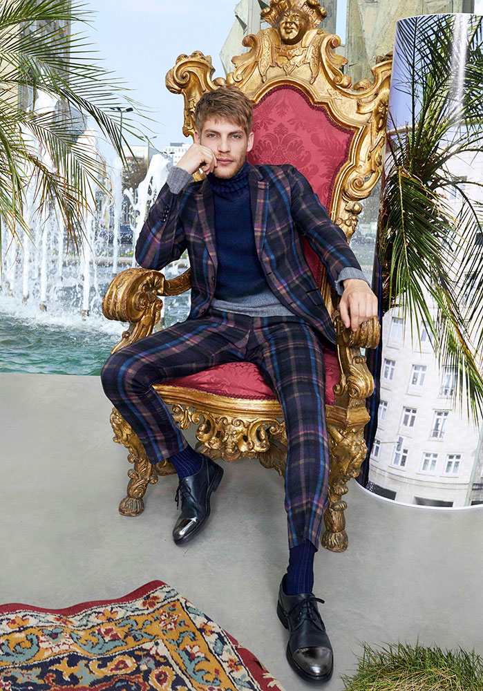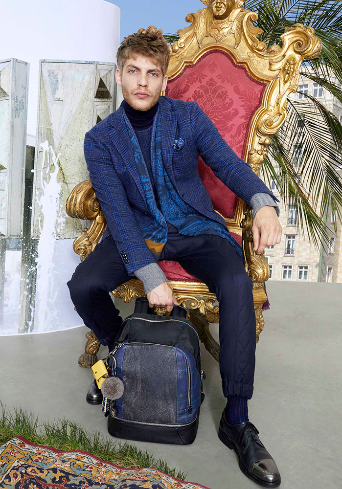 今シーズン、エトロウーマンが纏うのは、カラフルなリボン使いやヘムのリッチなディテールに彩られたオーバーサイズのアウターや、ペイズリーとフラワー モチーフのドレス。 アクセサリーは、フォークロアとアーバンスタイルのバランスが絶妙。ヒマラヤの民族衣装にインスパイアされ、創造性に富んだ幾何学柄を力強いカラー リングで表現したエトロのレインボーカラーバッグが、今季の主役となっている。一方、メンズコレクションは、洗練されたタータンチェックのスーツルックを起用。ブルーの陰影やルック全体を象徴する要素は、現代的なディテールと相まって、新たな表現へと変貌する。