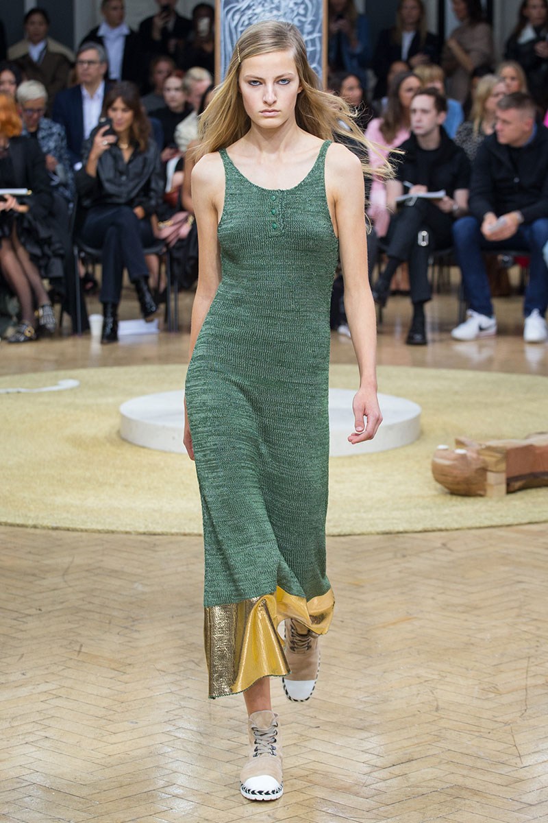 J.W.Anderson (J.W.アンダーソン) は円形のステージを囲むようにモデルが闊歩した。麻やニットに箔プリントを施し、プリミティブドレスをぐっとモダンに仕上げている。杢糸の量感ニットもコーティングによって光沢感と軽さを加えレザーのキュロットパンツを合わせている。ベージュにカーキ、砂漠のようなオレンジなど乾いたトーンが真夏に空の下に映えそうだ。バイアスに接いだストライプのフレアードレスは手を加えながらも、抜け感を感じさせる。