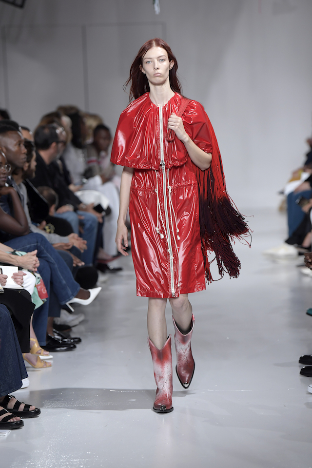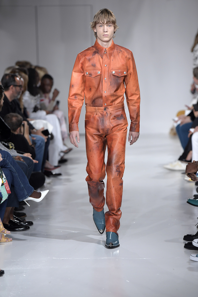 お馴染みのウエスタンシャツが新たに光沢感のある装いでアップデートされたファーストルックから幕を開け、ランウェイ上には好奇心を掻き立てるようなキャラクタリスティックなルックが続々と登場。ダメージの施されたイブニングドレスは、やはり悲劇のヒロインの必須アイテムか?はたまた、ランバージャックチェックのテイラースーツは、タフなヒーローの新たなユニフォーム?20世紀半ばのアメリカンオートクチュールのシルエットを採用しつつも、ラバーやナイロン、手塗りレザーなど一癖も二癖もあるマテリアルで思う存分遊び尽くしたコレクションは、まさに刺激的の一言に尽きる。