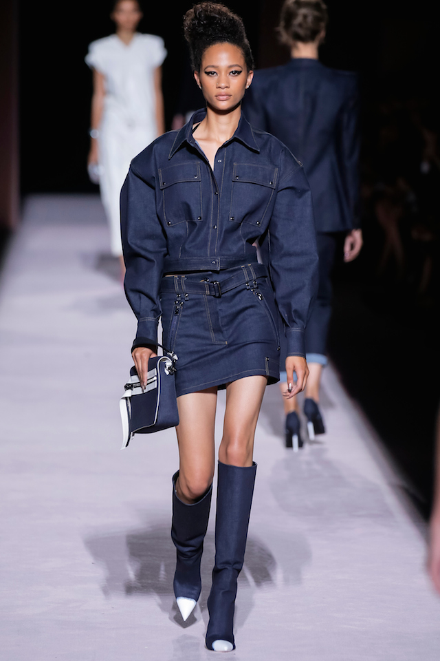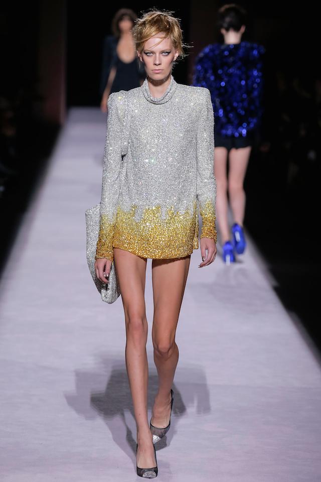 90年代に Gucci (グッチ) のクリエイティブ・ディレクターとして活躍し、その後 Saint Laurent (サンローラン) で手腕を振るった TOM FORD。コレクションには、ふたつのブランドで培った経験を振り返るかのような胸元の大きくはだけたグラムなジャンプスーツや洗練されたスモーキングジャケットなどが登場。さながらヒット曲のオンパレードのような様相を呈した。ショーの余韻もそのままにランウェイ会場はすぐさまダンスフロアと化す。ゲスト達は、一夜限りのゴールデンエイジの復活に白熱したに違いない。