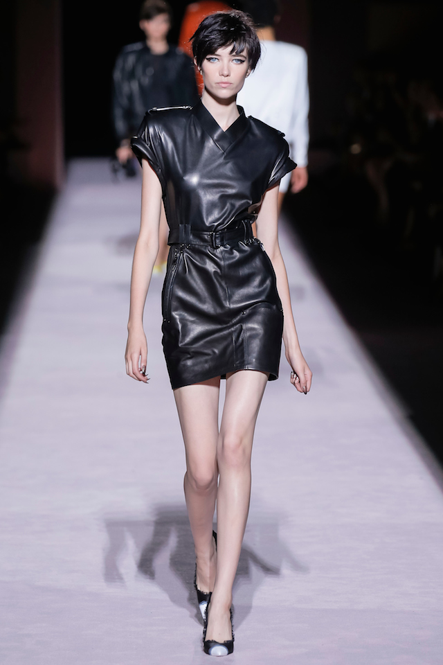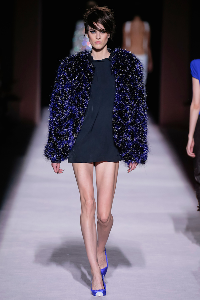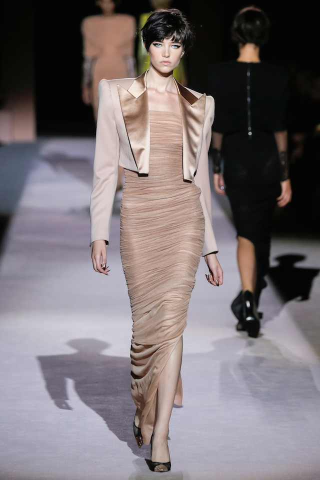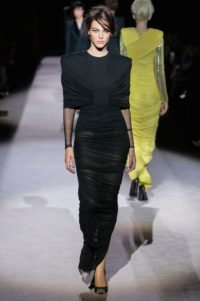 思わず「待ってました!」と拍手をしてしまうほど、デザイナーのオーセンティシティーを余すことなく披露した同コレクションは、エネルギッシュかつグラマラス。ジャケットはパワーショルダー、スカートの丈はマイクロミニ、ヒールは勿論ポインテッドトゥ。まるでスーパーモデルが世間を圧巻したあの90年代の活気がカムバックしたかのように、高揚感がショー全体にみなぎっている。特に目を惹くのは、アシンメトリーなギャザーを寄せ、ボディコンシャスでありながらエレガントな印象を与えるイヴニングドレスに合わせたクリスタルのグローブだ。ミラーボールかのようなその輝きは、今は亡き享楽のディスコシーンを彷彿とさせる。