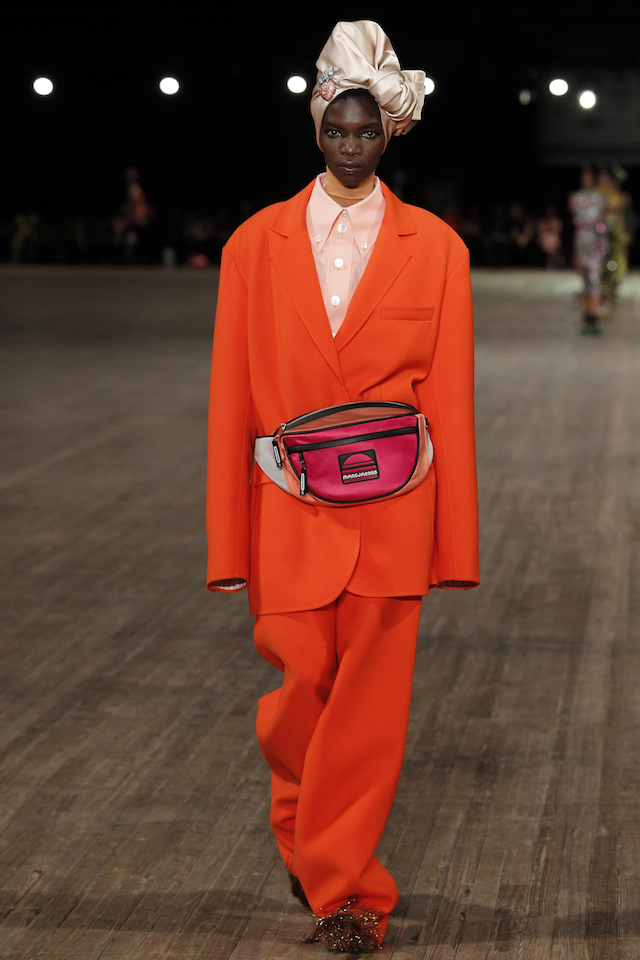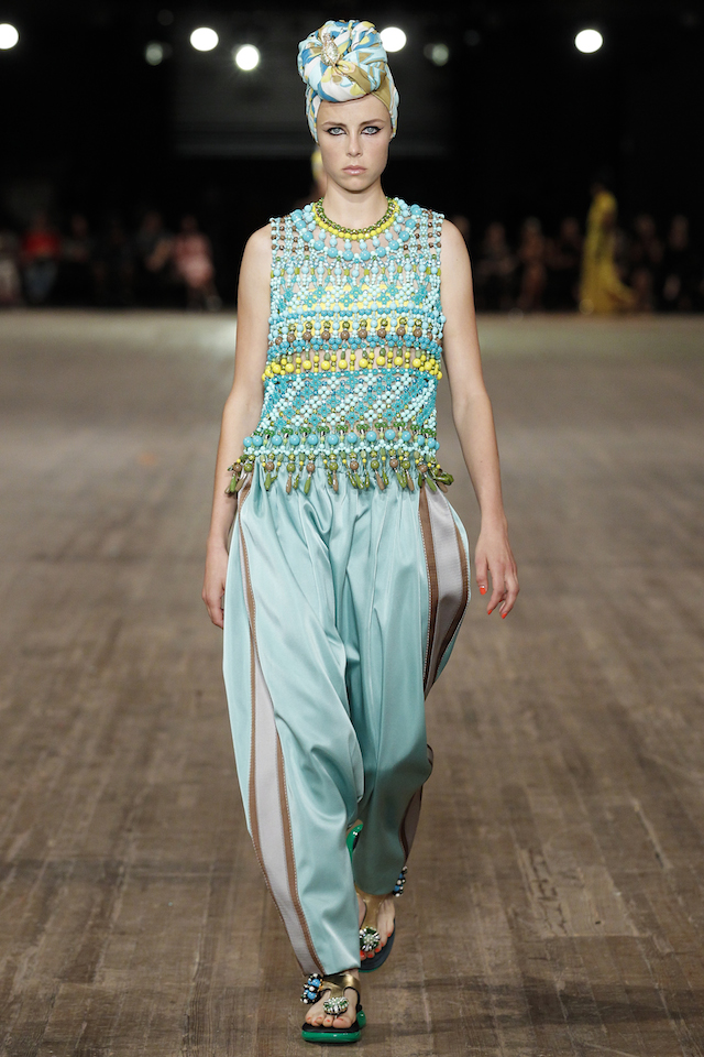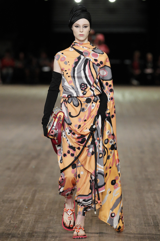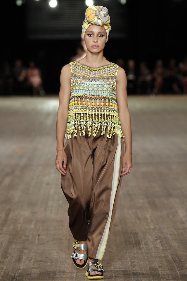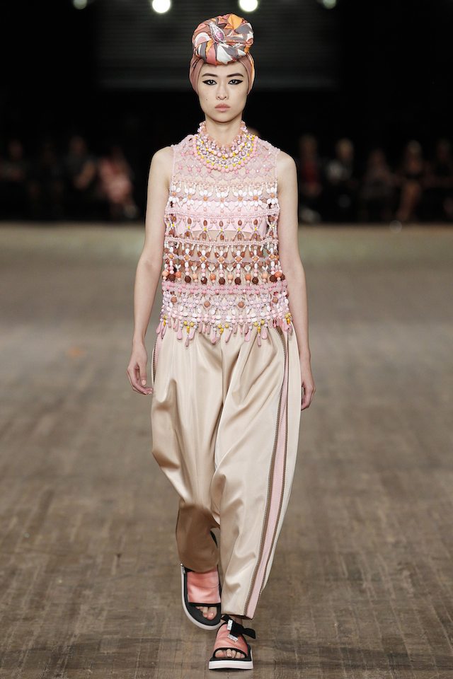 燃えるように情熱的なオレンジからショッキングなピンク、陽光を浴びて眩しく輝くイエローといったビタミンカラーにこれまでのアーカイヴから蘇らせたというバリエーション豊かなフローラルプリント。次々と繰り出される華やかなバカンスルックは、オーバーサイズなシルエットにナイロンやジャージといった素材が用いられることで、新感覚のスポーツウェアに仕上がっている。まるでスポーツブランドのようなロゴが中央に配されたウエストポーチにトラベルバッグなど旅先で活躍するであろう実用的なアイテムが登場し、足下はフリンジやタッセル、ポンポンなどで過剰なほどに装飾されたサンダルやバブーシュ(モロッコの伝統的なフットウェア)がアクセントを添えている。