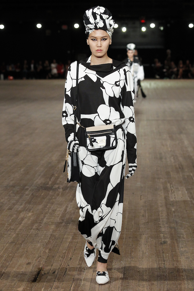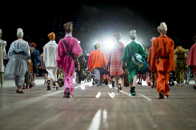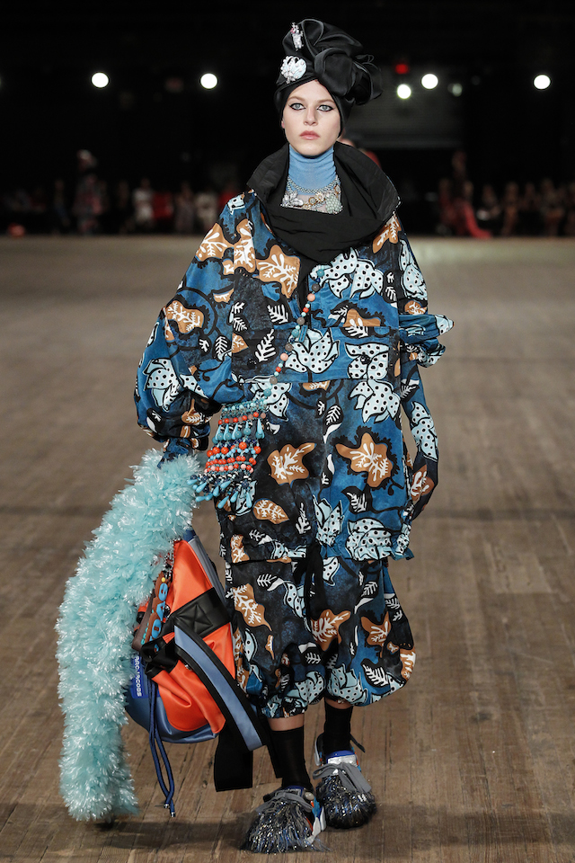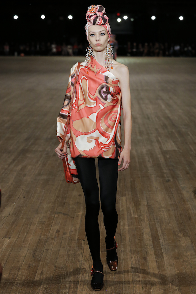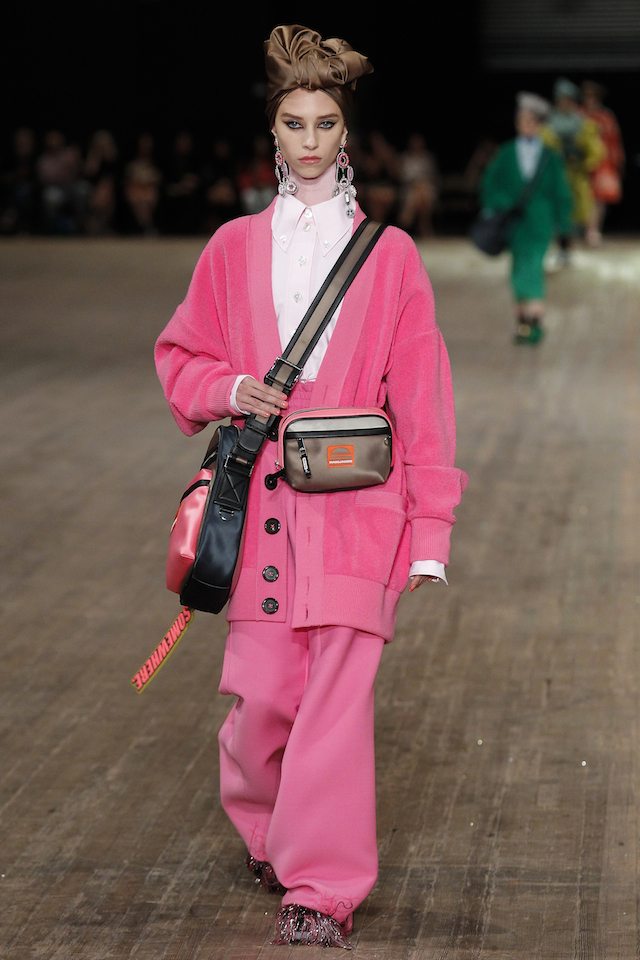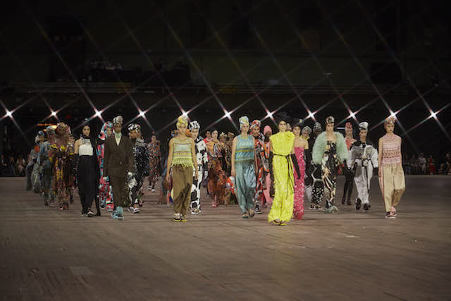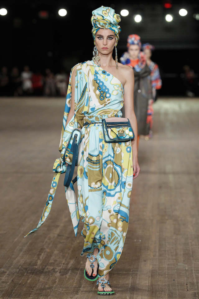 燃えるように情熱的なオレンジからショッキングなピンク、陽光を浴びて眩しく輝くイエローといったビタミンカラーにこれまでのアーカイヴから蘇らせたというバリエーション豊かなフローラルプリント。次々と繰り出される華やかなバカンスルックは、オーバーサイズなシルエットにナイロンやジャージといった素材が用いられることで、新感覚のスポーツウェアに仕上がっている。まるでスポーツブランドのようなロゴが中央に配されたウエストポーチにトラベルバッグなど旅先で活躍するであろう実用的なアイテムが登場し、足下はフリンジやタッセル、ポンポンなどで過剰なほどに装飾されたサンダルやバブーシュ(モロッコの伝統的なフットウェア)がアクセントを添えている。