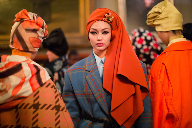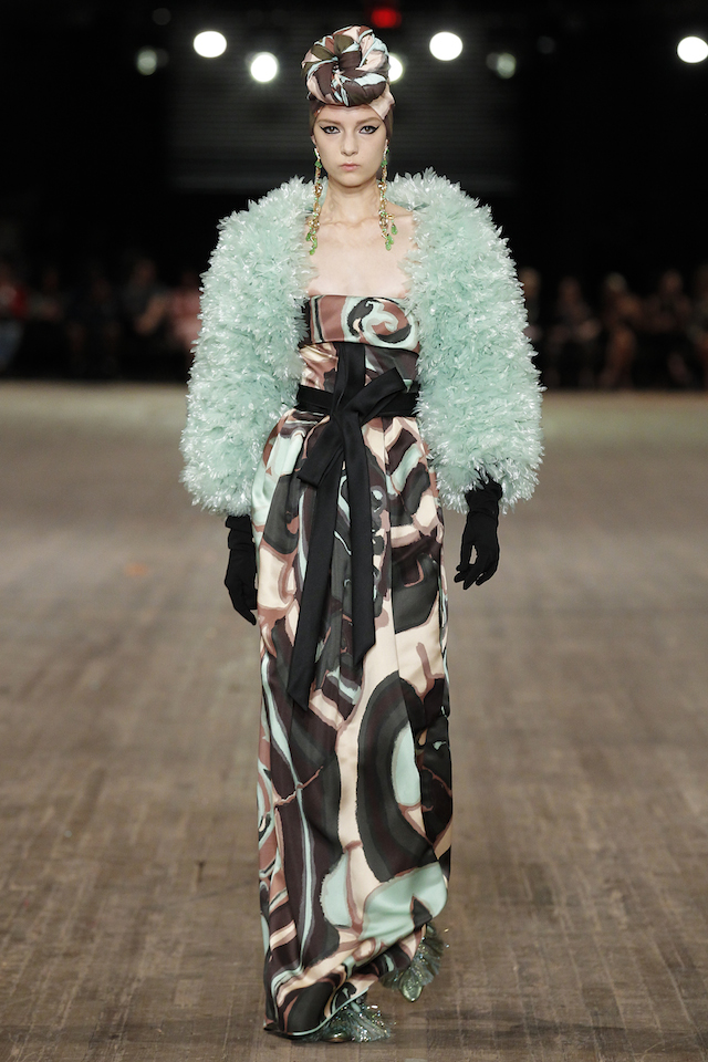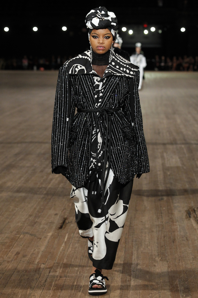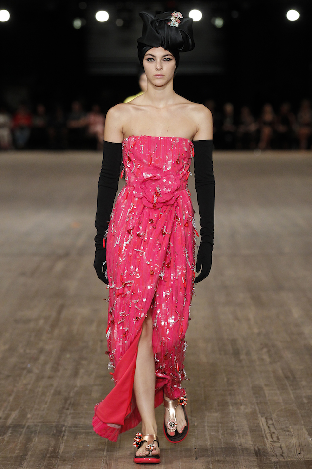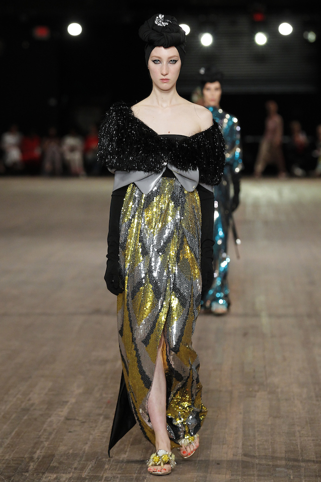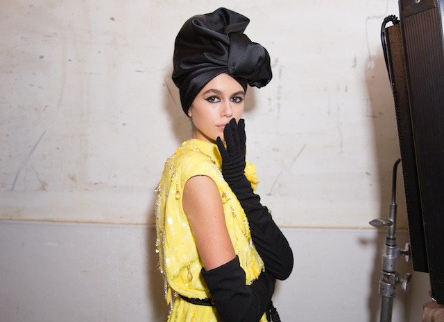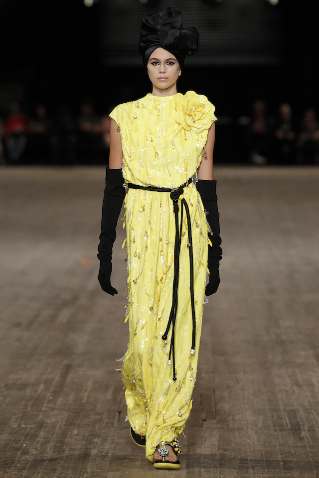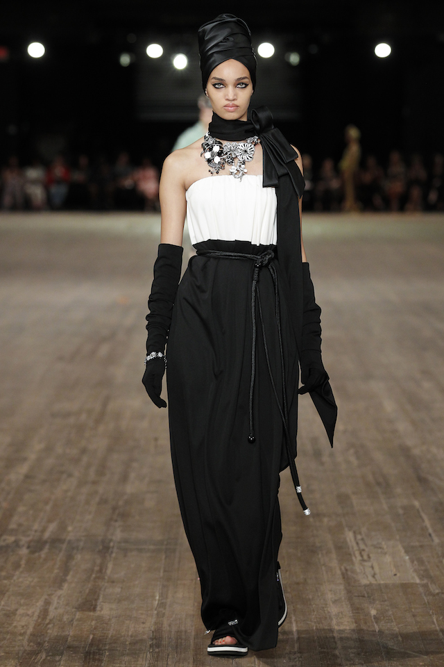 ショーで最も目を惹くのは、56ルック全てでモデルが被っているターバンだ。2009年の Met Gala (メット・ガラ) で Marc Jacobs と共にレッドカーペットを歩いた Kate Moss (ケイト・モス) が披露した伝説的なターバン姿や『The Wall Street Journal (ウォール・ストリート・ジャーナル)』で Sophia Coppola (ソフィア・コッポラ) のポートレイトなどからインスパイアを得たというヘッドピースを手掛けたのは、「世界で最も美しい帽子メーカー」と称されるデザイナーの Stephen Jones (スティーブン・ジョーンズ )。それぞれ巻き方にも意匠が凝らされており、天才デザイナーふたりの並ならないこだわりを感じることが出来るアイテムだ。