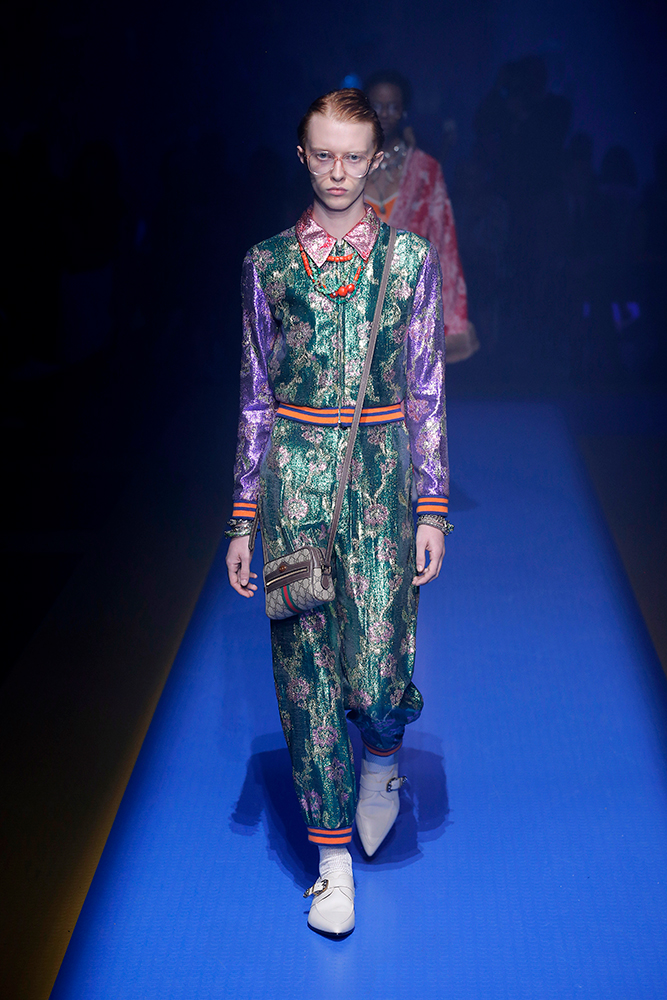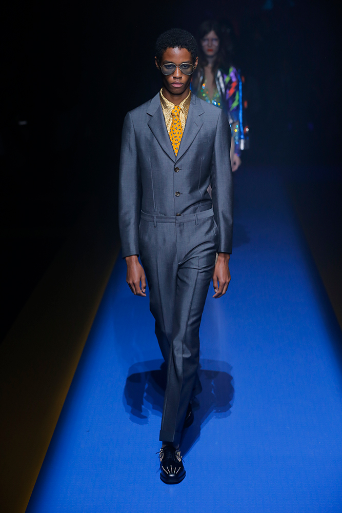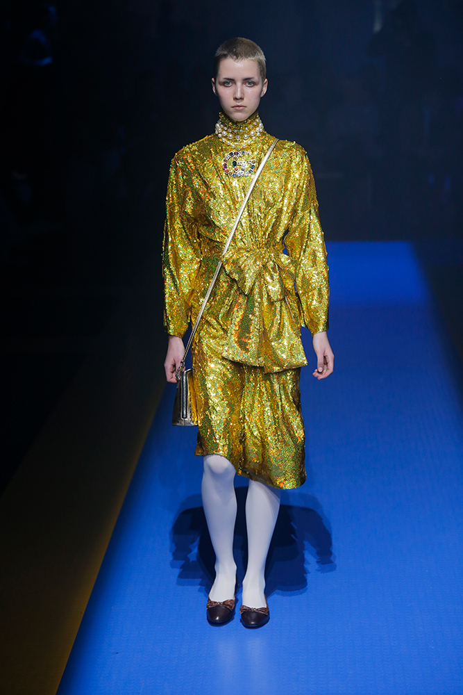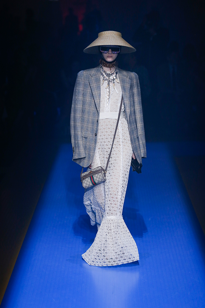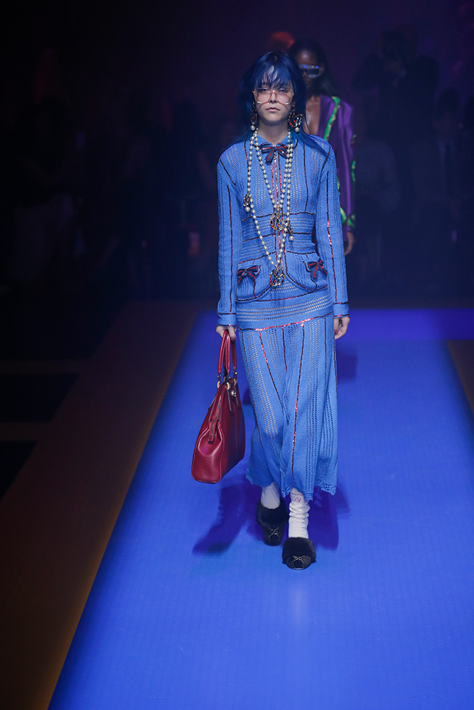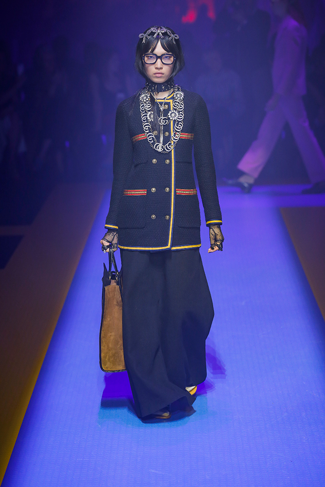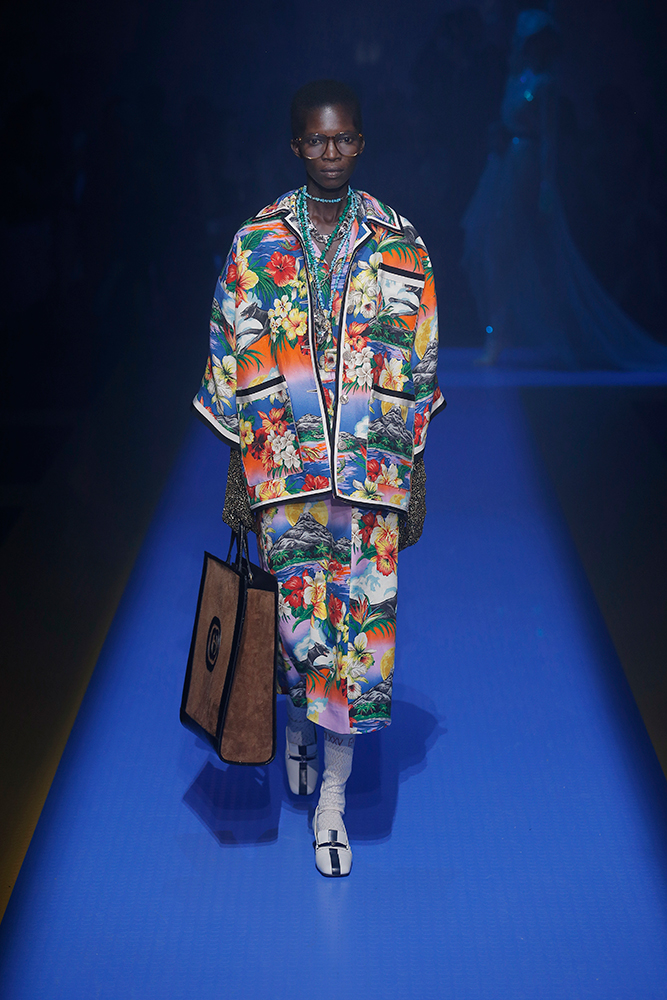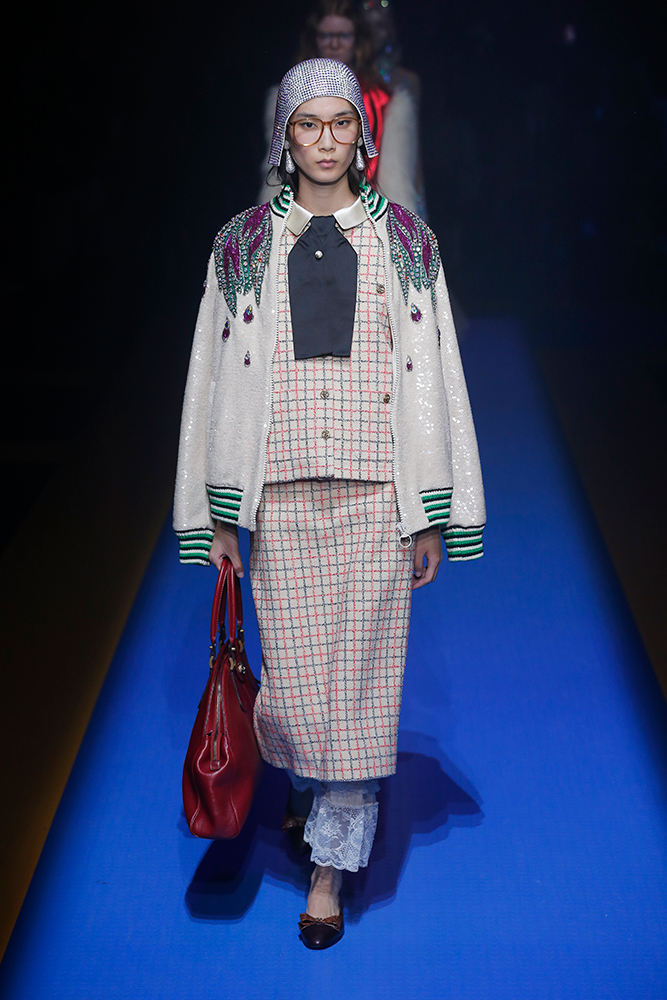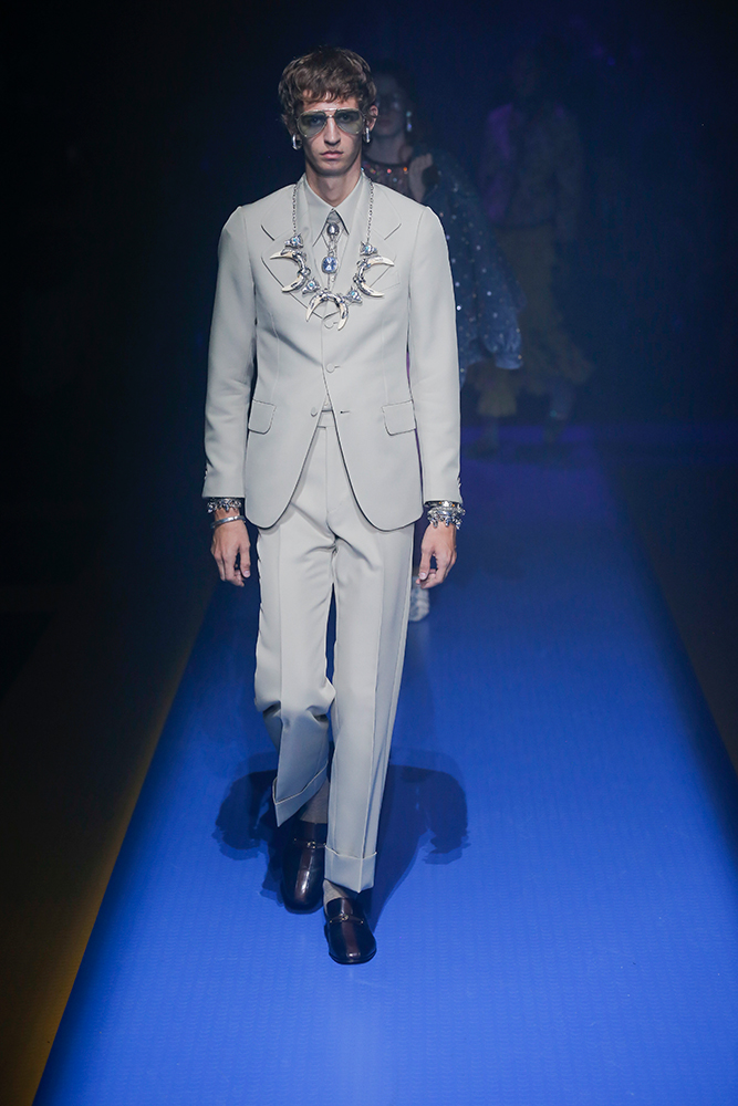メンズ、ウィメンズ合わせて107ルックのモデルたちは青やピンクの光線が光る中、足早に歩く。 テーラーリングにフォーカスしたルックが多く見られる。70 年代風グリッタードレスや 80 年代のコンケープドショルダーなど時代のキーアイテムが登場するが、どれも今の Gucci だ。トリコロールカラーのニットアンサンブルスーツ、プリントドレスもアイコニックなアイテムだ。ロゴアイテム、テキスタイルが増え、GG マークのレースは甘すぎずに新鮮だ。クリエイティブ・ディレクターの Alessandro Michele (アレッサンドロ・ミケーレ) はかつてのインタビューで「僕には流行遅れの服はない。好きな服はいつまでも着ればいい」と語った。