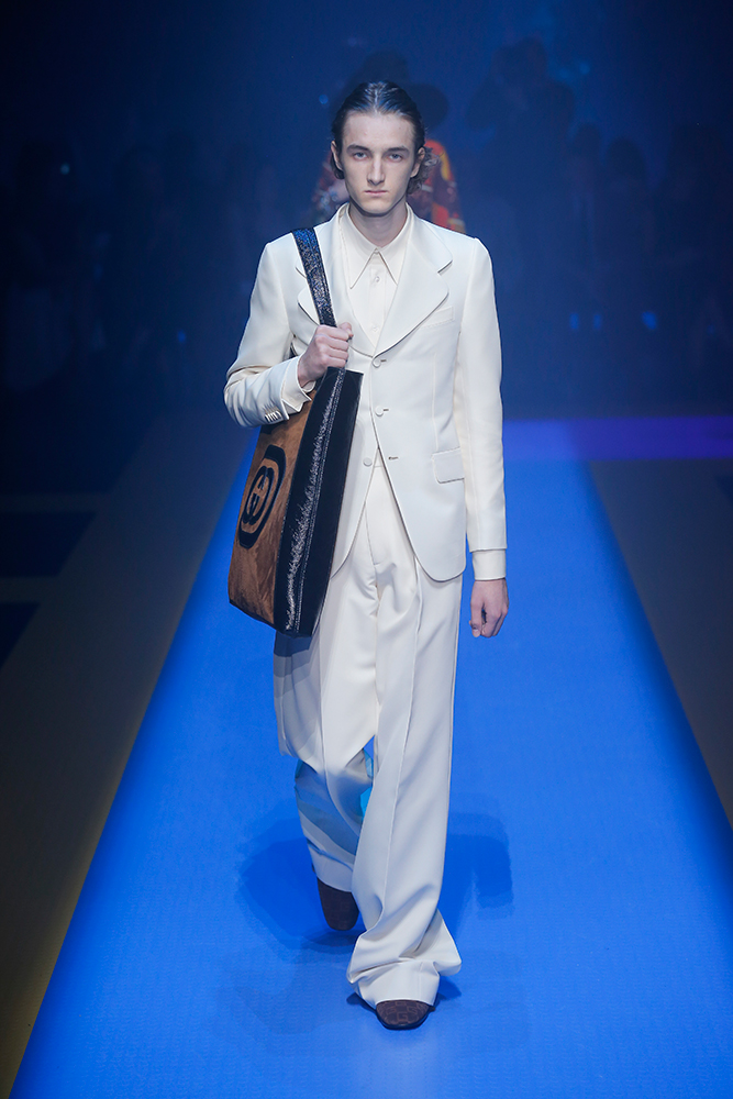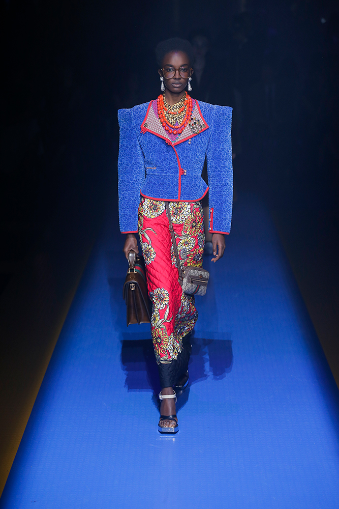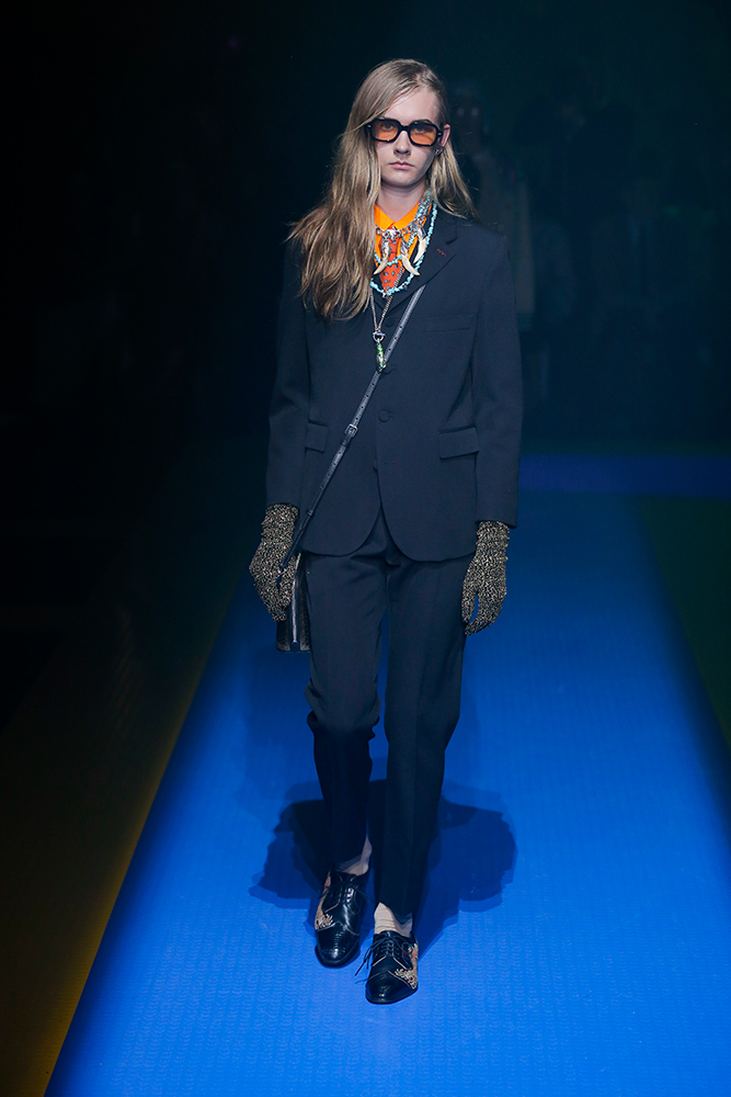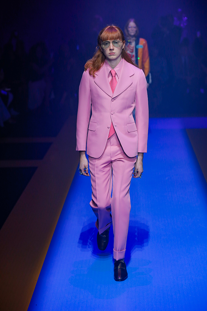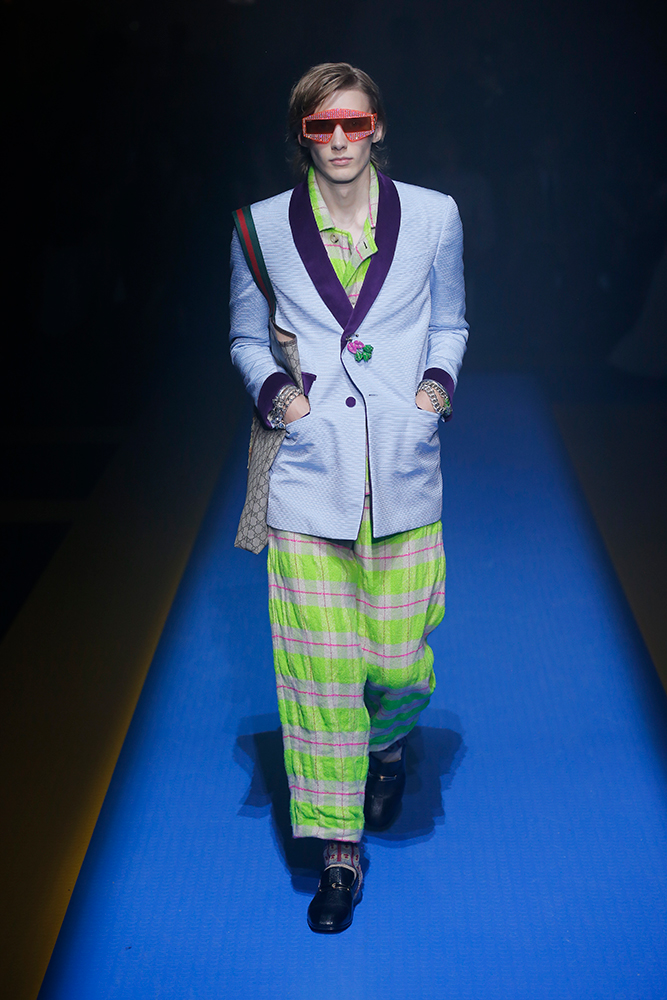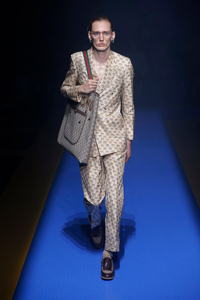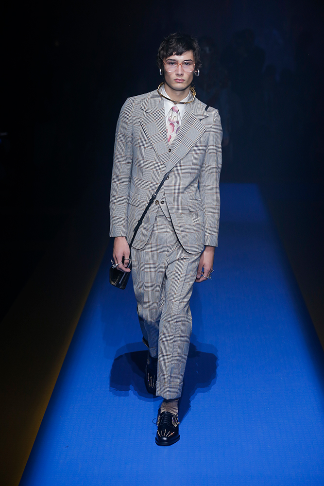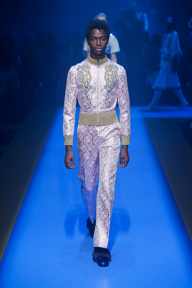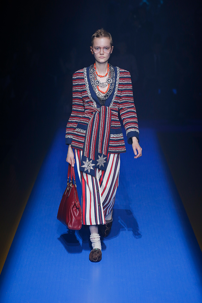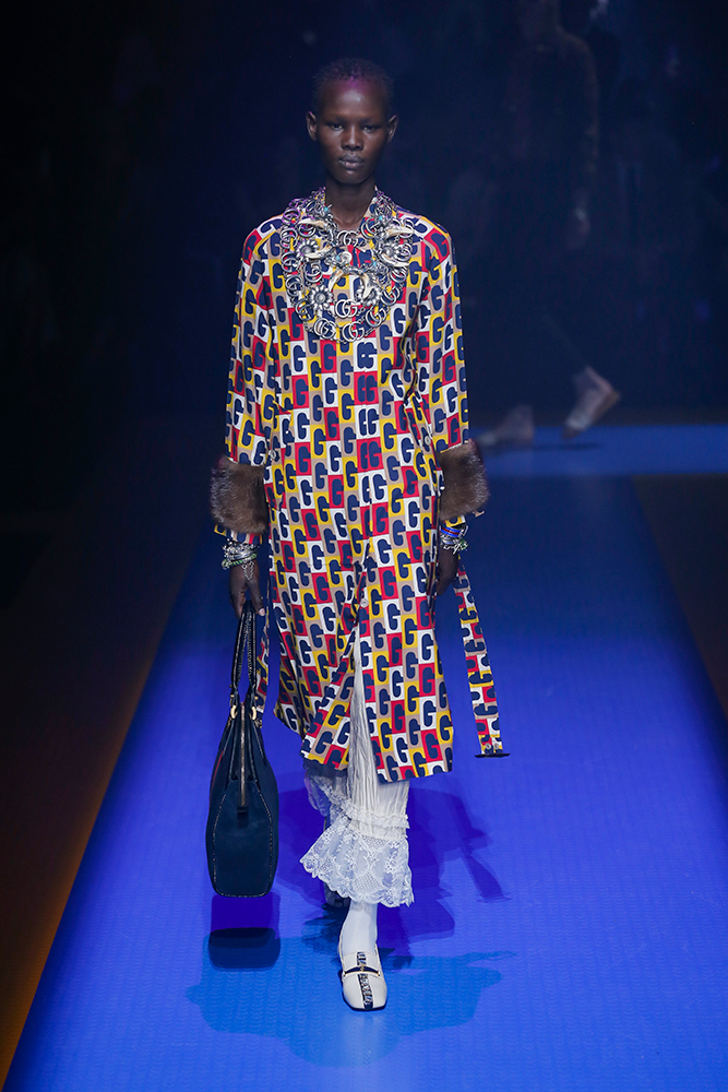 メンズ、ウィメンズ合わせて107ルックのモデルたちは青やピンクの光線が光る中、足早に歩く。 テーラーリングにフォーカスしたルックが多く見られる。70 年代風グリッタードレスや 80 年代のコンケープドショルダーなど時代のキーアイテムが登場するが、どれも今の Gucci だ。トリコロールカラーのニットアンサンブルスーツ、プリントドレスもアイコニックなアイテムだ。ロゴアイテム、テキスタイルが増え、GG マークのレースは甘すぎずに新鮮だ。クリエイティブ・ディレクターの Alessandro Michele (アレッサンドロ・ミケーレ) はかつてのインタビューで「僕には流行遅れの服はない。好きな服はいつまでも着ればいい」と語った。