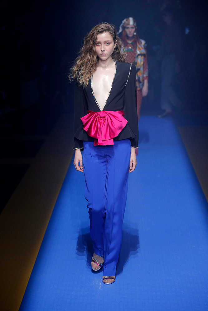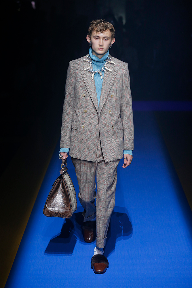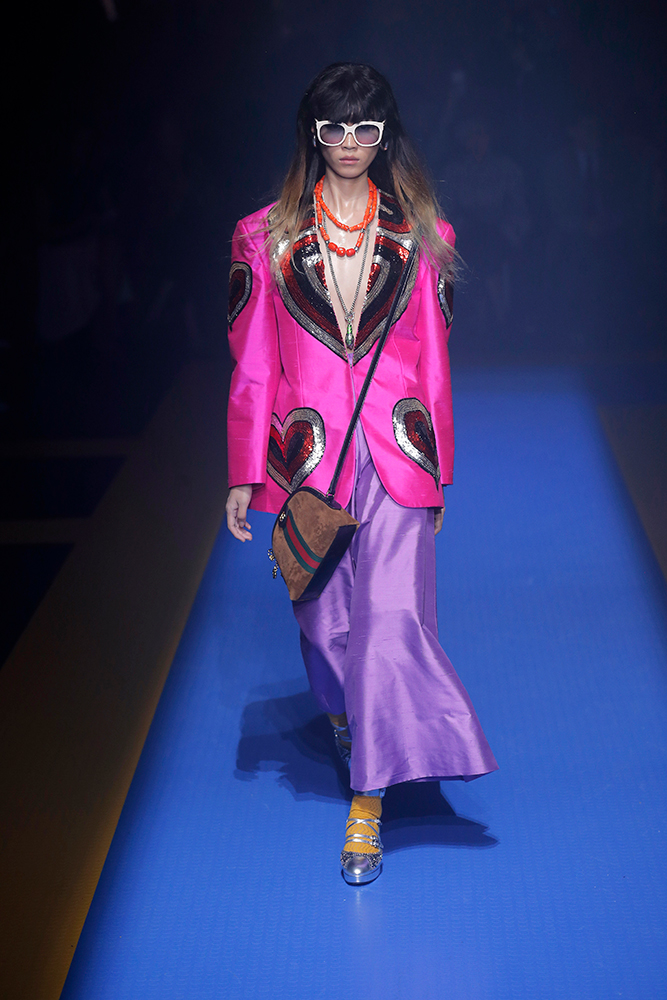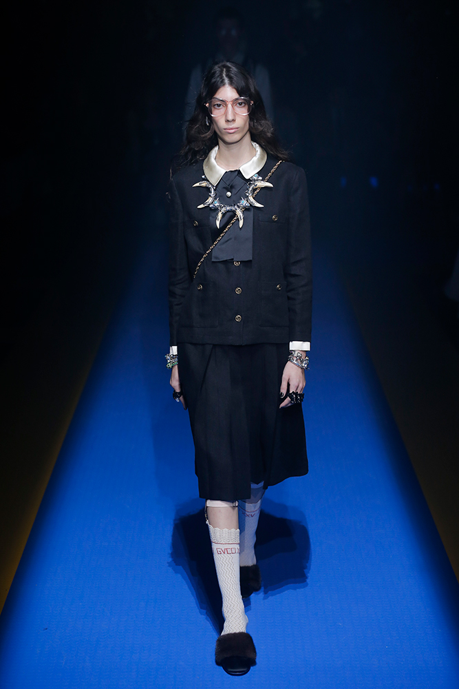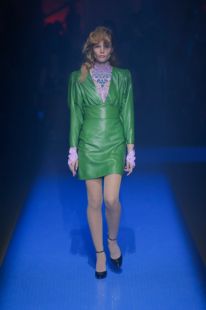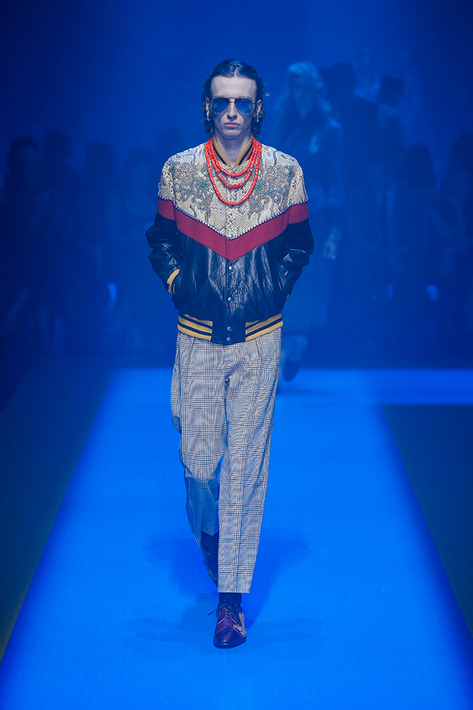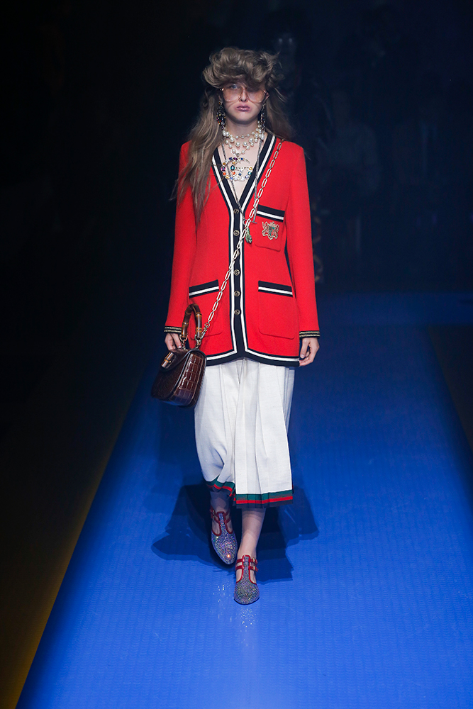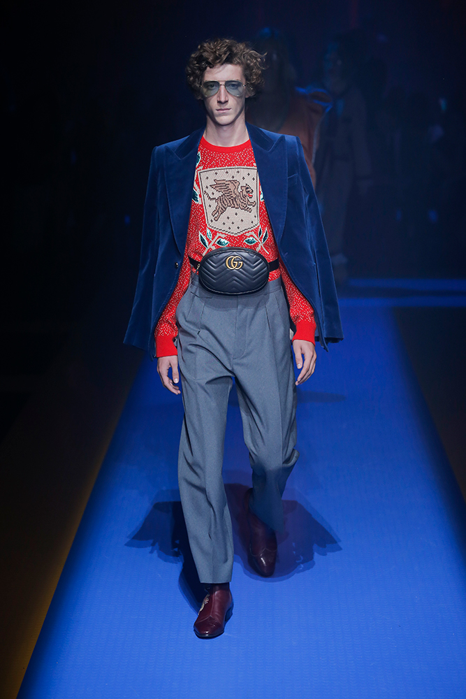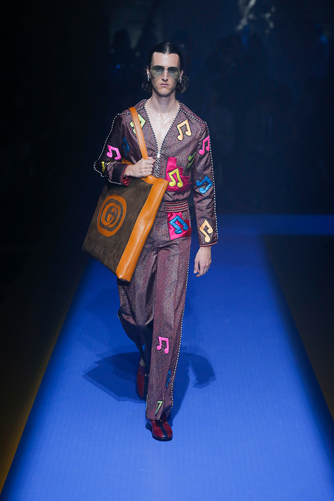 メンズ、ウィメンズ合わせて107ルックのモデルたちは青やピンクの光線が光る中、足早に歩く。 テーラーリングにフォーカスしたルックが多く見られる。70 年代風グリッタードレスや 80 年代のコンケープドショルダーなど時代のキーアイテムが登場するが、どれも今の Gucci だ。トリコロールカラーのニットアンサンブルスーツ、プリントドレスもアイコニックなアイテムだ。ロゴアイテム、テキスタイルが増え、GG マークのレースは甘すぎずに新鮮だ。クリエイティブ・ディレクターの Alessandro Michele (アレッサンドロ・ミケーレ) はかつてのインタビューで「僕には流行遅れの服はない。好きな服はいつまでも着ればいい」と語った。