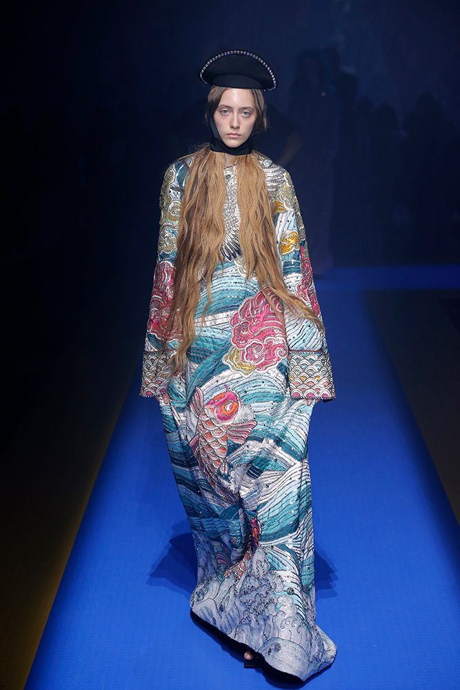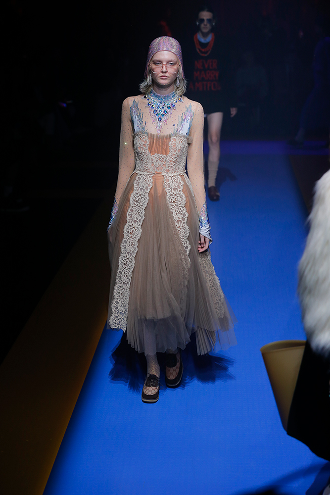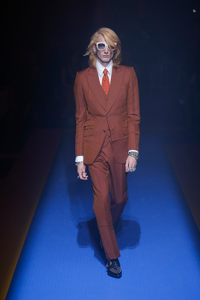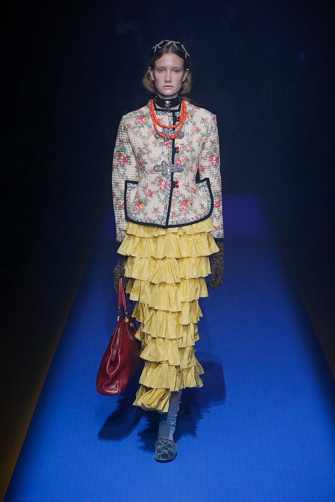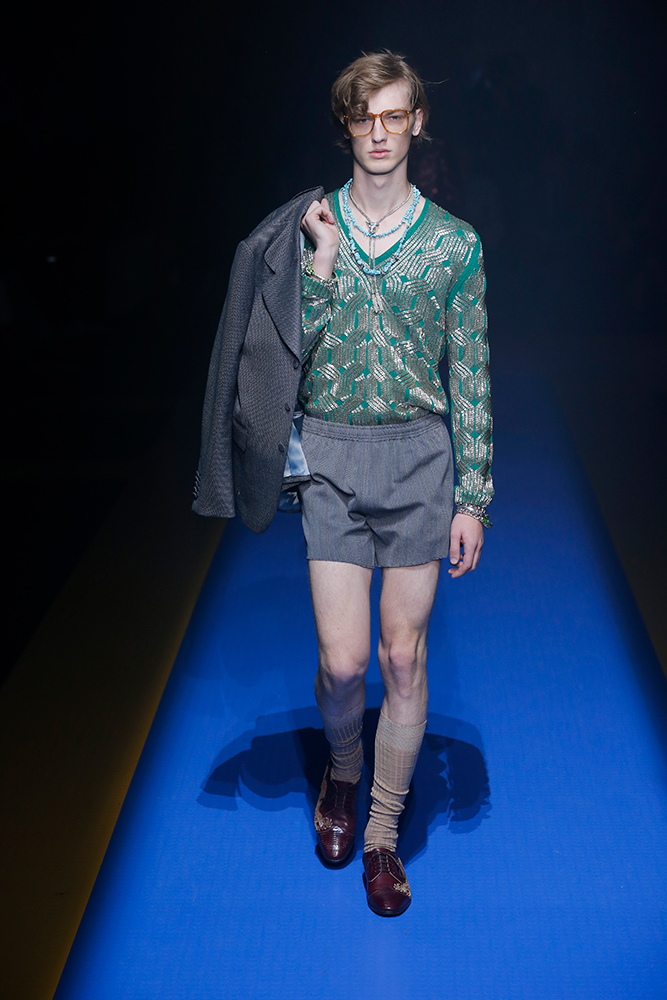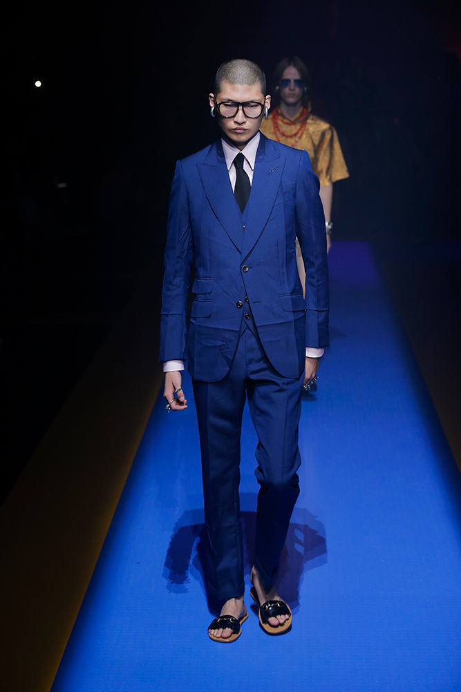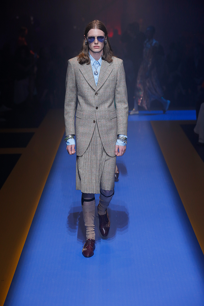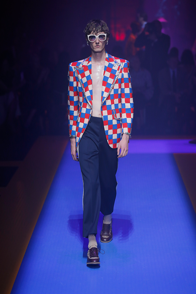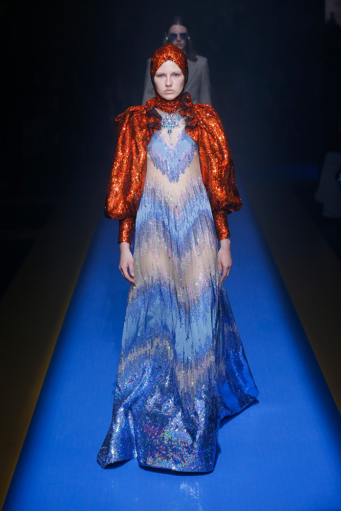 メンズ、ウィメンズ合わせて107ルックのモデルたちは青やピンクの光線が光る中、足早に歩く。 テーラーリングにフォーカスしたルックが多く見られる。70 年代風グリッタードレスや 80 年代のコンケープドショルダーなど時代のキーアイテムが登場するが、どれも今の Gucci だ。トリコロールカラーのニットアンサンブルスーツ、プリントドレスもアイコニックなアイテムだ。ロゴアイテム、テキスタイルが増え、GG マークのレースは甘すぎずに新鮮だ。クリエイティブ・ディレクターの Alessandro Michele (アレッサンドロ・ミケーレ) はかつてのインタビューで「僕には流行遅れの服はない。好きな服はいつまでも着ればいい」と語った。