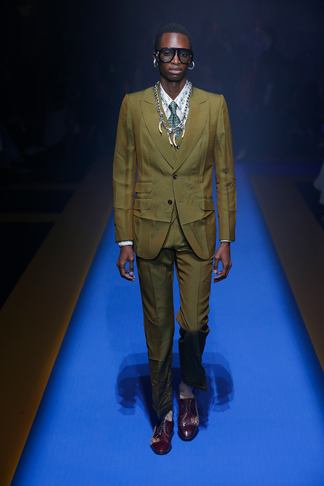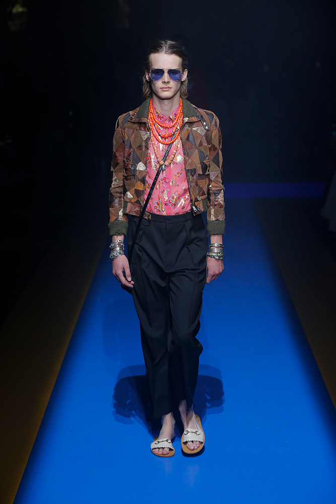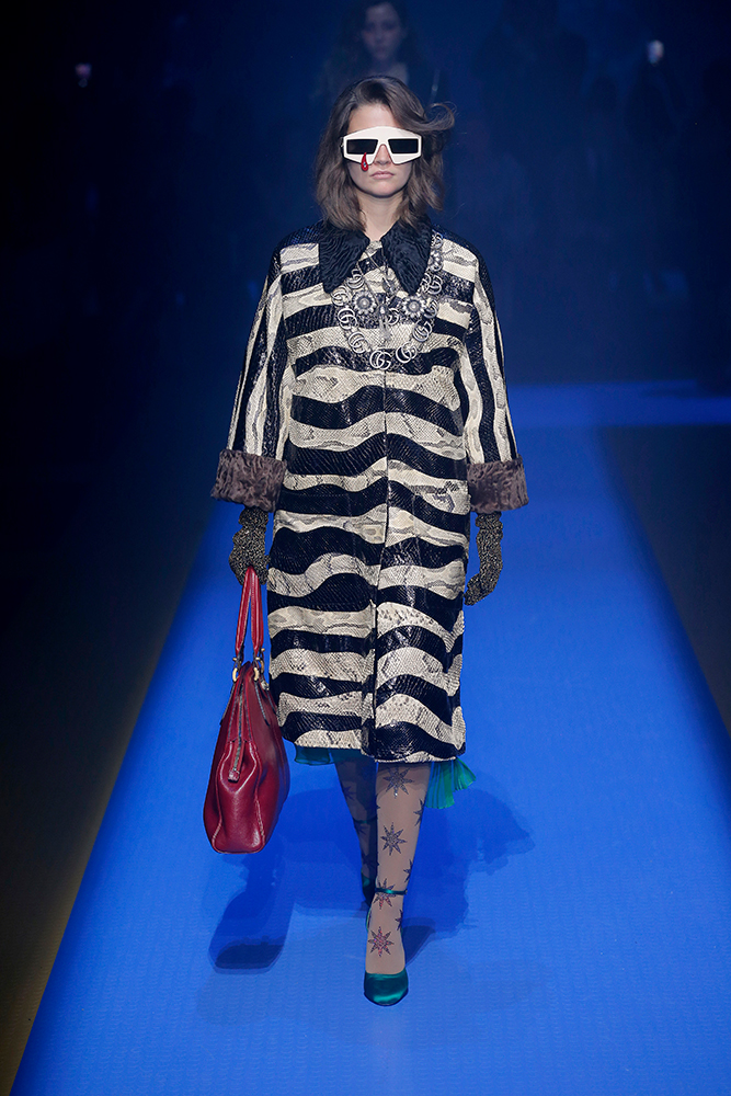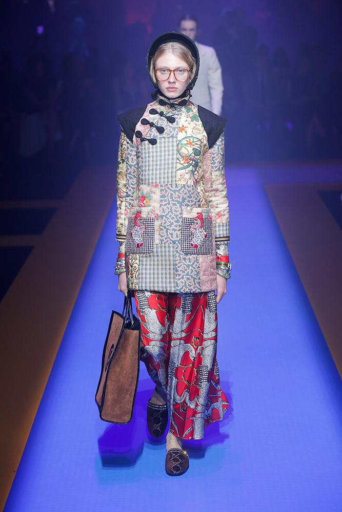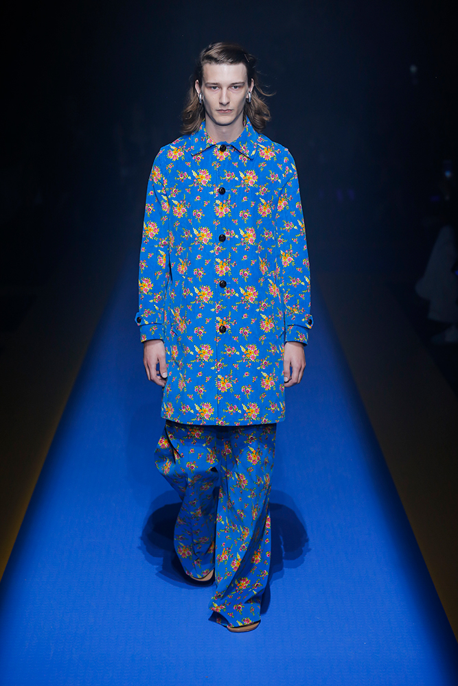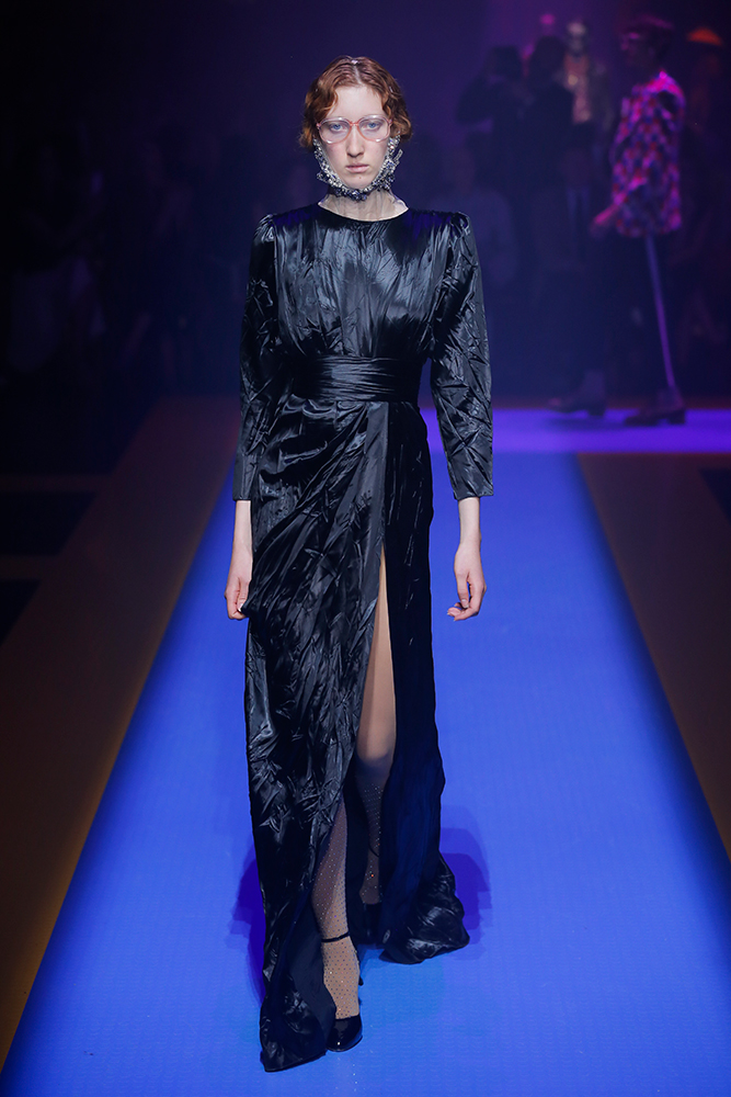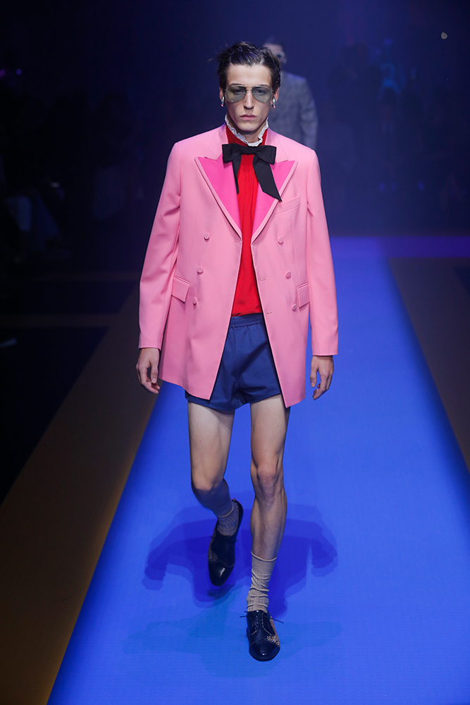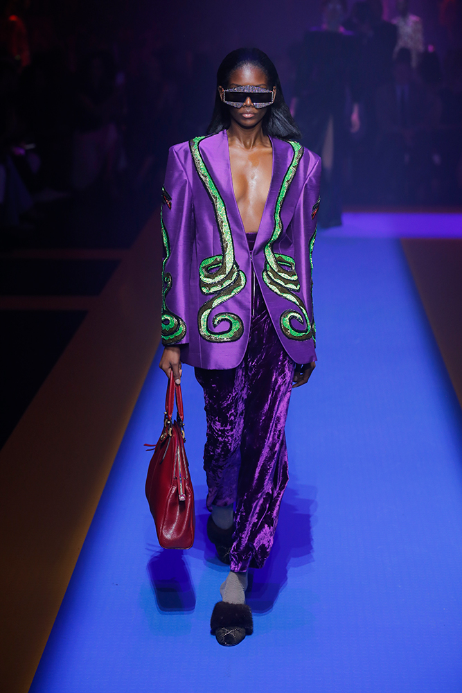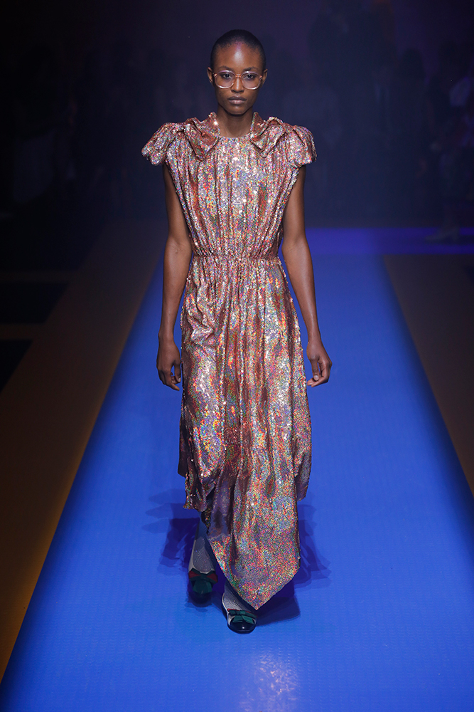メンズ、ウィメンズ合わせて107ルックのモデルたちは青やピンクの光線が光る中、足早に歩く。 テーラーリングにフォーカスしたルックが多く見られる。70 年代風グリッタードレスや 80 年代のコンケープドショルダーなど時代のキーアイテムが登場するが、どれも今の Gucci だ。トリコロールカラーのニットアンサンブルスーツ、プリントドレスもアイコニックなアイテムだ。ロゴアイテム、テキスタイルが増え、GG マークのレースは甘すぎずに新鮮だ。クリエイティブ・ディレクターの Alessandro Michele (アレッサンドロ・ミケーレ) はかつてのインタビューで「僕には流行遅れの服はない。好きな服はいつまでも着ればいい」と語った。