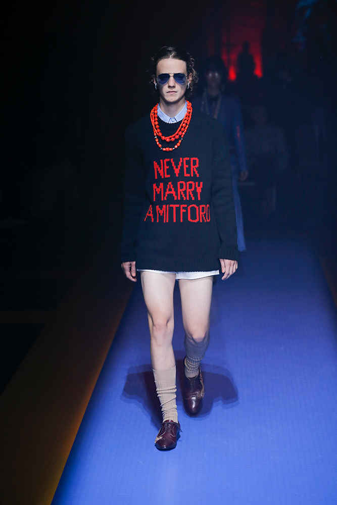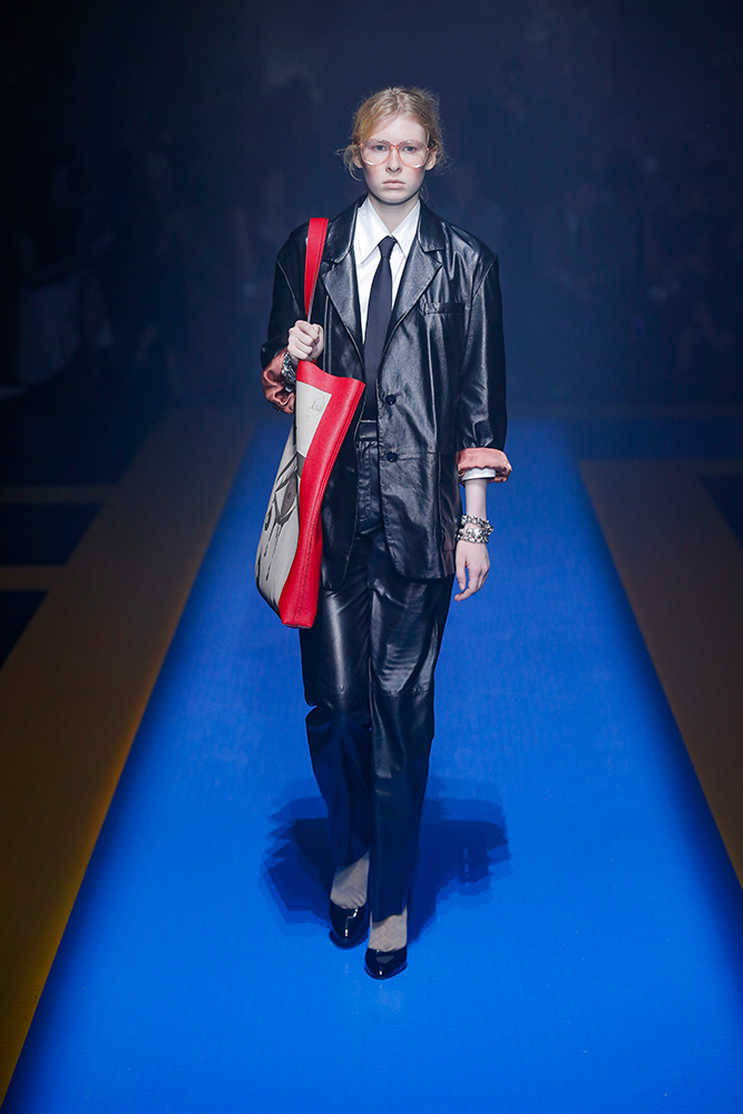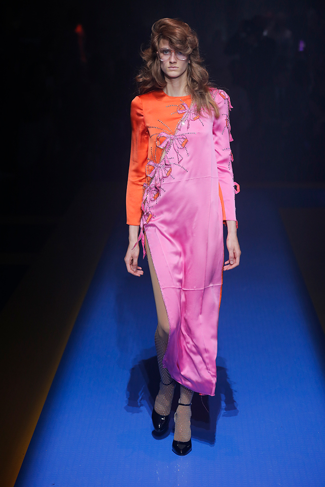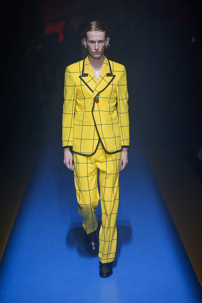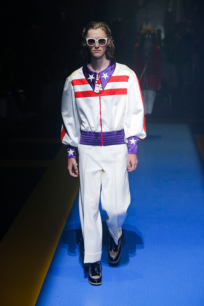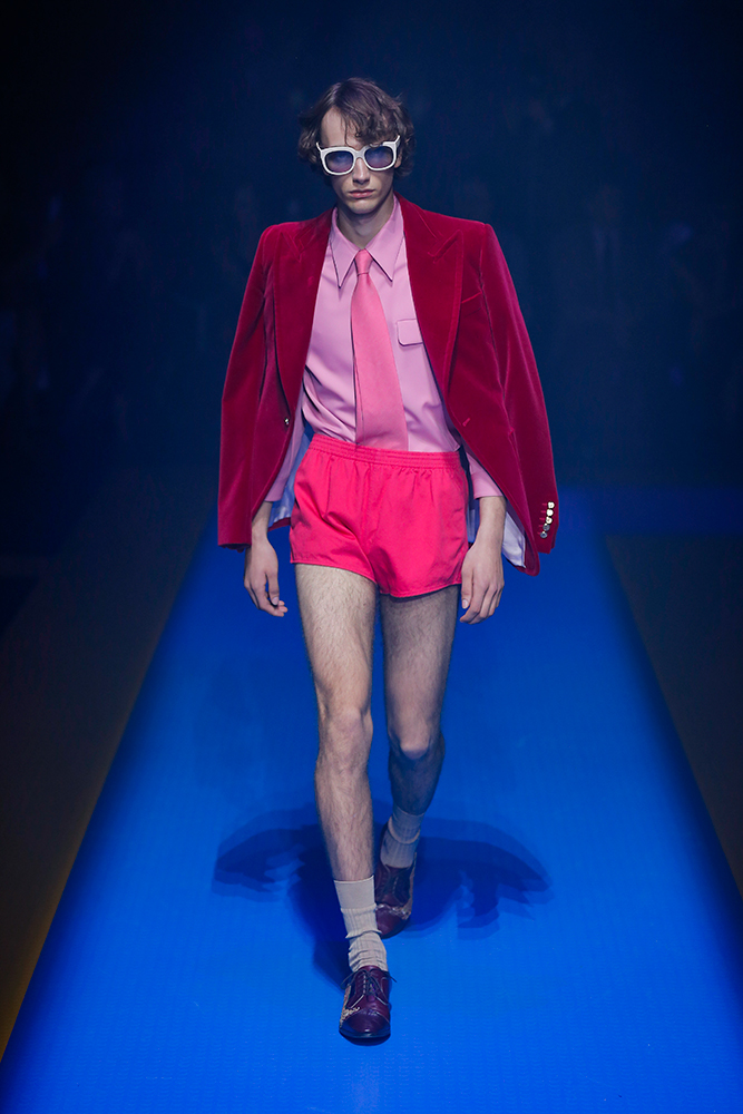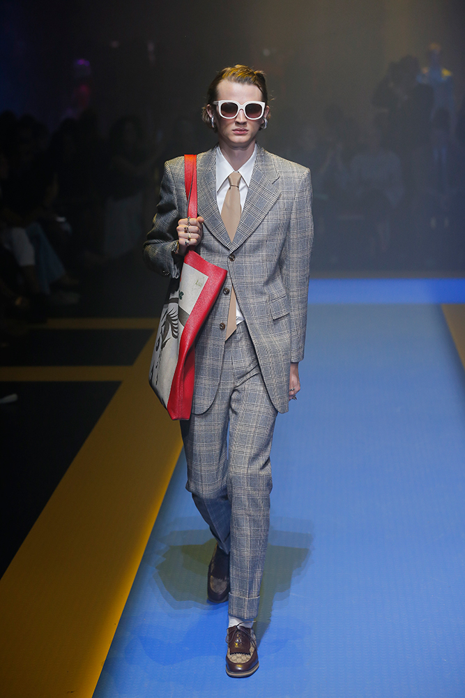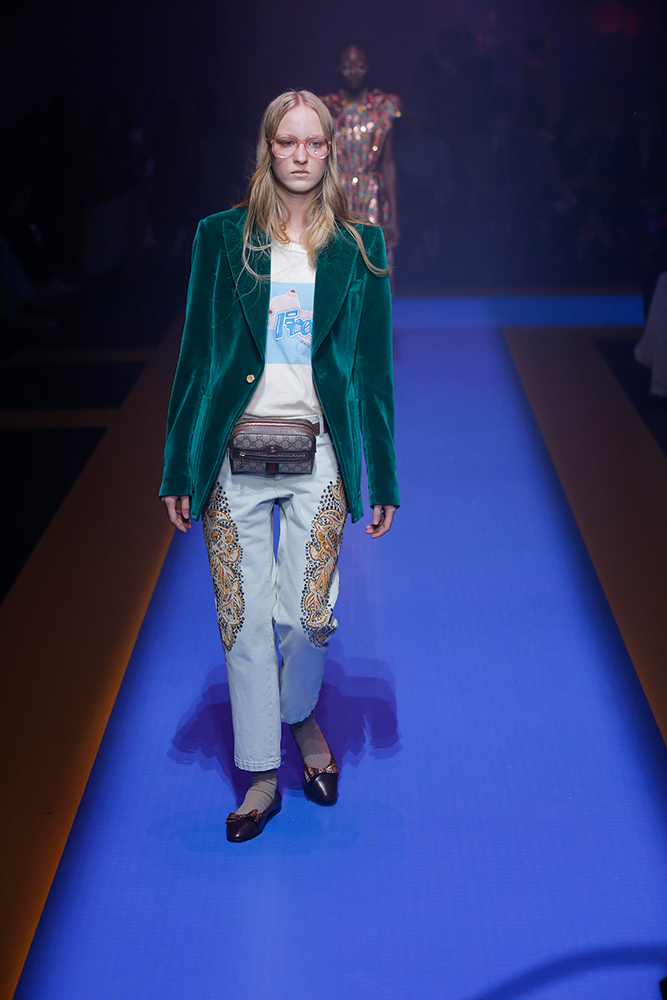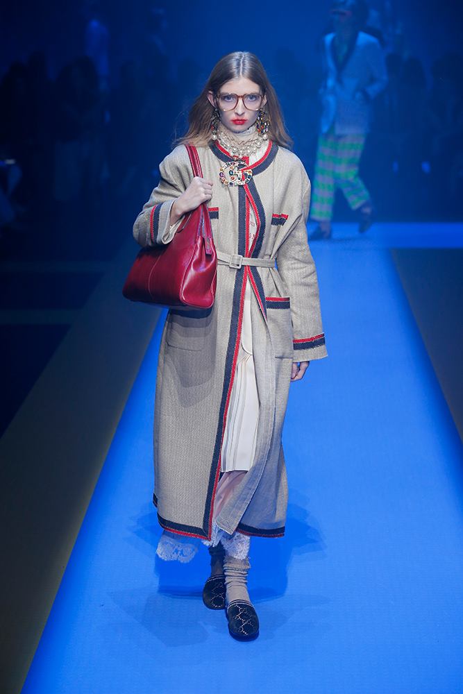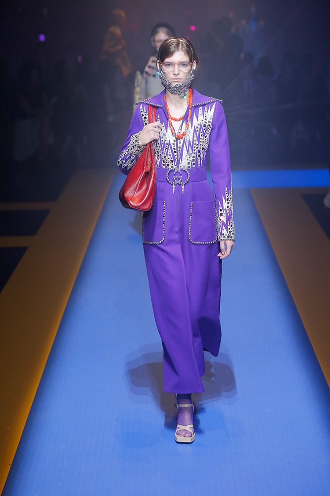 メンズ、ウィメンズ合わせて107ルックのモデルたちは青やピンクの光線が光る中、足早に歩く。 テーラーリングにフォーカスしたルックが多く見られる。70 年代風グリッタードレスや 80 年代のコンケープドショルダーなど時代のキーアイテムが登場するが、どれも今の Gucci だ。トリコロールカラーのニットアンサンブルスーツ、プリントドレスもアイコニックなアイテムだ。ロゴアイテム、テキスタイルが増え、GG マークのレースは甘すぎずに新鮮だ。クリエイティブ・ディレクターの Alessandro Michele (アレッサンドロ・ミケーレ) はかつてのインタビューで「僕には流行遅れの服はない。好きな服はいつまでも着ればいい」と語った。