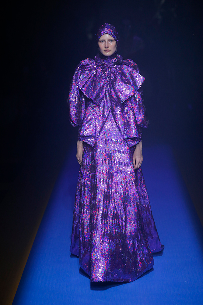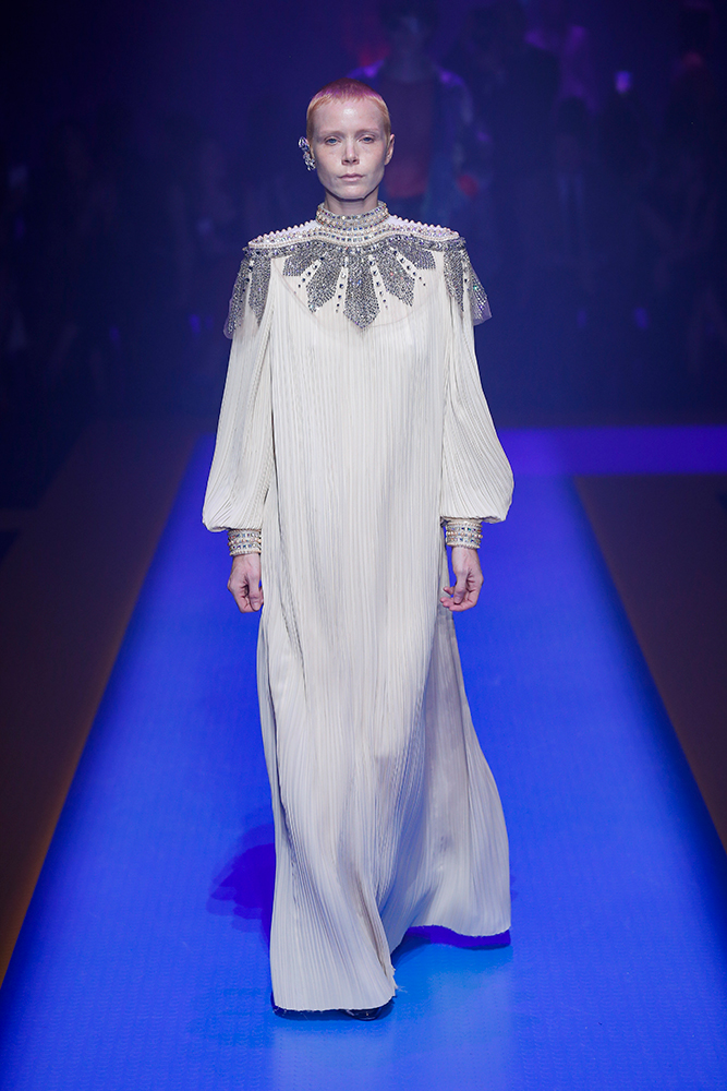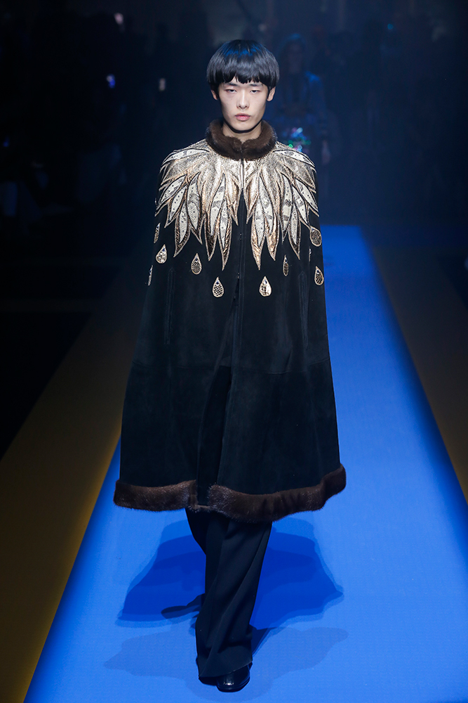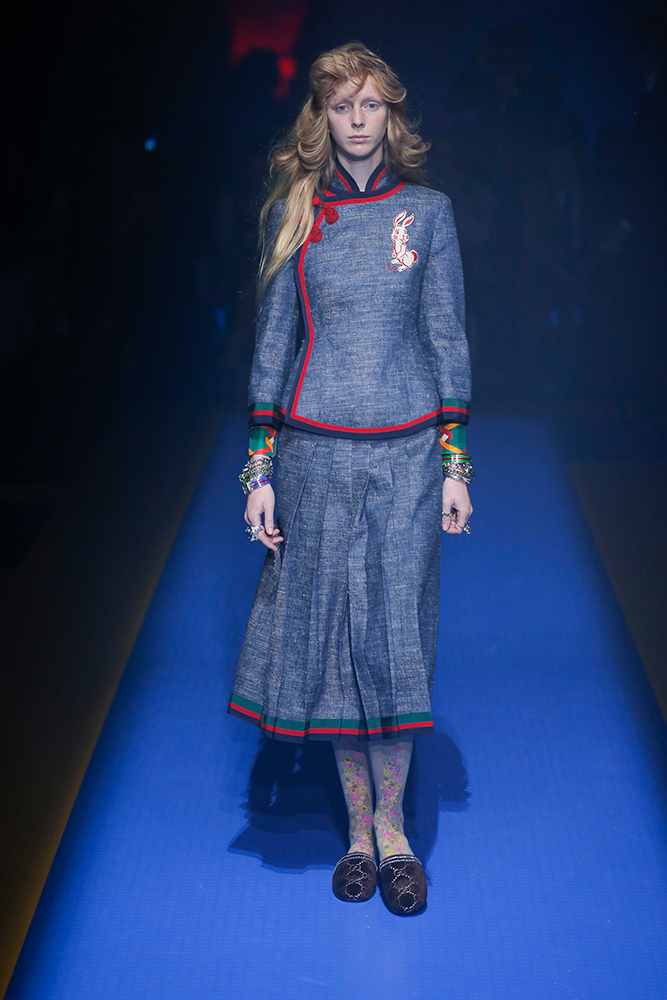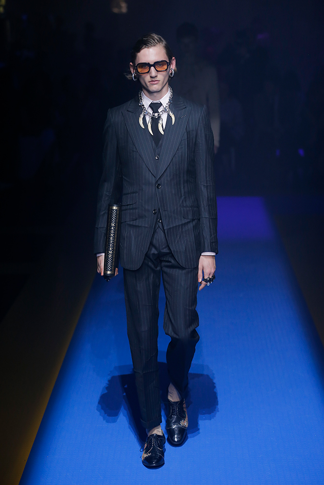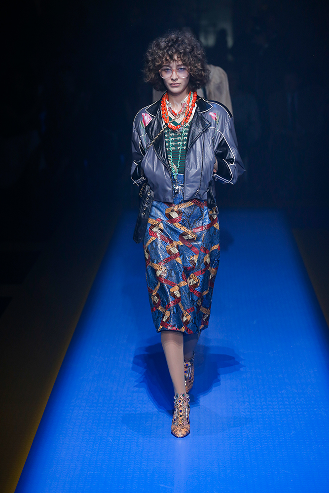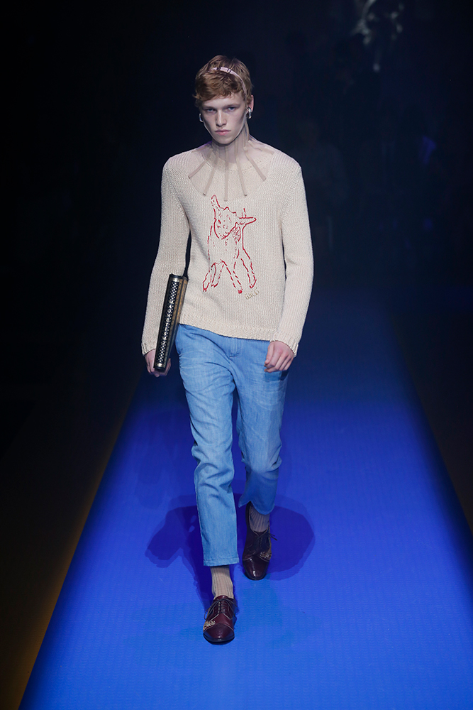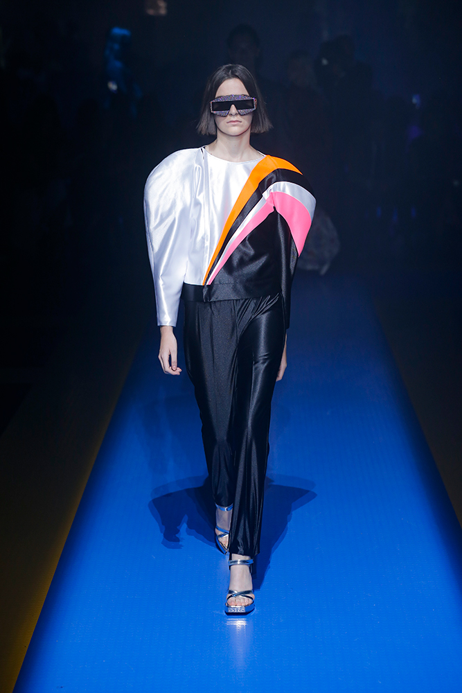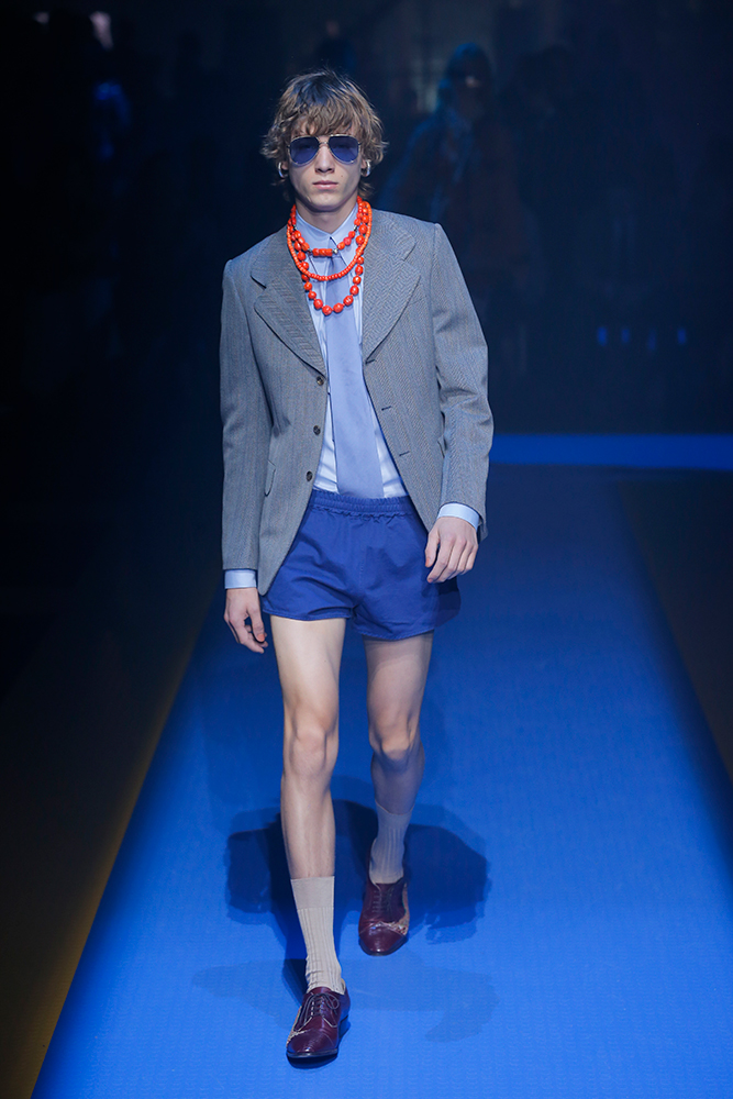 メンズ、ウィメンズ合わせて107ルックのモデルたちは青やピンクの光線が光る中、足早に歩く。 テーラーリングにフォーカスしたルックが多く見られる。70 年代風グリッタードレスや 80 年代のコンケープドショルダーなど時代のキーアイテムが登場するが、どれも今の Gucci だ。トリコロールカラーのニットアンサンブルスーツ、プリントドレスもアイコニックなアイテムだ。ロゴアイテム、テキスタイルが増え、GG マークのレースは甘すぎずに新鮮だ。クリエイティブ・ディレクターの Alessandro Michele (アレッサンドロ・ミケーレ) はかつてのインタビューで「僕には流行遅れの服はない。好きな服はいつまでも着ればいい」と語った。