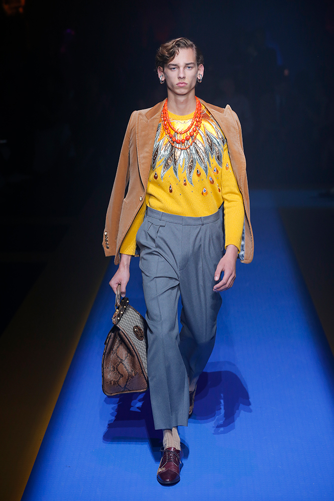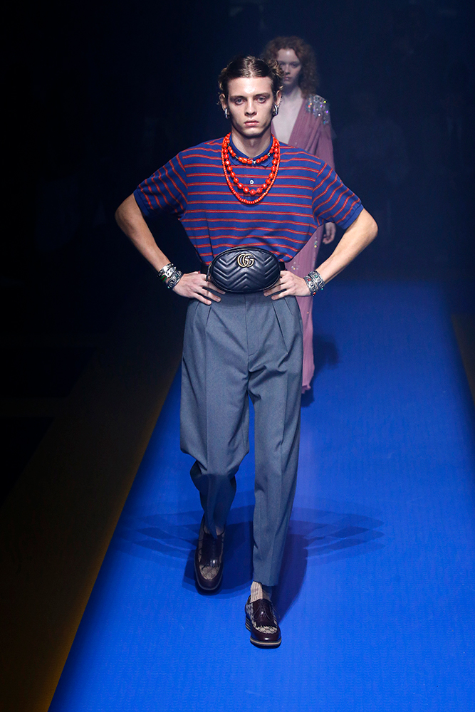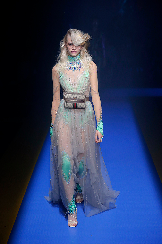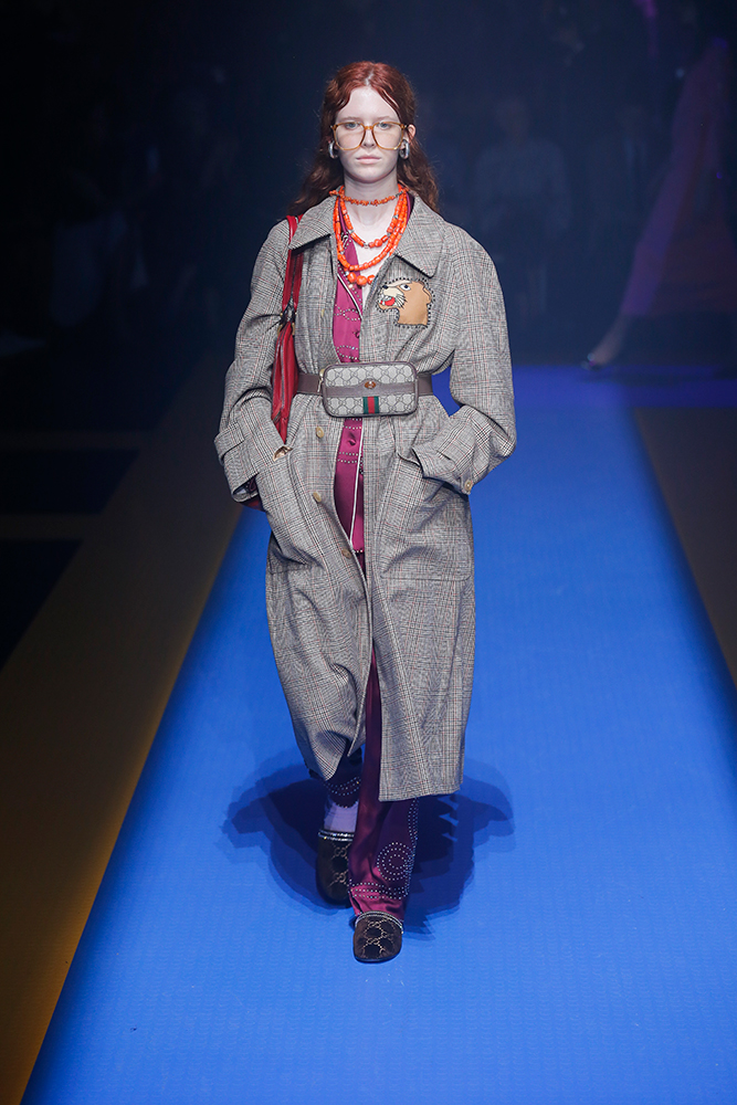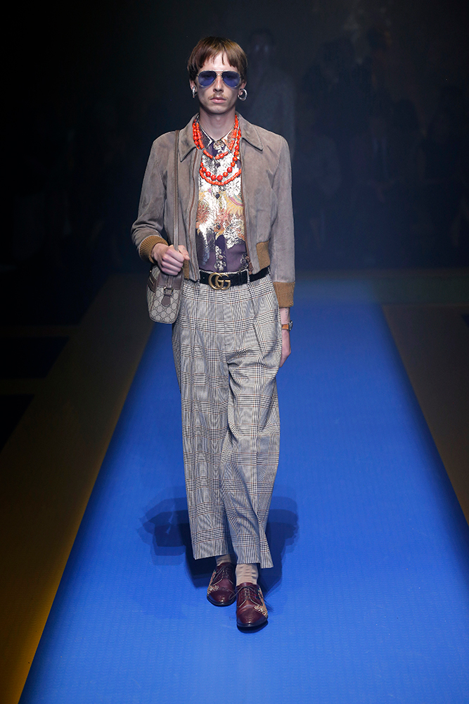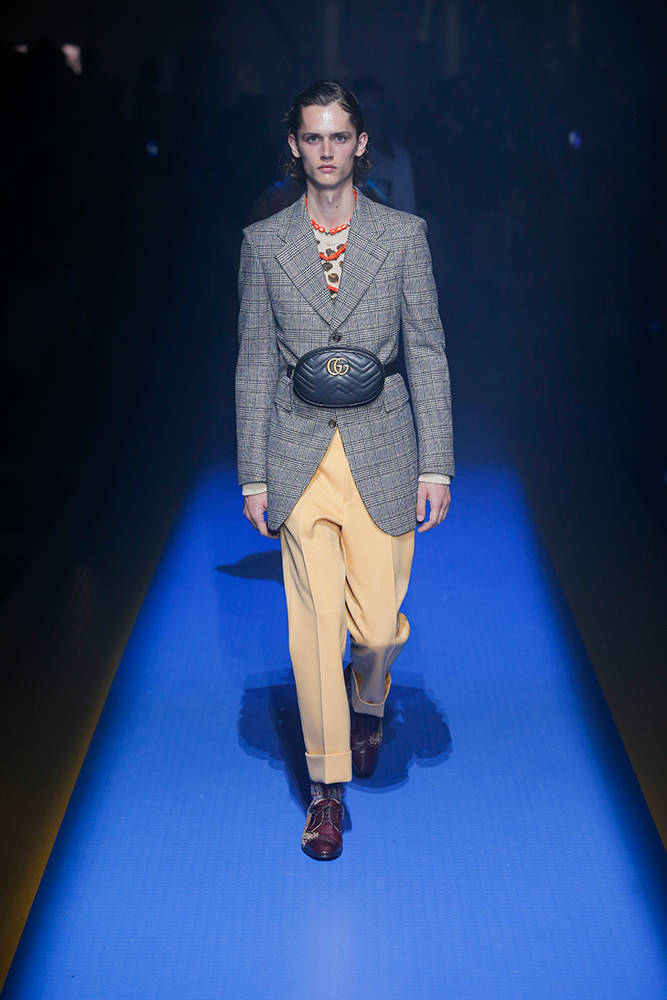 新作ベルトポーチバッグや重ね付けしたネックレス、アクセサリーがコーディネイトにアクセントを添える。クラシックアイテムがリアルに、モダンに、新鮮に目に飛び込んでくる。ショーでは「GUCCY」を感じ取ってほしいのか、ディテールよりそのパワー、登場するルックから感じるファッションの楽しさに圧倒される。まさに Gucci のマジックだ。