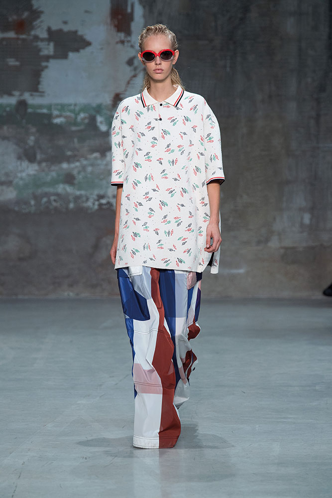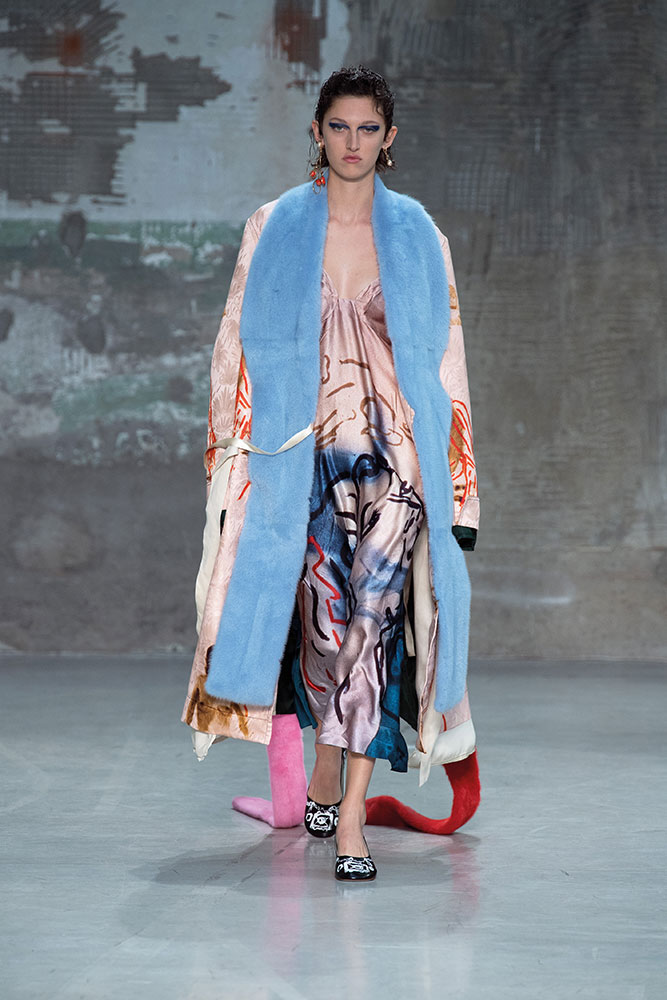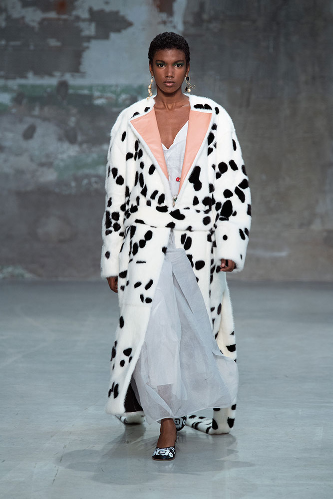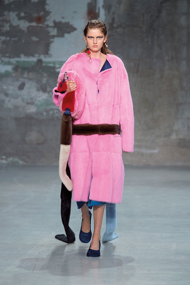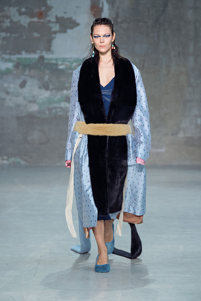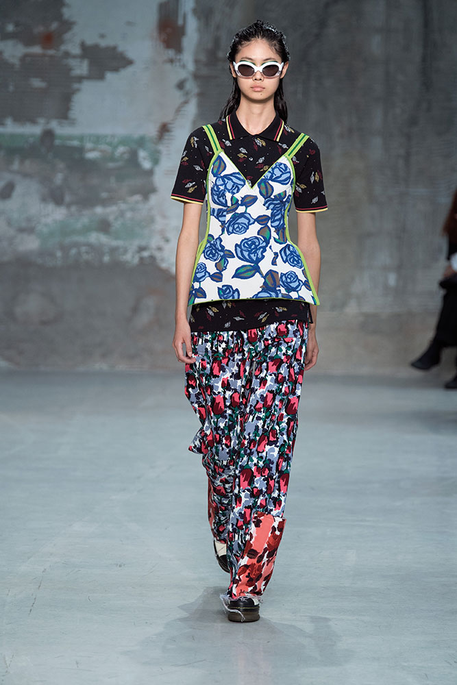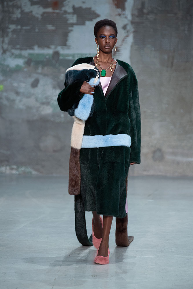 ビッグシルエットのポロニットにワイドパンツの組み合わせは新鮮だ。テーマは「宝探し」花咲く木の茂みの中から、部屋の片隅に置いてあるトランクの中から、少女が宝物を見つけ出すようなワクワク感でいろんな時代のディテールを組み合わせている。オーガンジーのプリントドレスに刺しゅうドレスを重ね、ミンクコートをガウンのように羽織る。ポップで楽しいマルニの世界が蘇った。