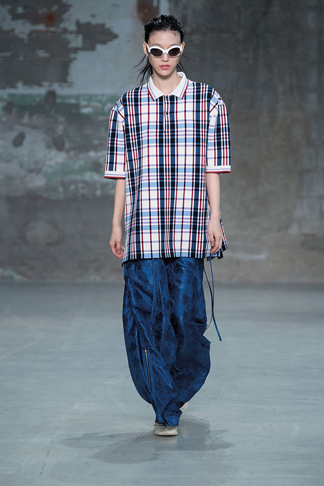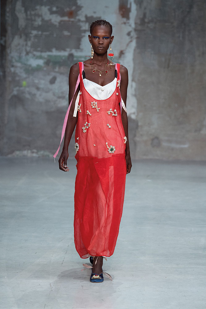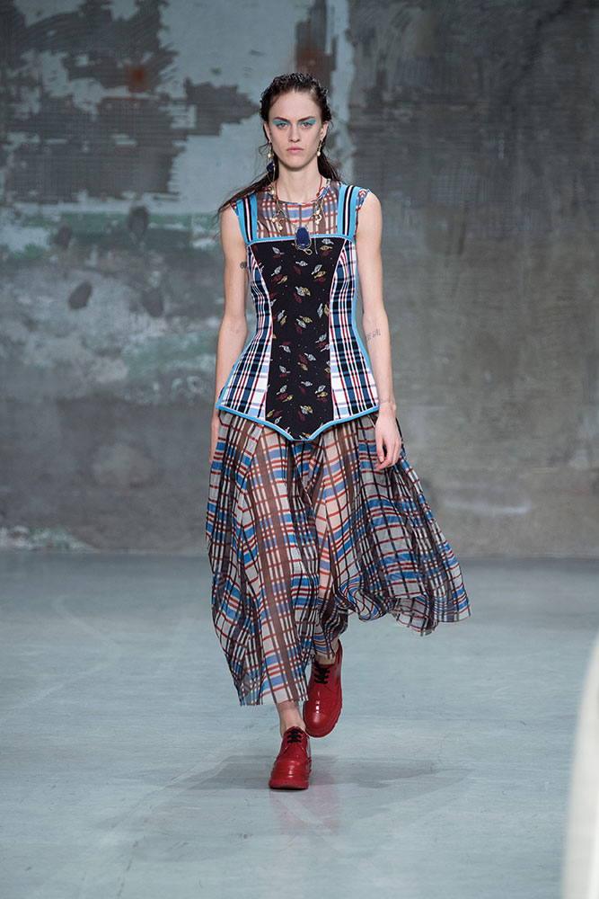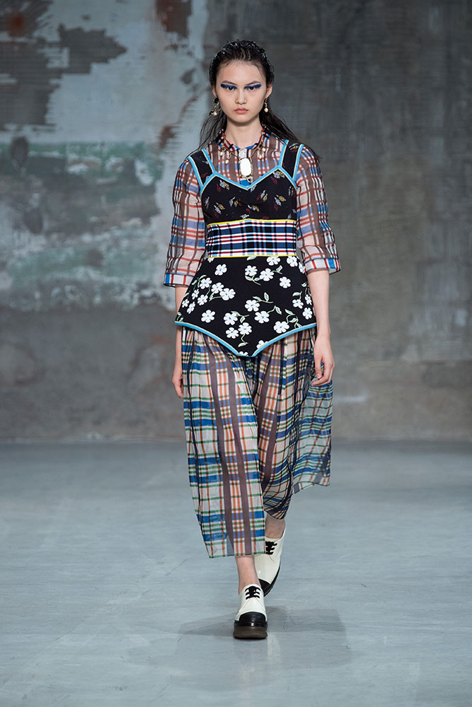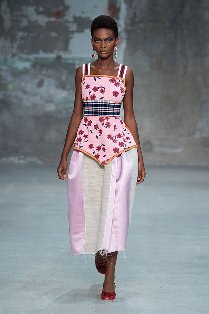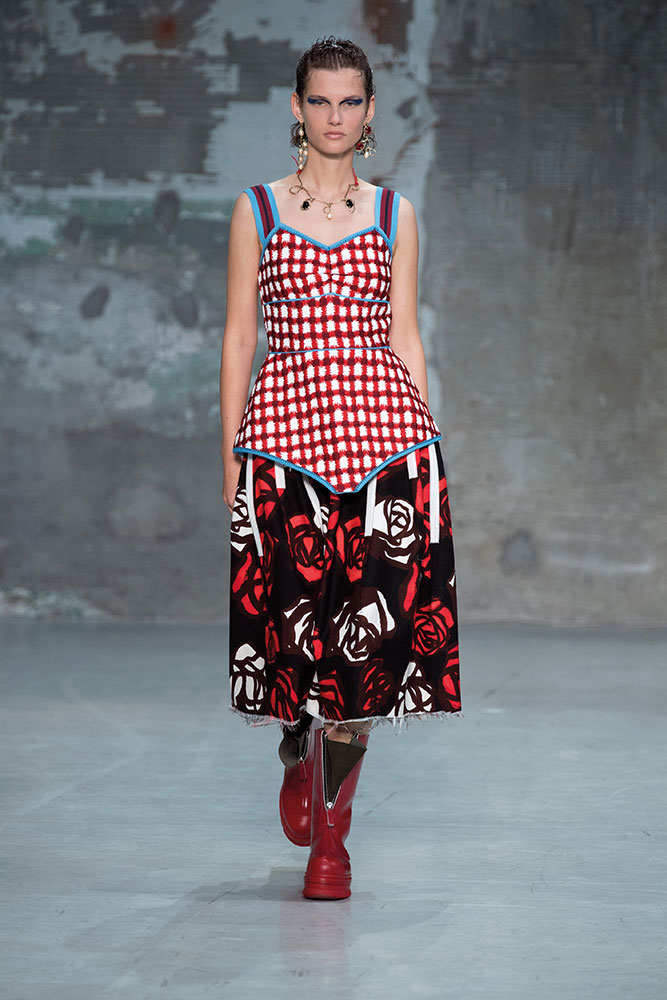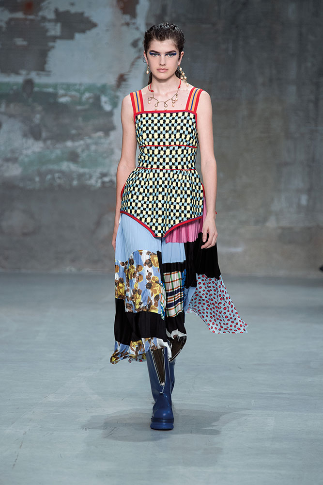 花柄プリント、ジャガード、チェックを接ぎ合わせたビスチュエトップとギャザーいっぱいの膨らんだスカートは50年代スタイルだ。グリン、ブルー、レッド、ピンクとカラーパレットが炸裂する。50年代の水着をモチーフにしたトップスもウエストシェイプを強調したフェミニンなシルエットに収められている。チェックのシースルードレスにも重ねられコルセットのように女性らしさを強調する。色を剥ぎ、柄を重ね、レイヤードで遊ぶ。