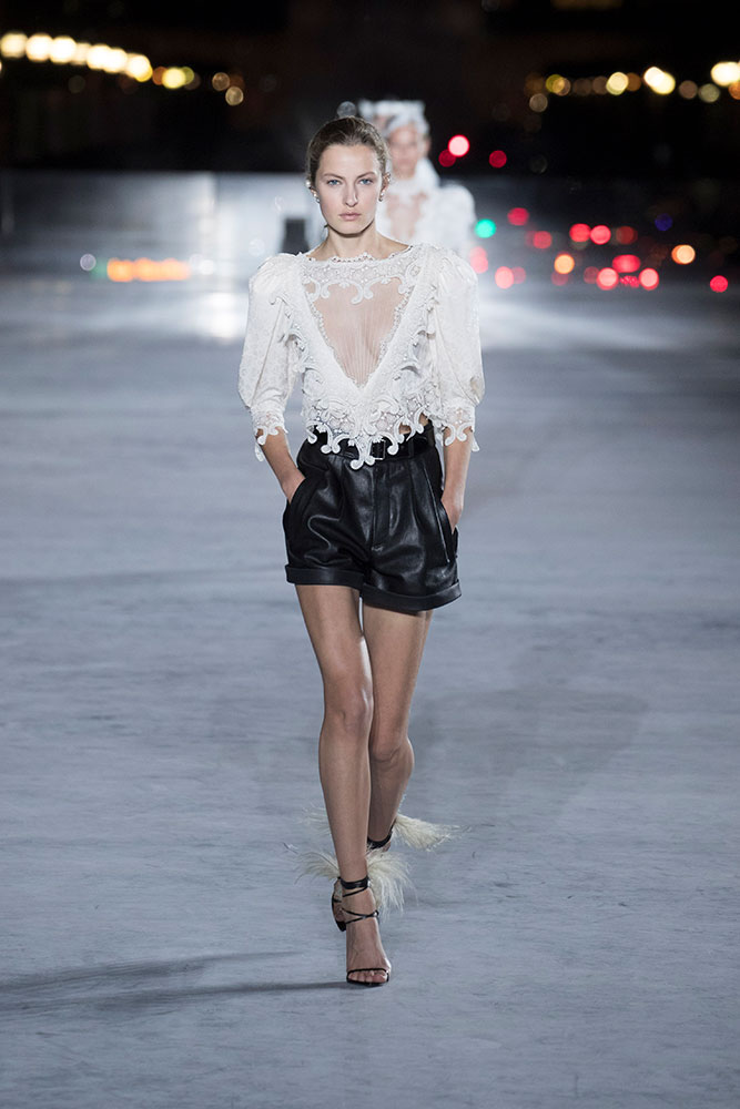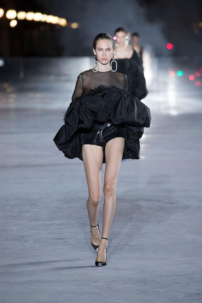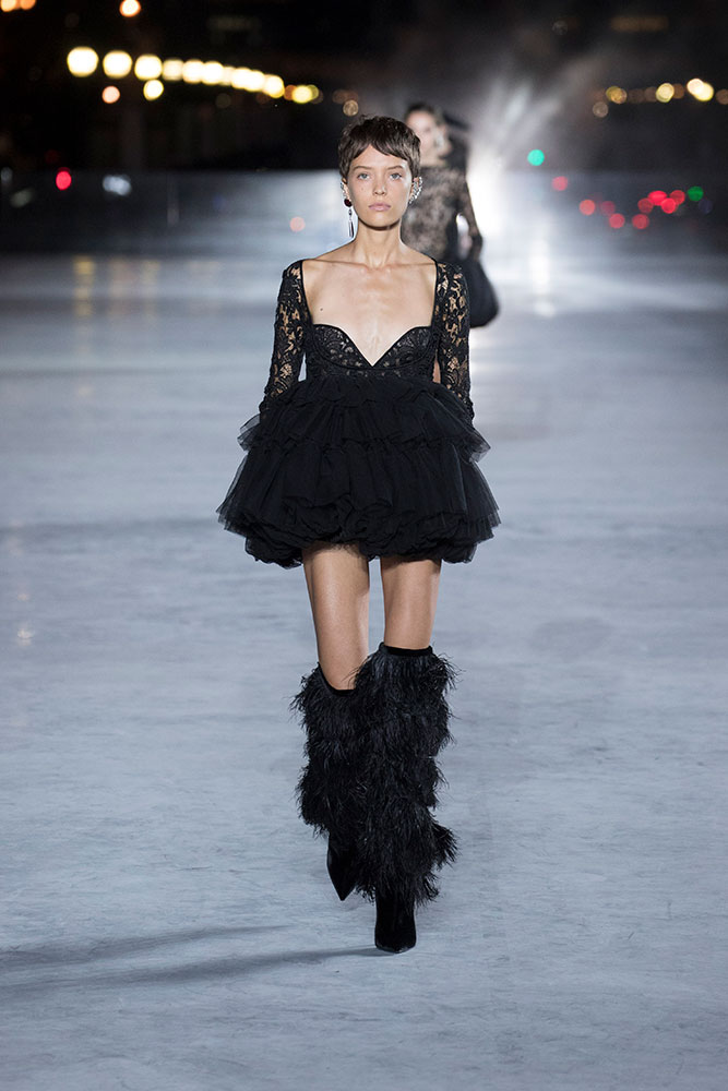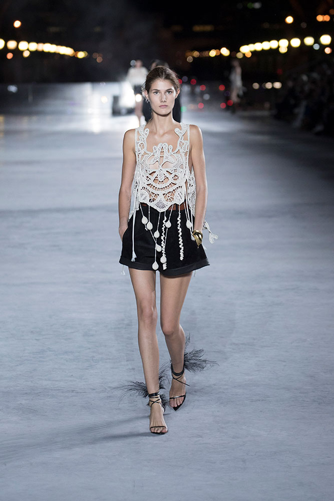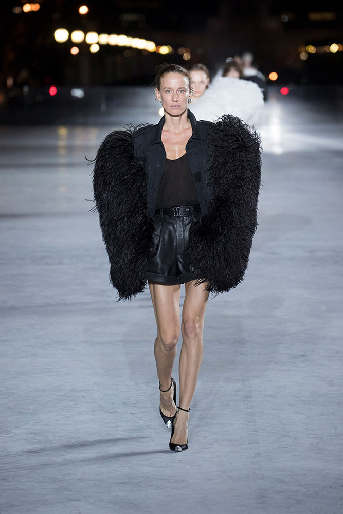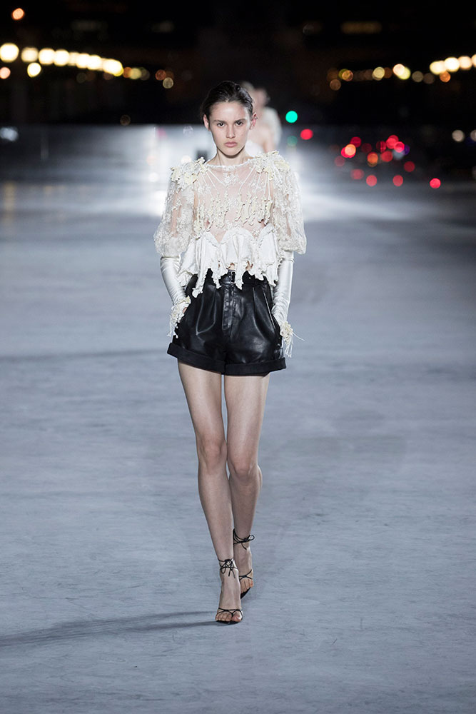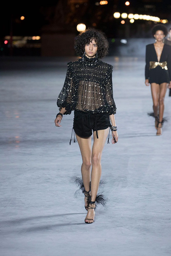 ファーストルックはゴールドトリミングの黒ジャケットにカーキのショートパンツを合わせている。インナーに着た透けるブラウスのフリルが揺れてエレガントだ。大きく V ネックに開けた量感ブラウス、クチュールテイストのフリルいっぱいのブラウスにもショートパンツを合わせる。白、黒を中心にレース、フェザー、タフタなど Monsieur Yves Saint Laurent (ムッシュ イヴ・サンローラン) のオートクチュールディテールを取り入れたミニドレスが並んだ。