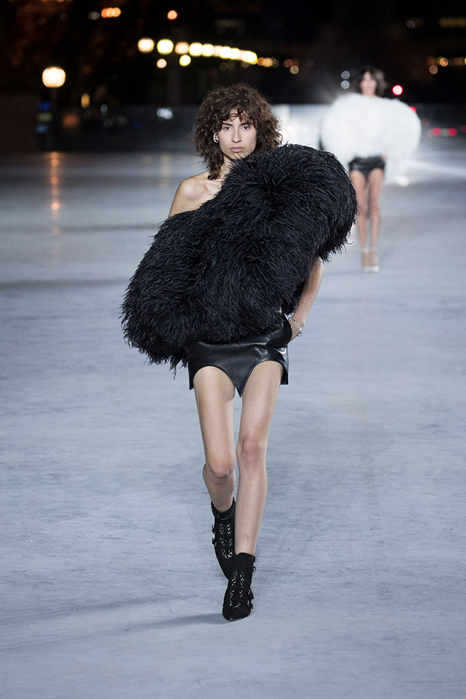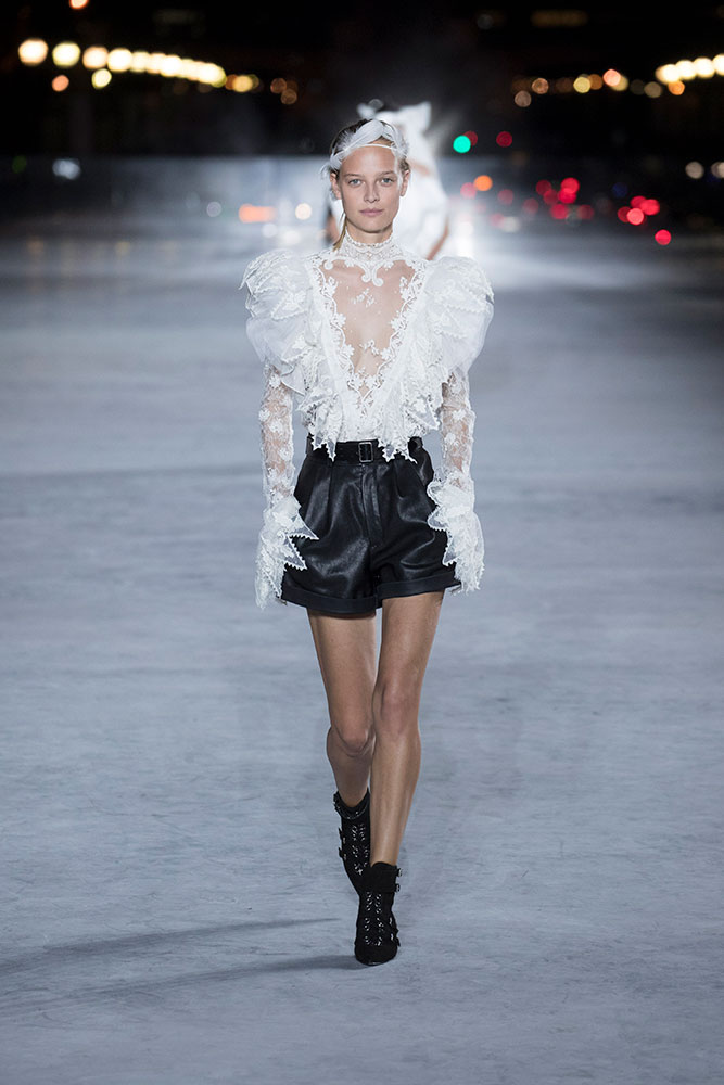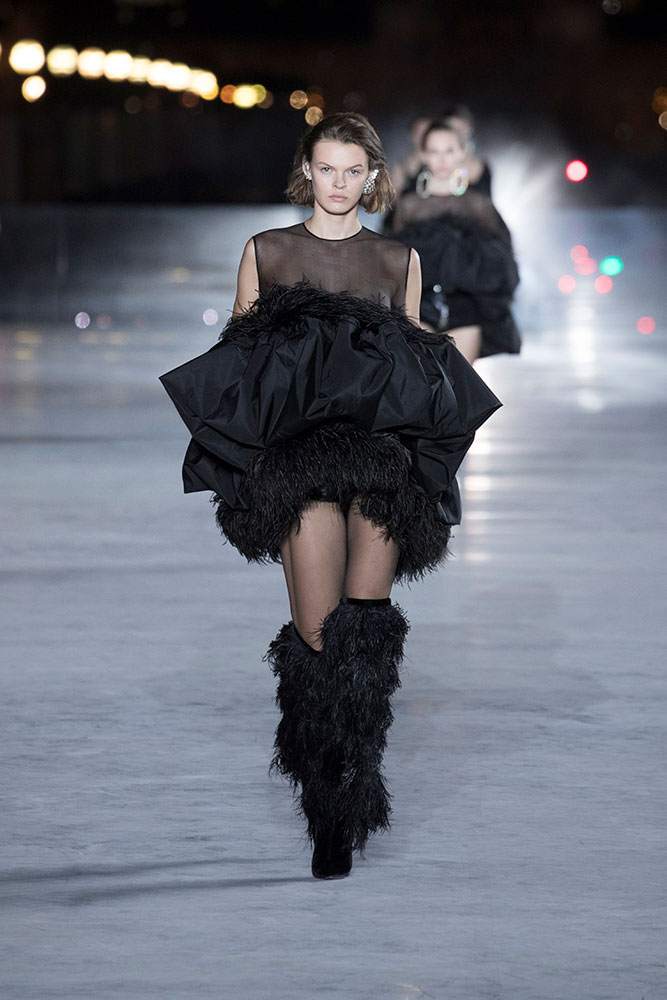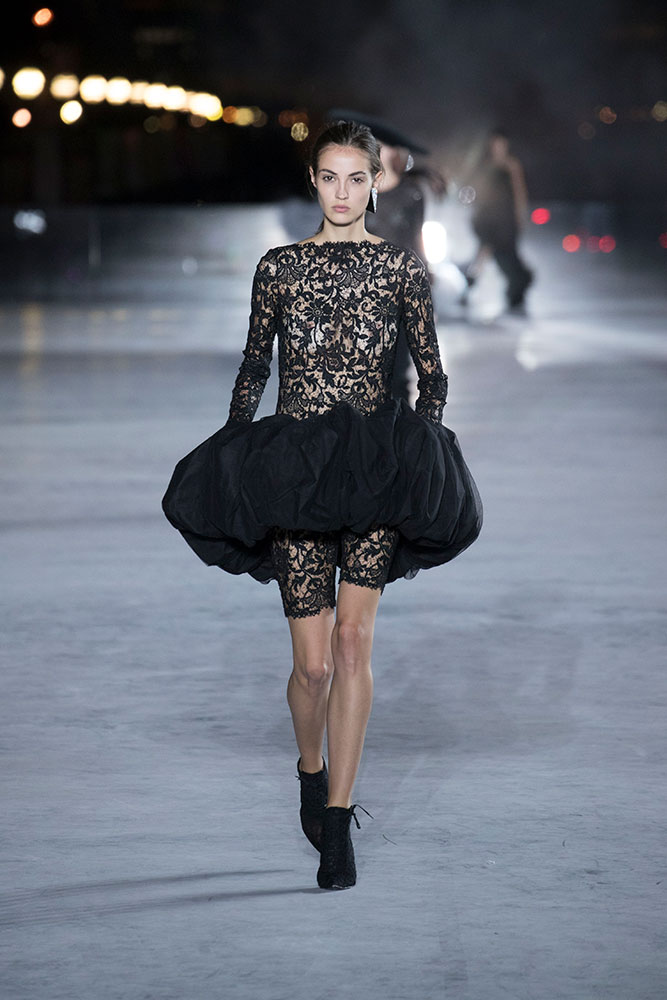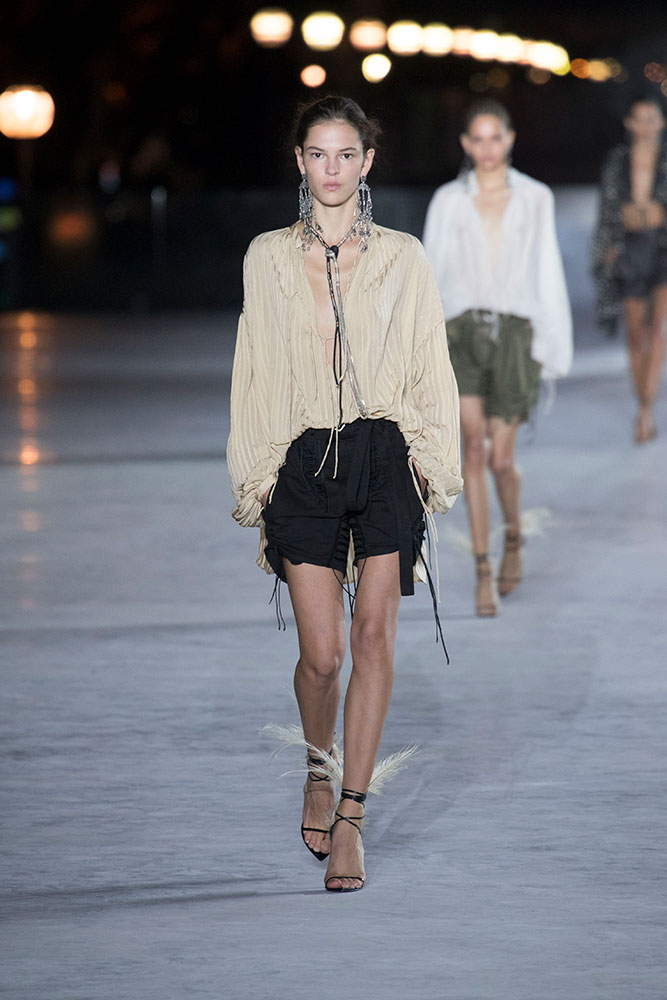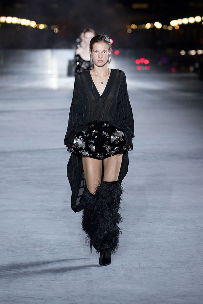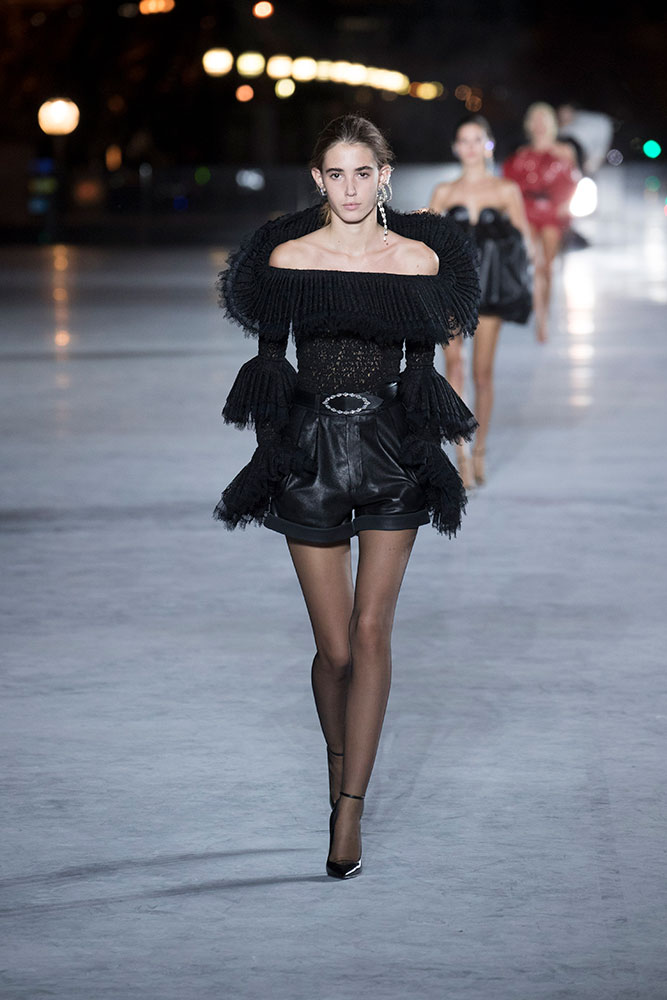 ファーストルックはゴールドトリミングの黒ジャケットにカーキのショートパンツを合わせている。インナーに着た透けるブラウスのフリルが揺れてエレガントだ。大きく V ネックに開けた量感ブラウス、クチュールテイストのフリルいっぱいのブラウスにもショートパンツを合わせる。白、黒を中心にレース、フェザー、タフタなど Monsieur Yves Saint Laurent (ムッシュ イヴ・サンローラン) のオートクチュールディテールを取り入れたミニドレスが並んだ。
