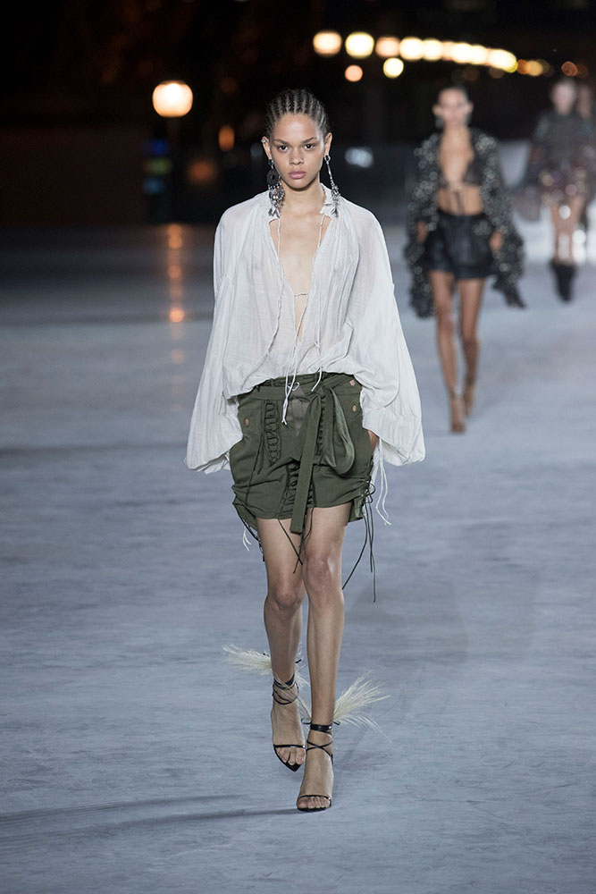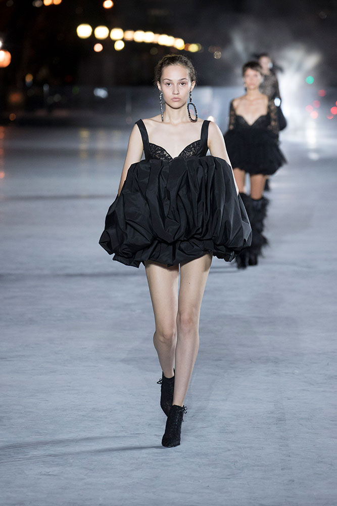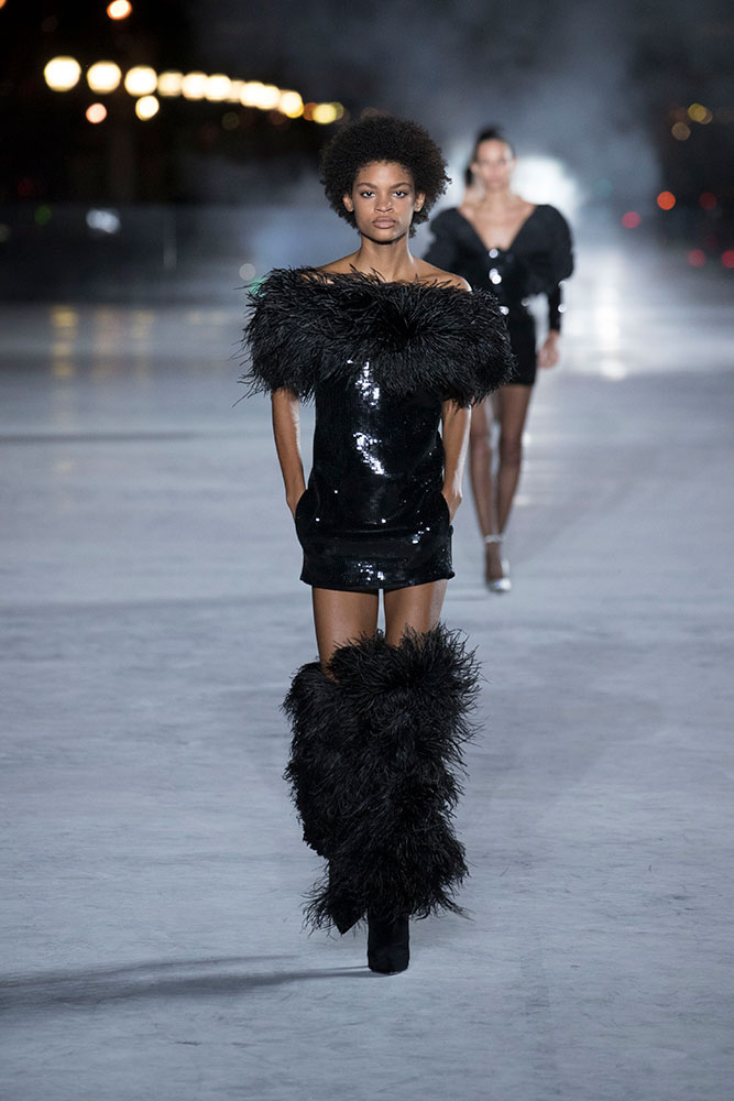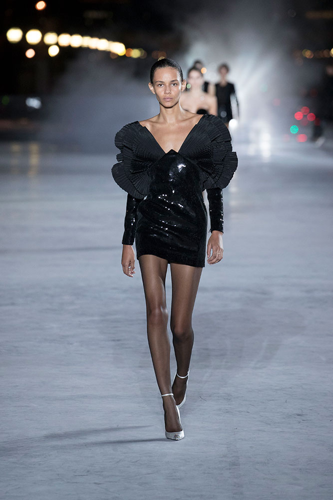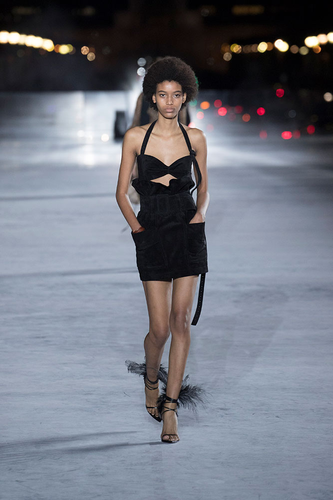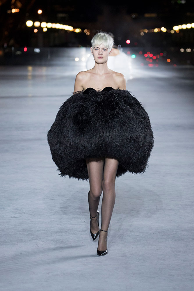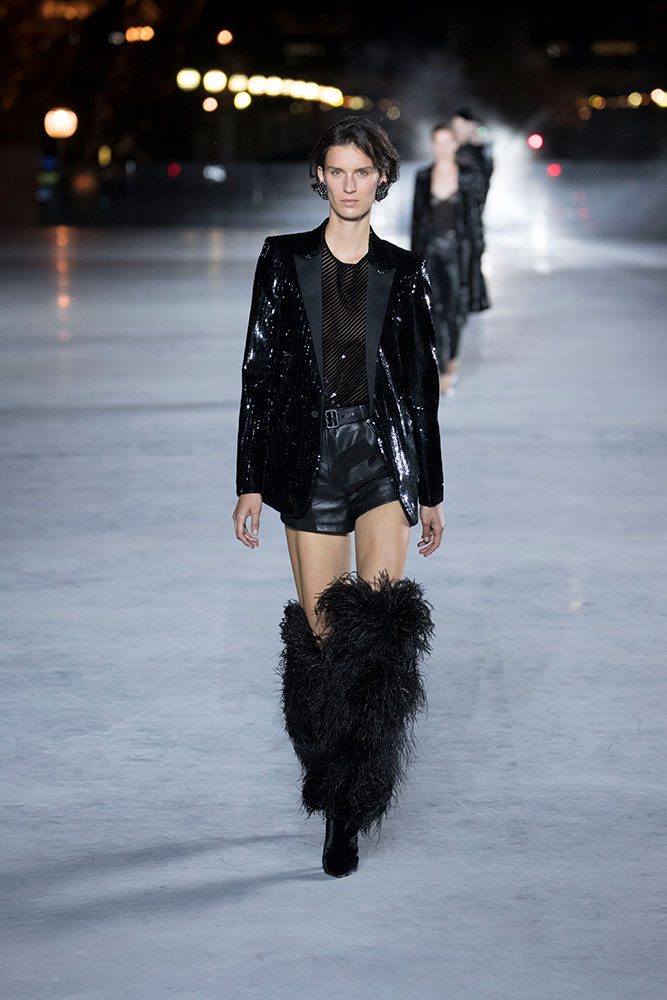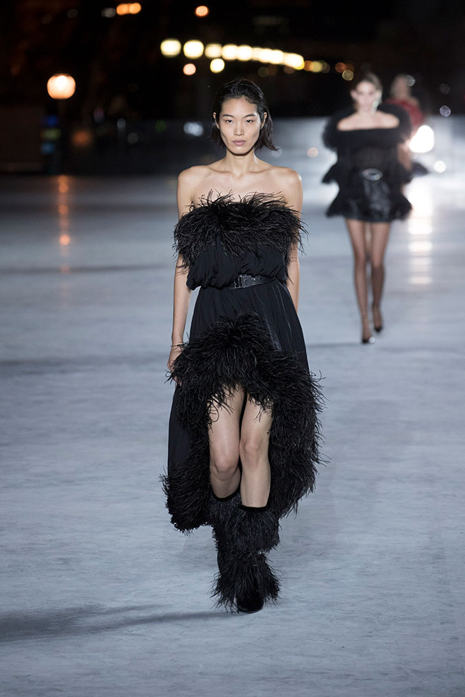 ファーストルックはゴールドトリミングの黒ジャケットにカーキのショートパンツを合わせている。インナーに着た透けるブラウスのフリルが揺れてエレガントだ。大きく V ネックに開けた量感ブラウス、クチュールテイストのフリルいっぱいのブラウスにもショートパンツを合わせる。白、黒を中心にレース、フェザー、タフタなど Monsieur Yves Saint Laurent (ムッシュ イヴ・サンローラン) のオートクチュールディテールを取り入れたミニドレスが並んだ。