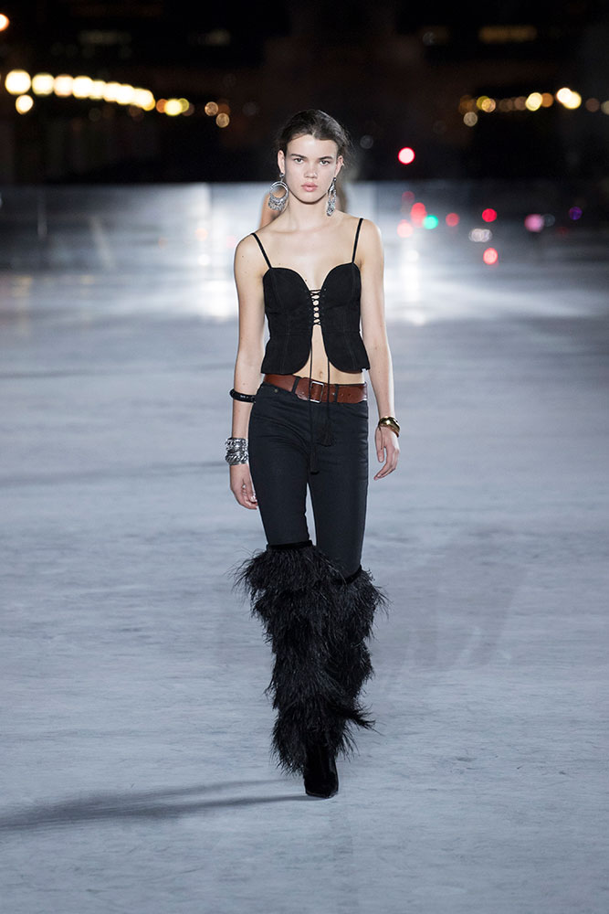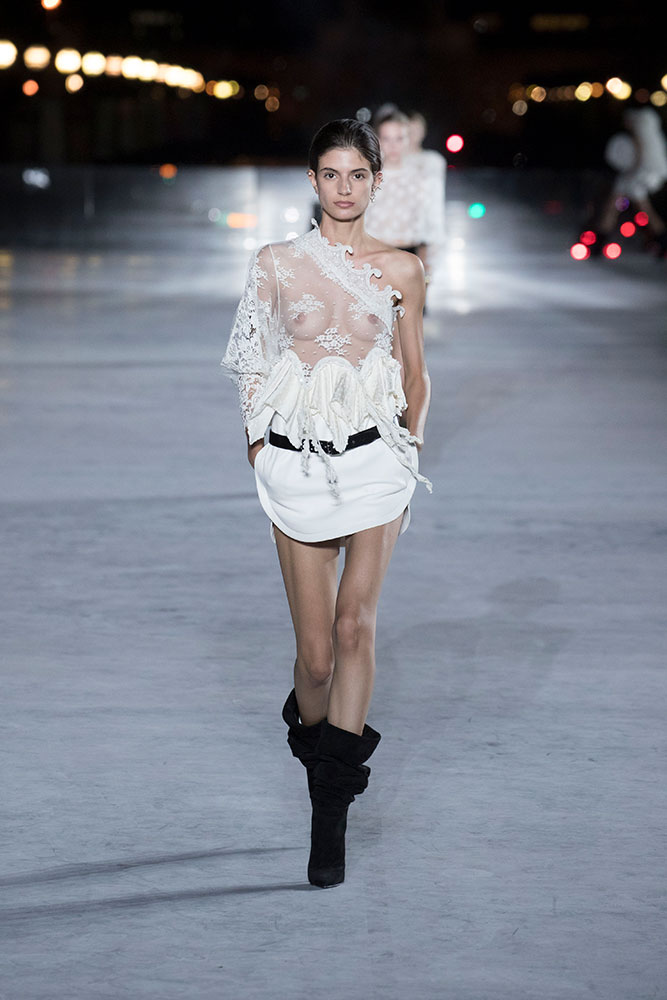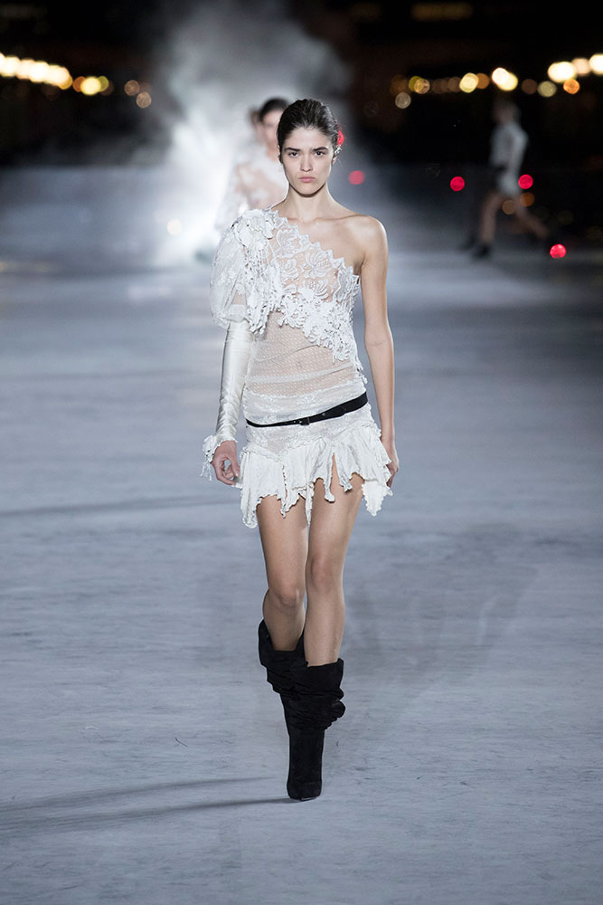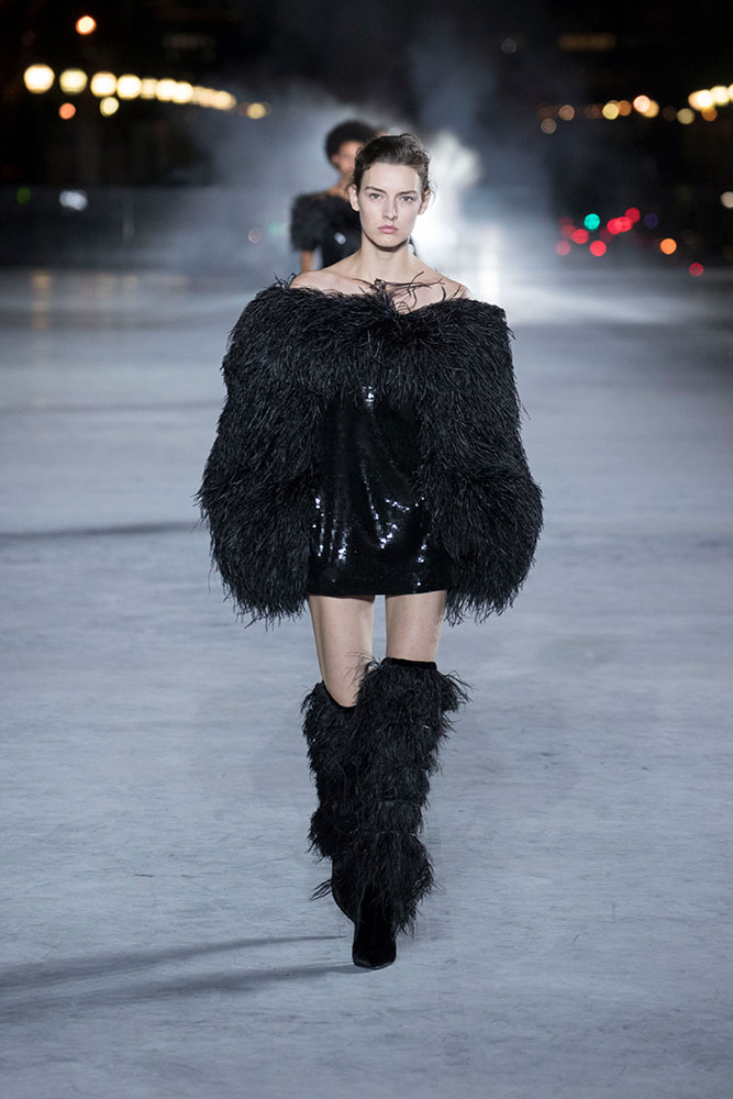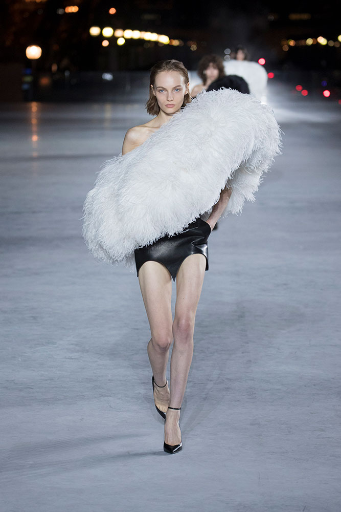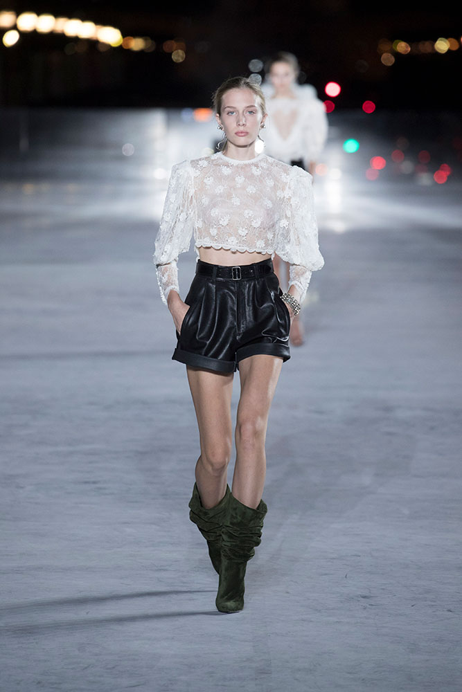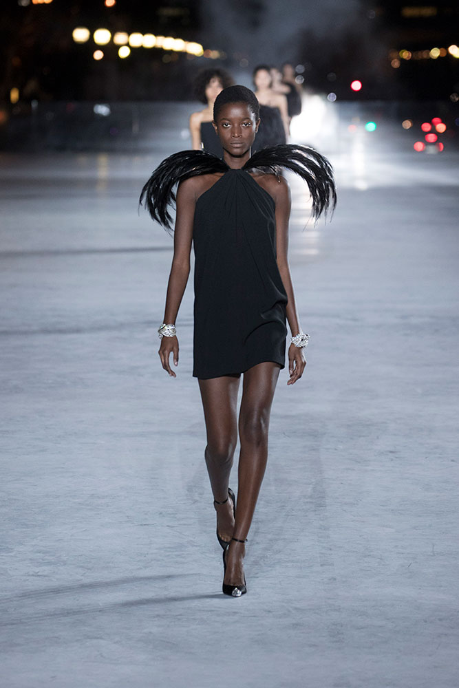 ファーストルックはゴールドトリミングの黒ジャケットにカーキのショートパンツを合わせている。インナーに着た透けるブラウスのフリルが揺れてエレガントだ。大きく V ネックに開けた量感ブラウス、クチュールテイストのフリルいっぱいのブラウスにもショートパンツを合わせる。白、黒を中心にレース、フェザー、タフタなど Monsieur Yves Saint Laurent (ムッシュ イヴ・サンローラン) のオートクチュールディテールを取り入れたミニドレスが並んだ。