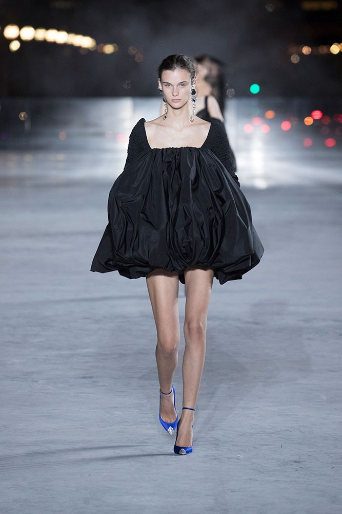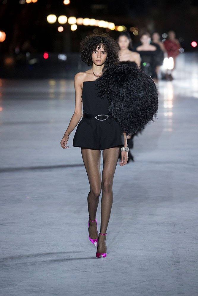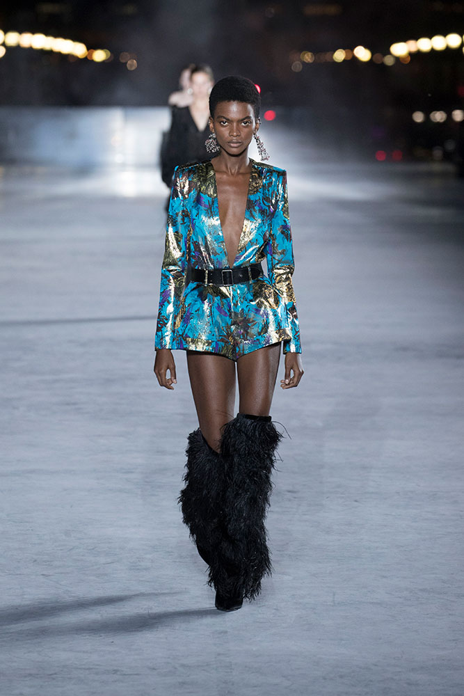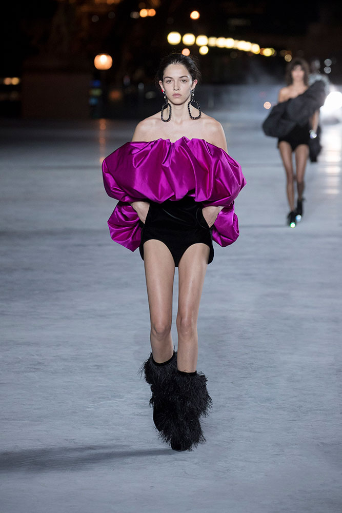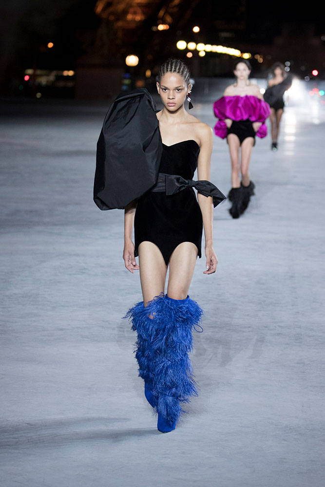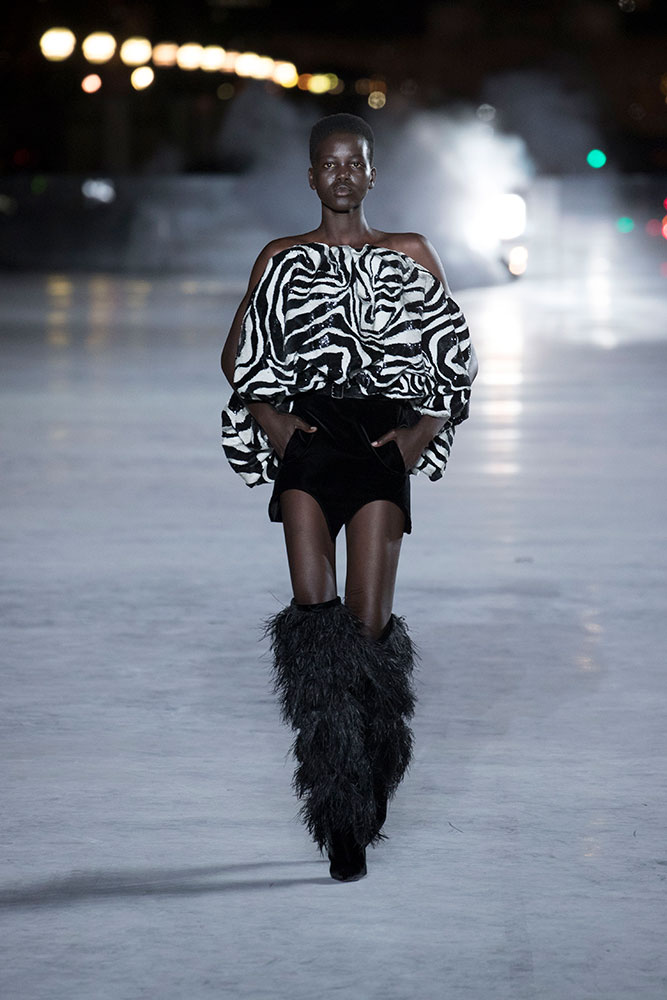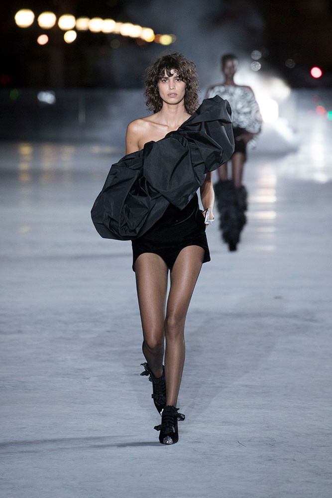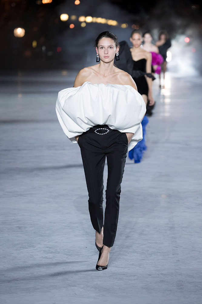 アニマル、ゼブラ柄などのアイコンを取り入れたサテンのテーラード、スペンサージャケットはペンシルパンツと合わせている。ワンショルダーや胸にタフタでギャザーを寄せたバルーンディテールにはフューシャ、ブルーなど色を加えている。Monsieur Yves Saint Laurent のアイコンに Anthony Vaccarello (アンソニー・ヴァカレロ) のデストロイディテールが加わり、リアルに、エレガントに収められている。