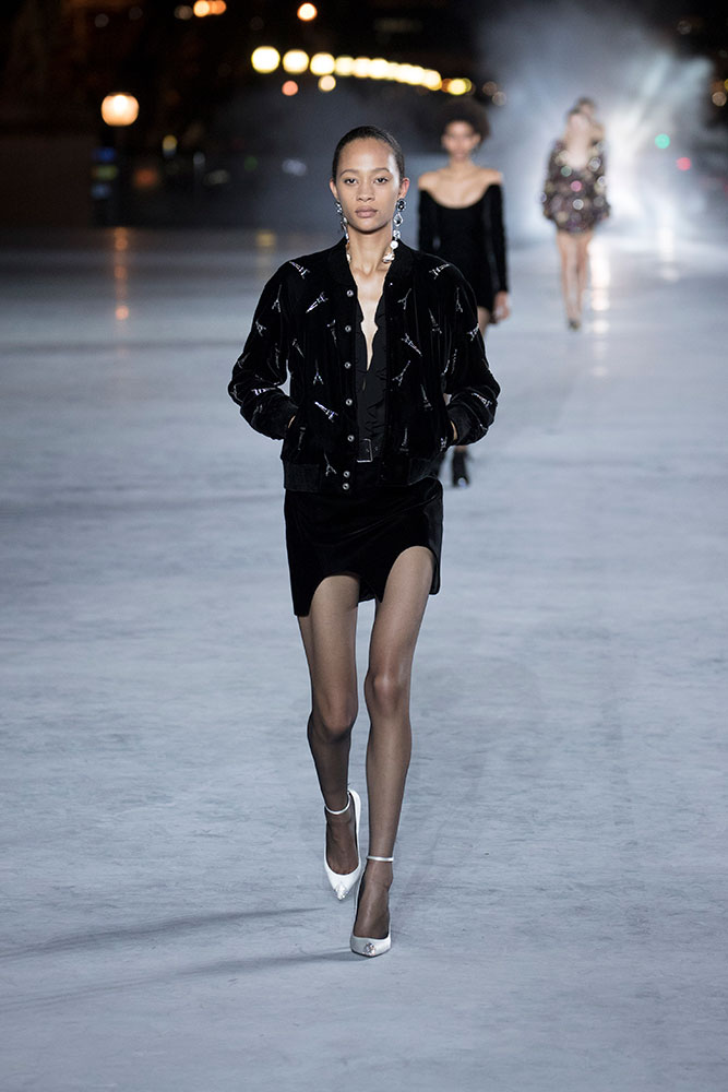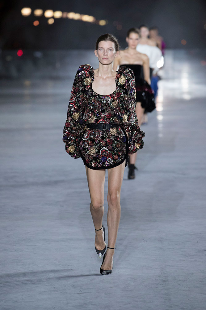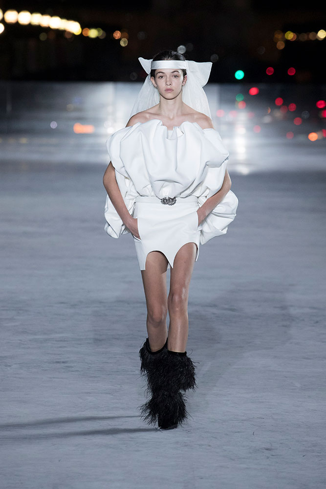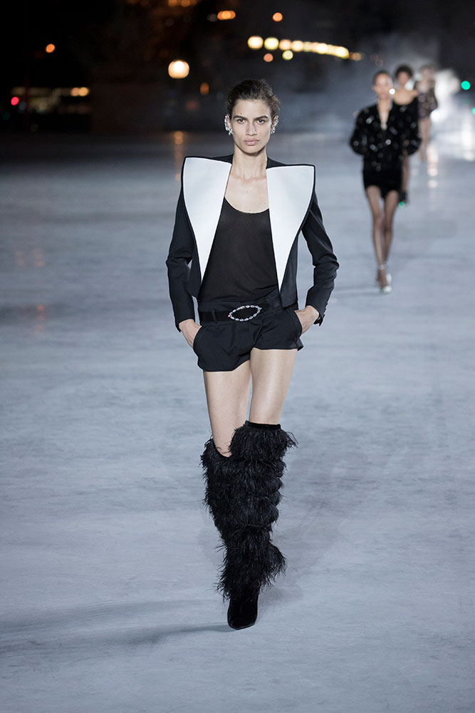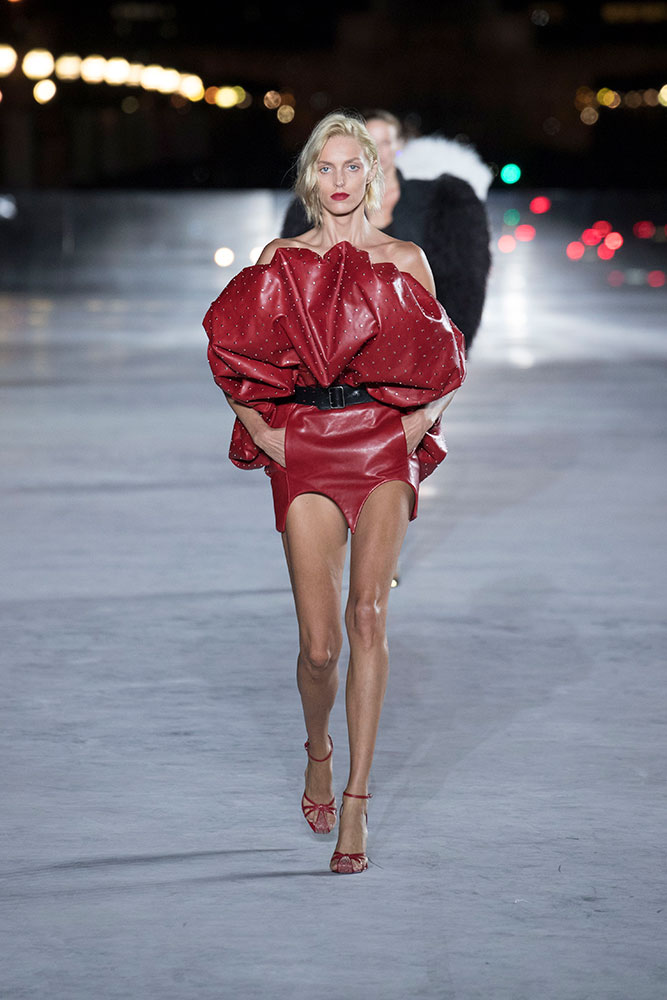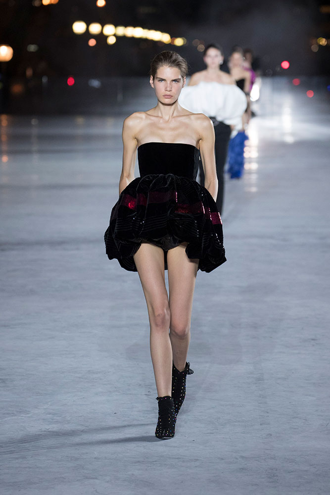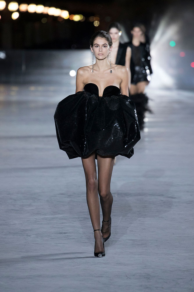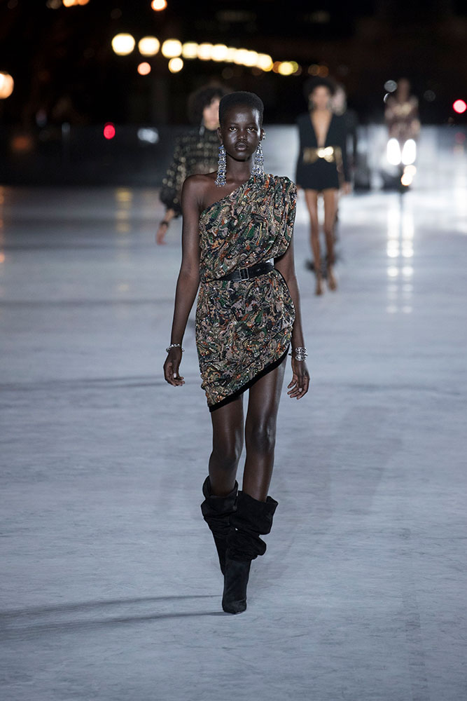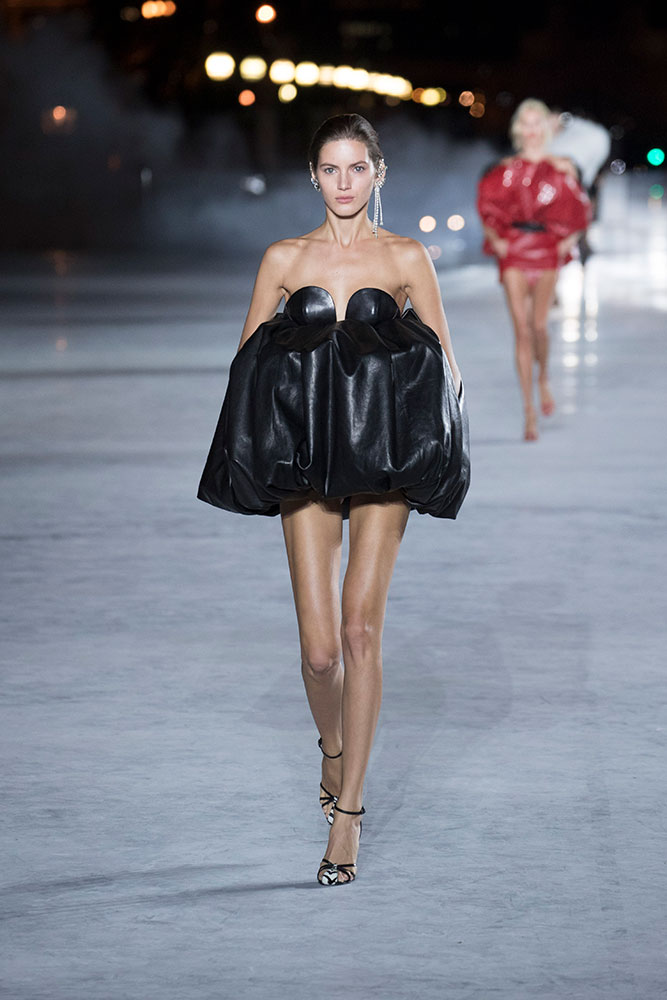 アニマル、ゼブラ柄などのアイコンを取り入れたサテンのテーラード、スペンサージャケットはペンシルパンツと合わせている。ワンショルダーや胸にタフタでギャザーを寄せたバルーンディテールにはフューシャ、ブルーなど色を加えている。Monsieur Yves Saint Laurent のアイコンに Anthony Vaccarello (アンソニー・ヴァカレロ) のデストロイディテールが加わり、リアルに、エレガントに収められている。
