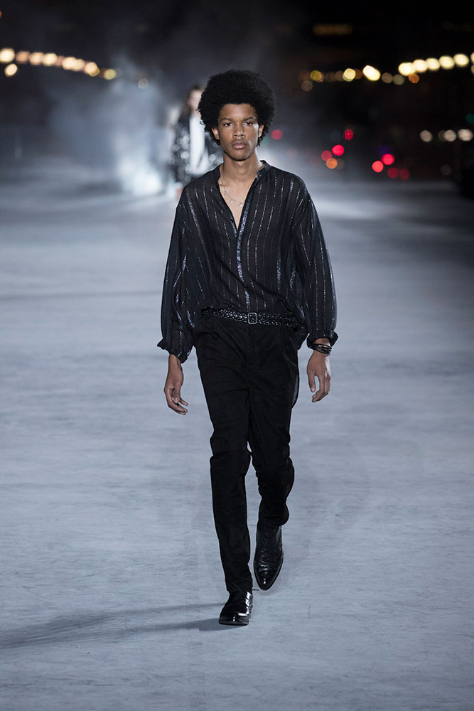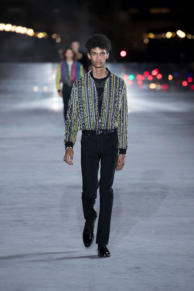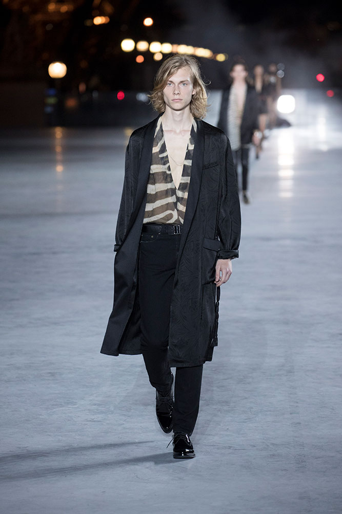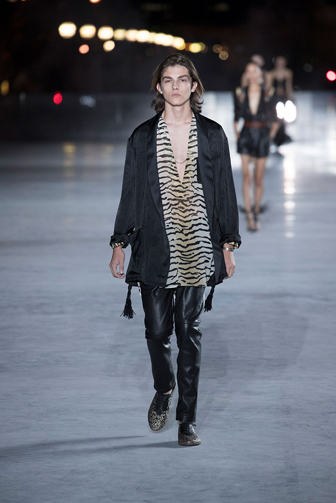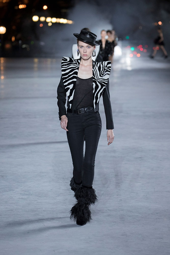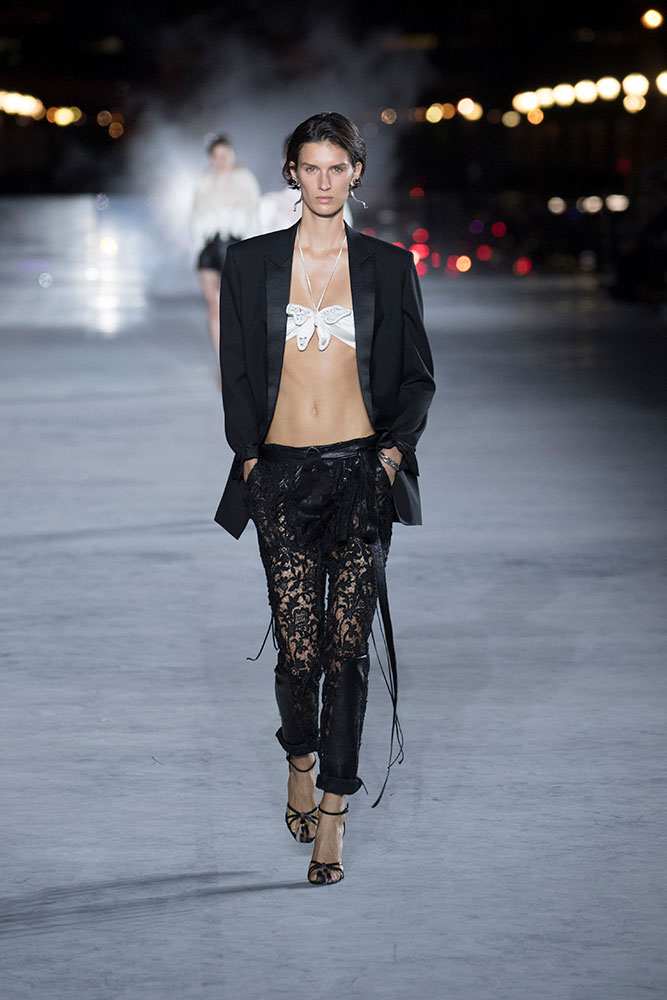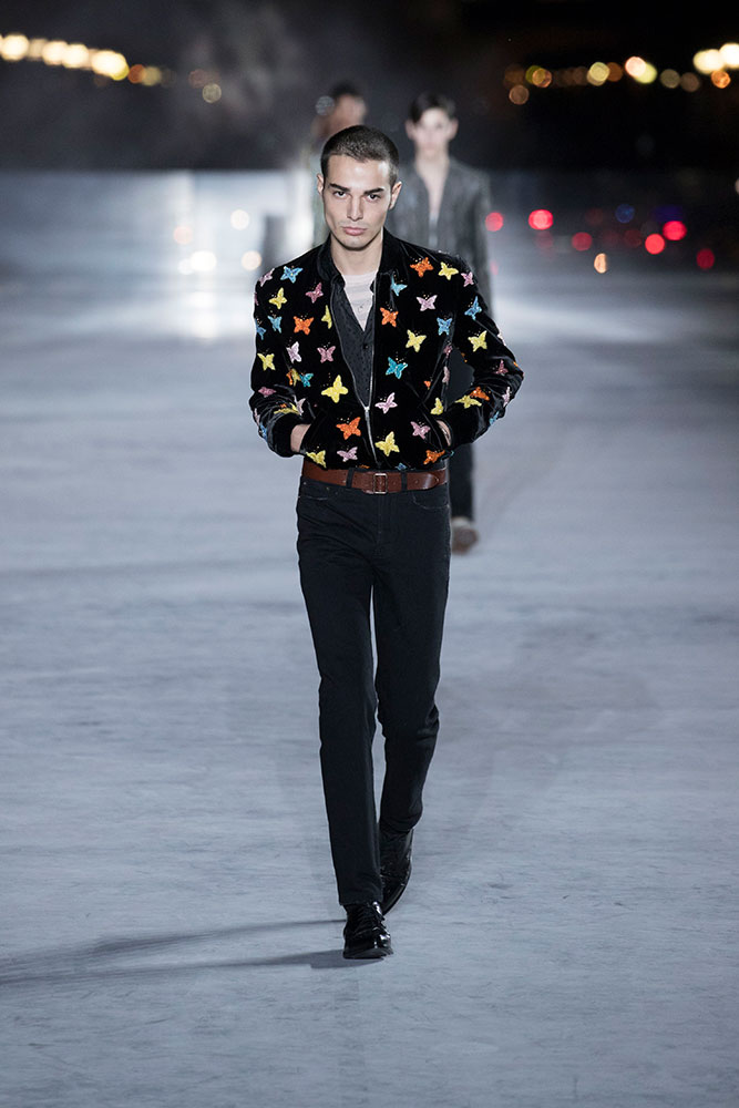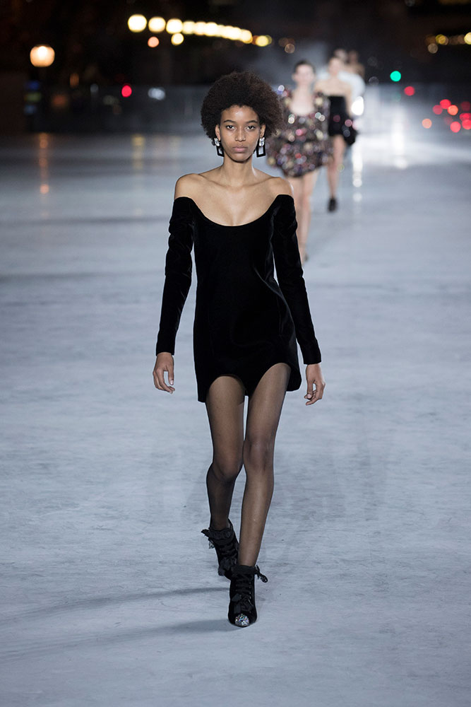 アニマル、ゼブラ柄などのアイコンを取り入れたサテンのテーラード、スペンサージャケットはペンシルパンツと合わせている。ワンショルダーや胸にタフタでギャザーを寄せたバルーンディテールにはフューシャ、ブルーなど色を加えている。Monsieur Yves Saint Laurent のアイコンに Anthony Vaccarello (アンソニー・ヴァカレロ) のデストロイディテールが加わり、リアルに、エレガントに収められている。