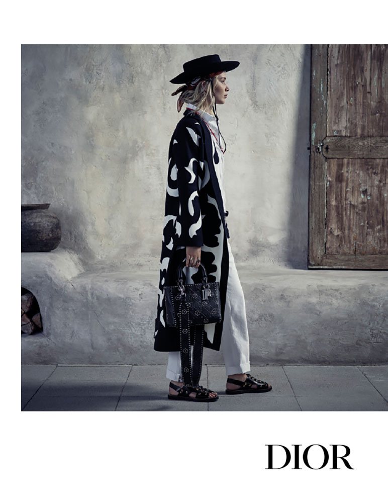 砂漠や荒野の花々を想わせるフラワーモチーフのロングドレスやロングベストにチャームネックレスを合わせたルックや、リラックスしたスタイルへと再解釈された「バー」ジャケットに白いシャツとパンツを組み合わせて。頭に結んだスカーフとのレイヤードで魅せるハットスタイルは、Stephen Jones (スティーブン・ジョーンズ) によるもの。装いを完成させるのは、もちろん「J’ADIOR」や「レディ ディオール」といったアイコニックなバッグ。オーガニックな素材や装飾や、ネイティブアメリカンのクラフツマンシップに着用を得たショルダーストラップが印象的な新作の登場が待ち遠しい。2018年クルーズ コレクションは10月下旬より順次展開を予定している。