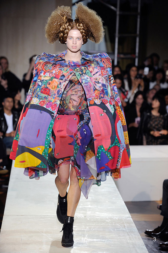 Comme des Garçons (コム デ ギャルソン) は「マルチディメンショナル・グラフィティ」をイメージしたコレクションを発表した。9月までメトロポリタン美術館で “服はアートか” を問いかけた川久保玲の展覧会が開催されていた。2018年SSコレクションでは誰もが見たことのあるアート作品を、3次元、4次元の服に変化させた。イタリアの名画や日本の漫画など時代や国を越えて受け継がれている2次元の世界は解体され、コラージュされた。それは飛び出すアートのように、絵が持つ存在感以上の迫力を感じさせる。