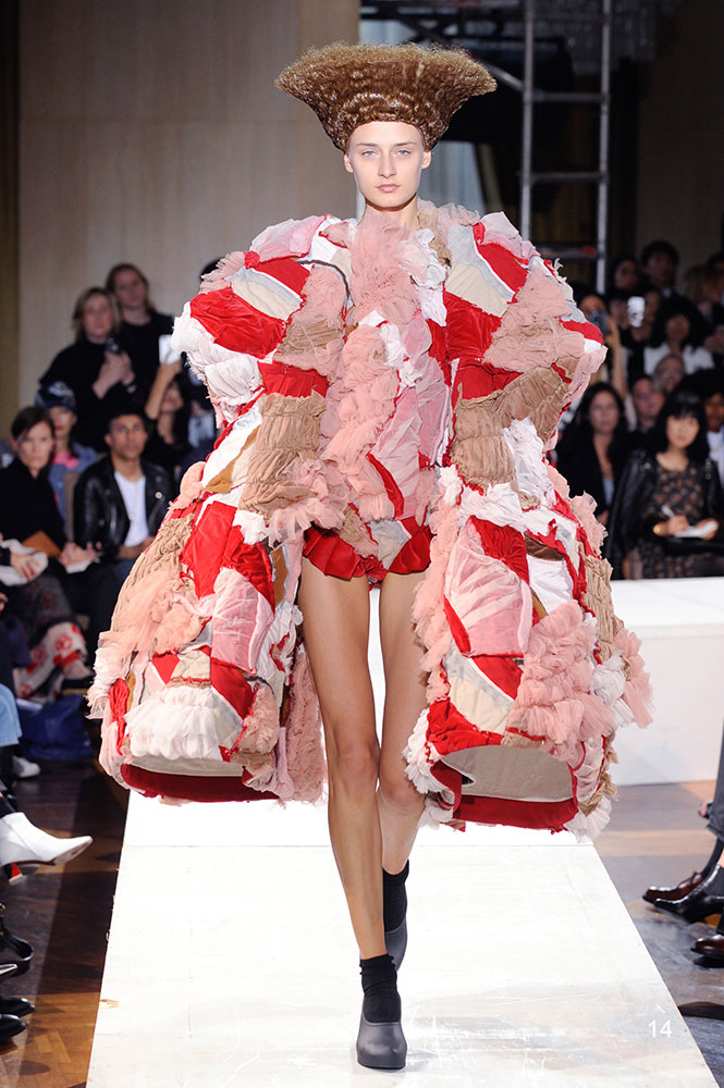 大きく広げたバルーンドレスは柄が重なり、量感が加わりアシンメトリーのヘムはめくれてボディが見え隠れする。銀色の水墨画巨大袖ドレスはボディースを合わせ、未来的なイメージさえする。女の子の顔は逆さになりドットや花柄プリントと接ぎ合わされ着物ガウンのように羽織っている。カタチ、量感、アプローチは違うが全てが新しい挑戦服だ。何枚ものコートを接ぎ合わせたケープ服の背中には天使のような羽が広がる。フィナーレは、たくさんのおもちゃやオブジェをトップスにつけた真っ赤なドレス。どこかキッチュだが、どの作品も新しい服のあり方を提案する強さが残る。